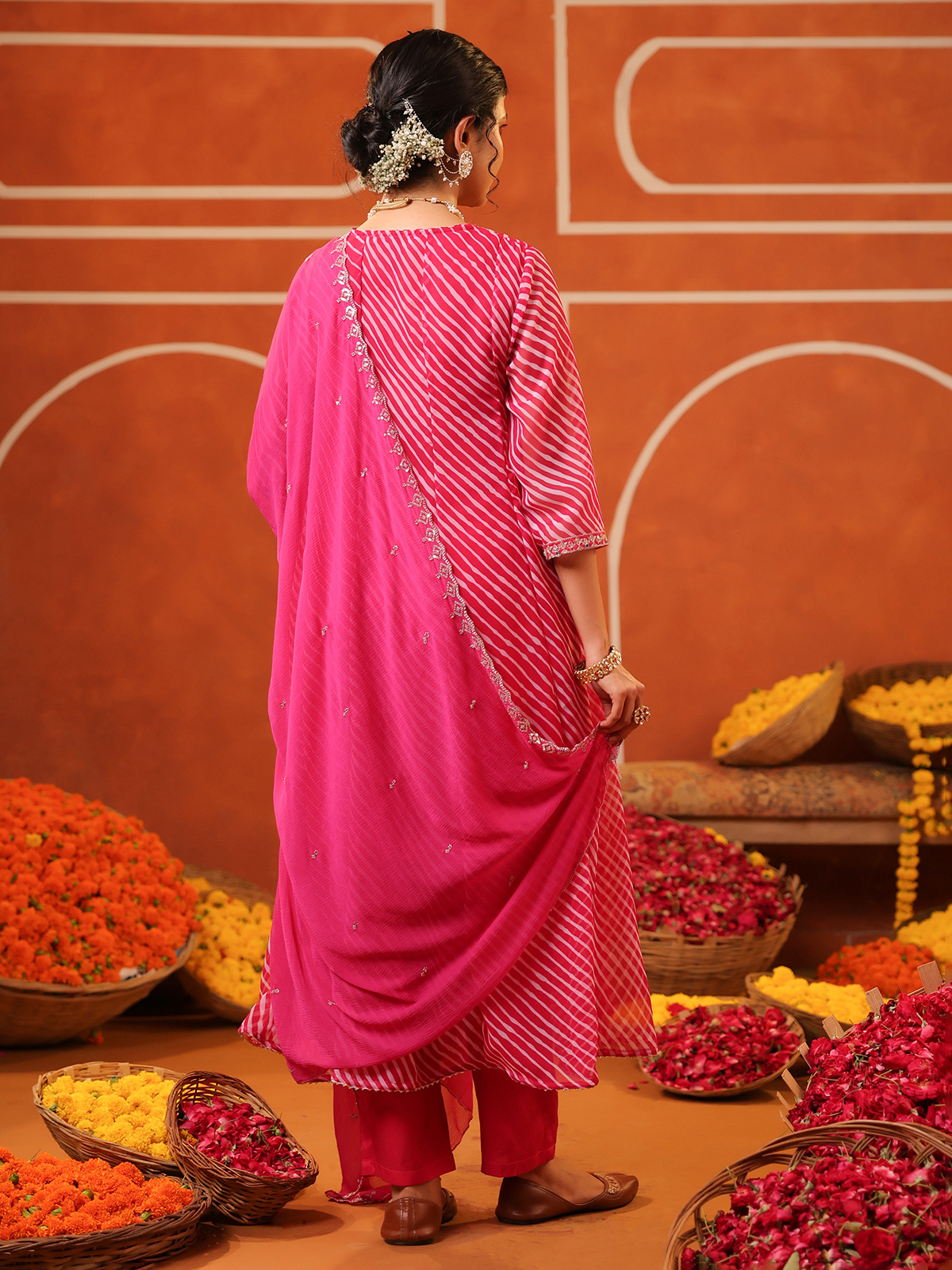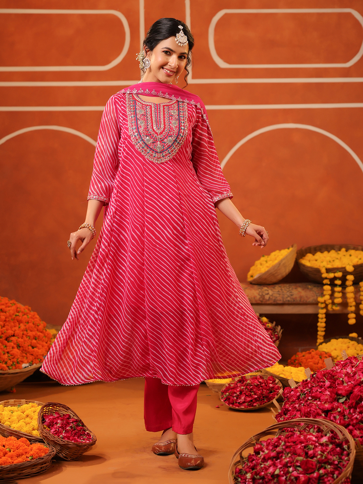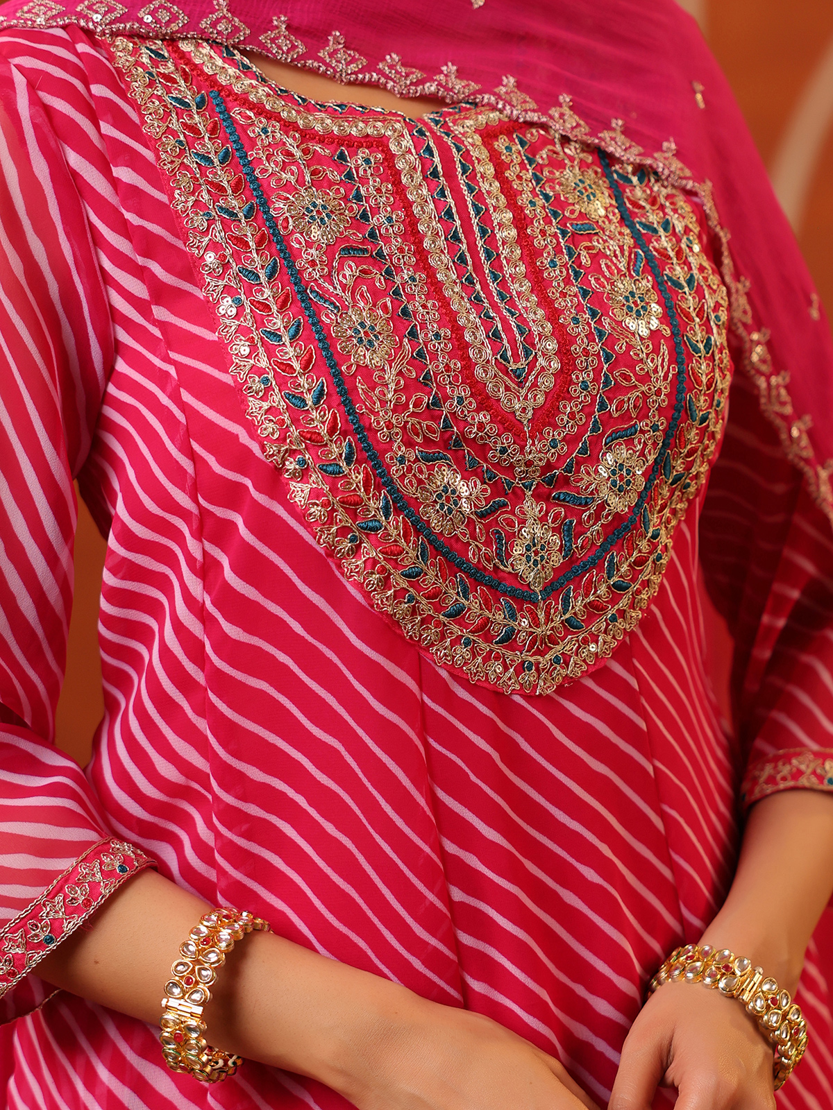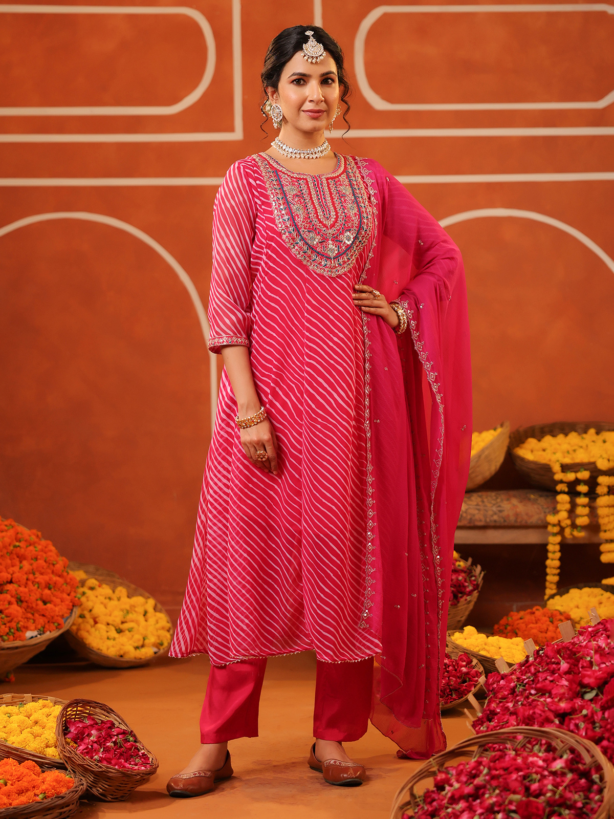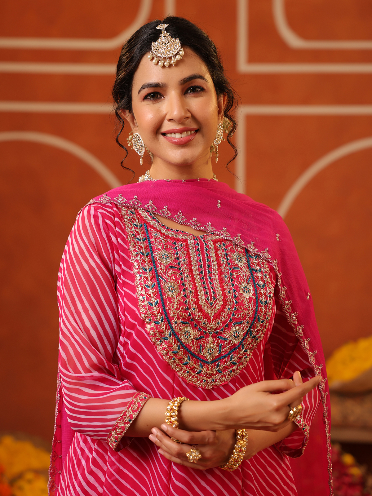 Designed for festive occasions, this pink georgette kurti set is beautifully detailed with embroidery, resham, and sequins. Styled with a round neckline and quarter sleeves, it comes with a pant and dupatta, ensuring an elegant and graceful celebration look.