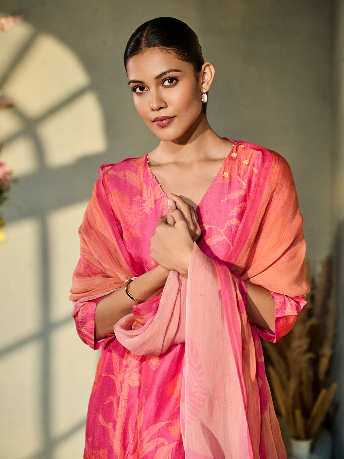 Soft pink printed silk whispers playful elegance. Beads and sequins shimmer delicately, adding lighthearted sparkle. V-neck and quarter sleeves frame the look, paired with pant and flowing dupatta, ideal for festive gatherings and joyful occasions.