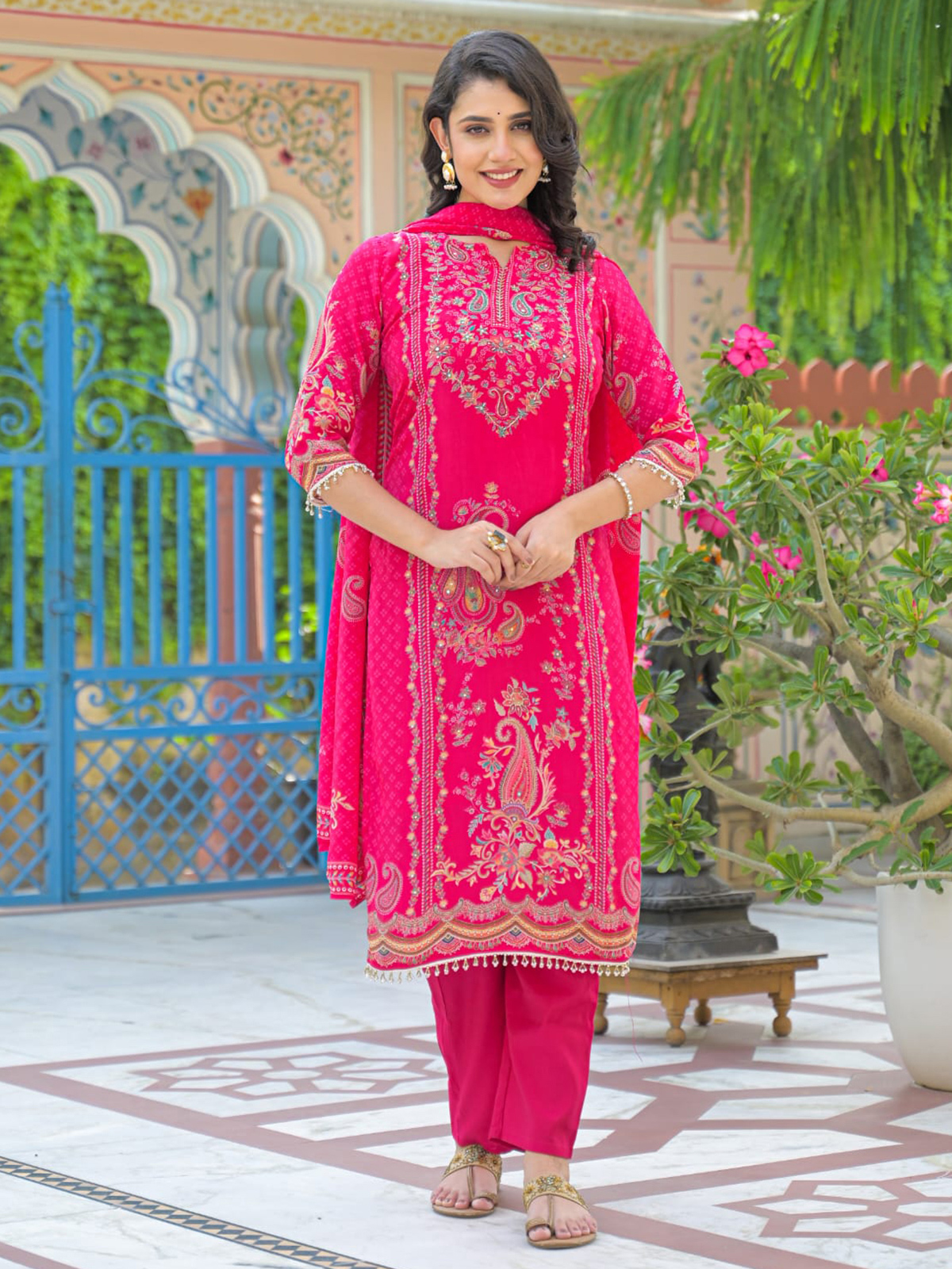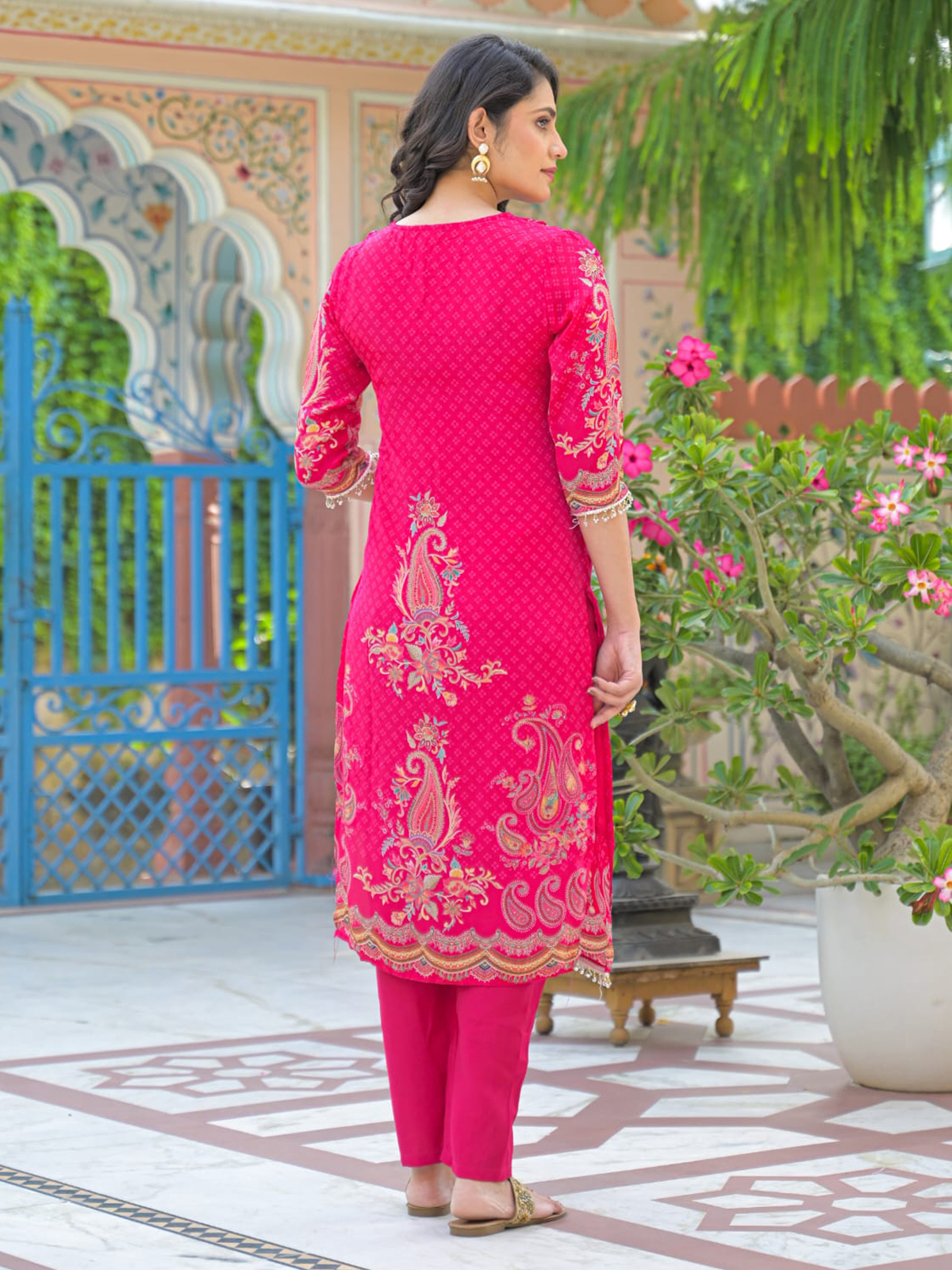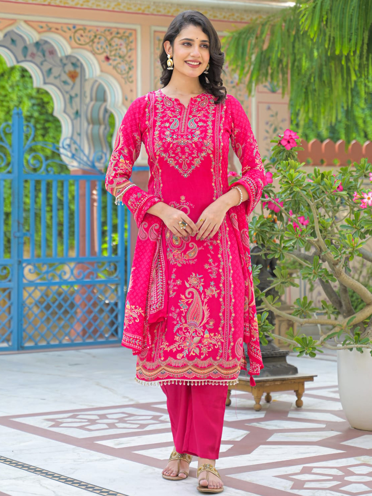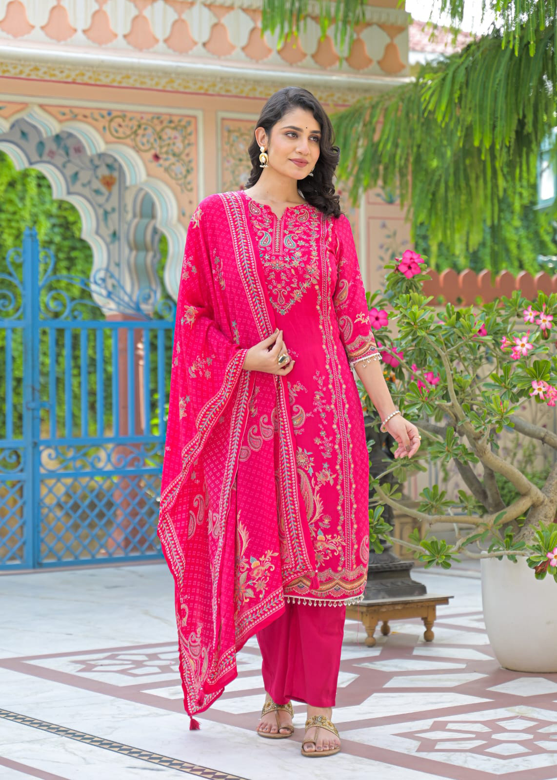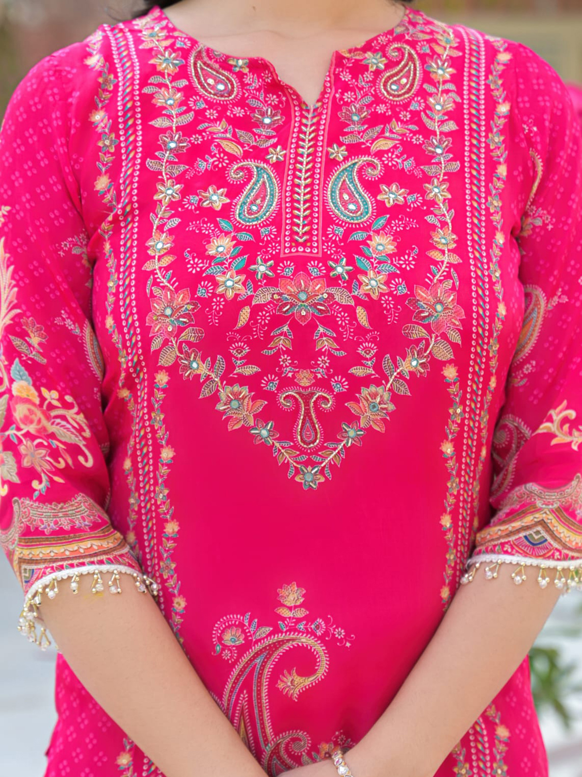 Soft pink silk kurti reflects feminine grace, printed and adorned with sequins, cutdana, and beads twinkling like constellations in twilight. Designed with quarter sleeves, it pairs with pant and graceful dupatta, perfect for festive gatherings and joyful celebrations touched with poise and radiant artistry.