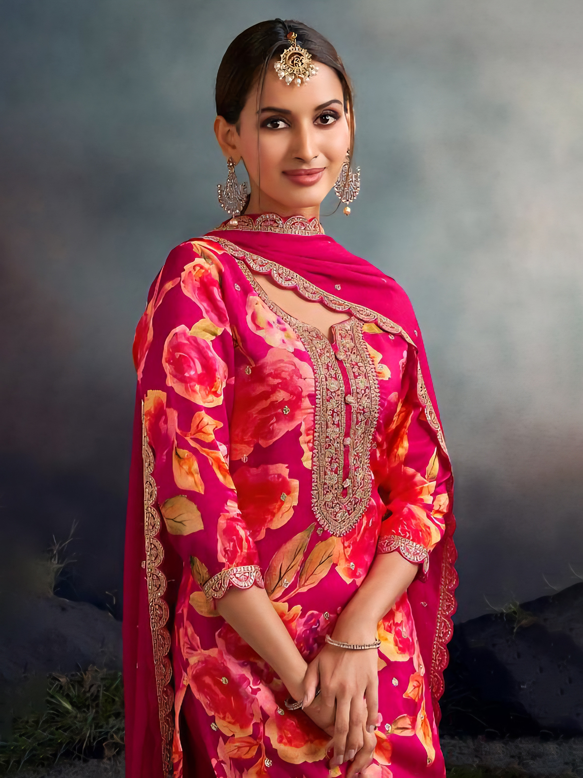 Celebrate elegance in this pink silk palazzo kurti set. Beautifully styled with floral print and enriched by cutdana, sequins and beads work. The sweetheart neckline with quarter sleeves adds refinement. While the palazzo and dupatta complete the ensemble. Perfect for festive evenings or wedding occasions where tradition meets modern allure.