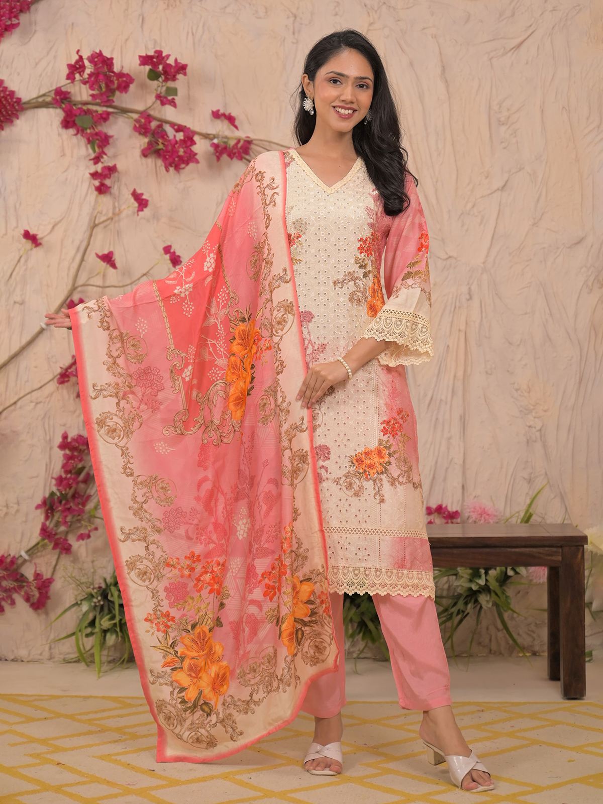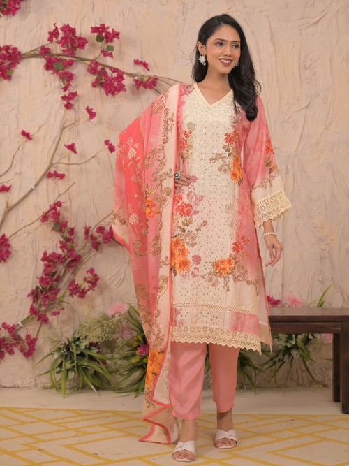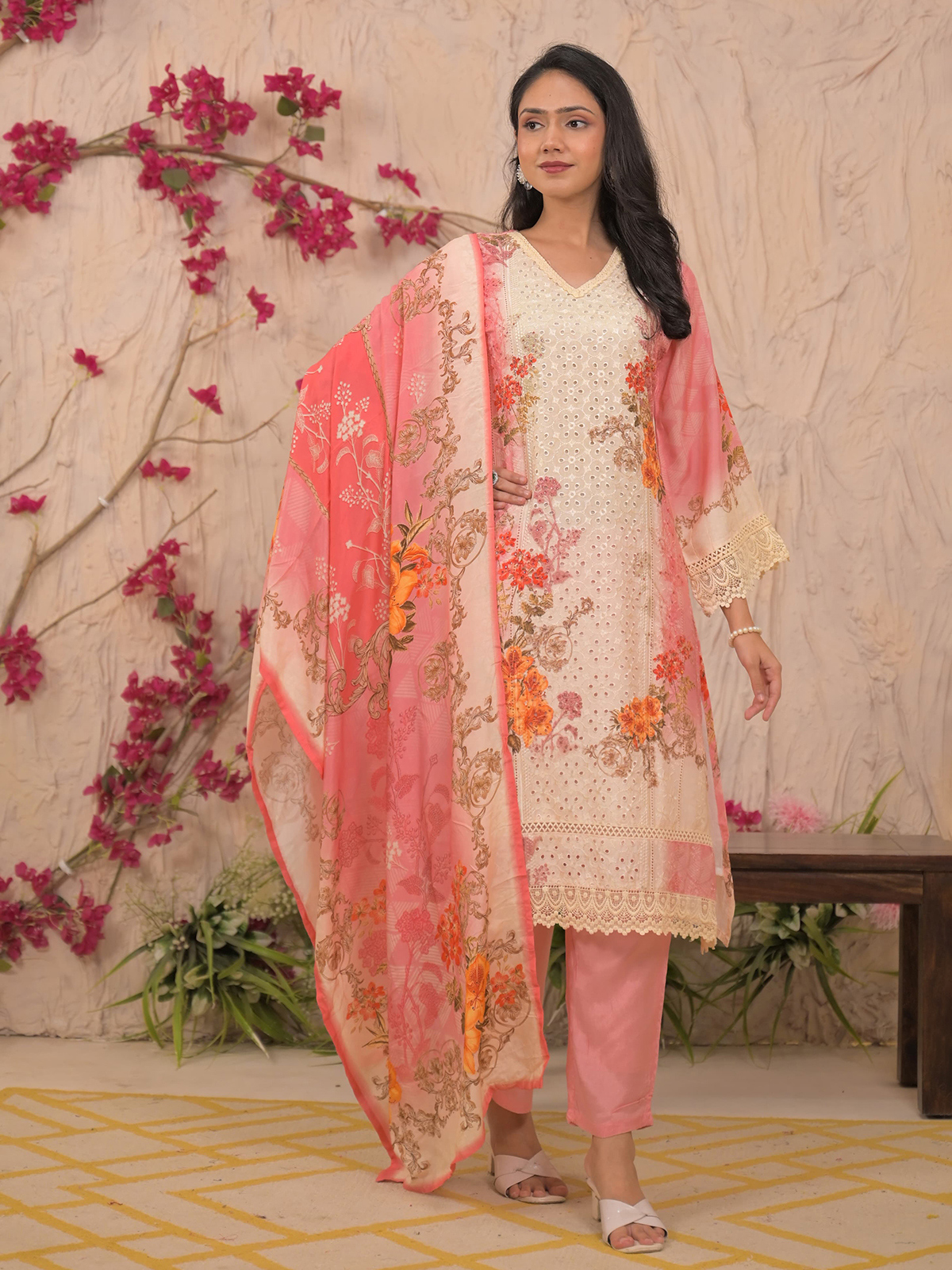 A rich pink cotton silk kurti set with detailed cutdana, stone, zari, sequins, and thread embroidery. The V-neck and quarter sleeves add to its refined silhouette. Paired with pant and dupatta ideal for wedding festivities or grand celebrations.