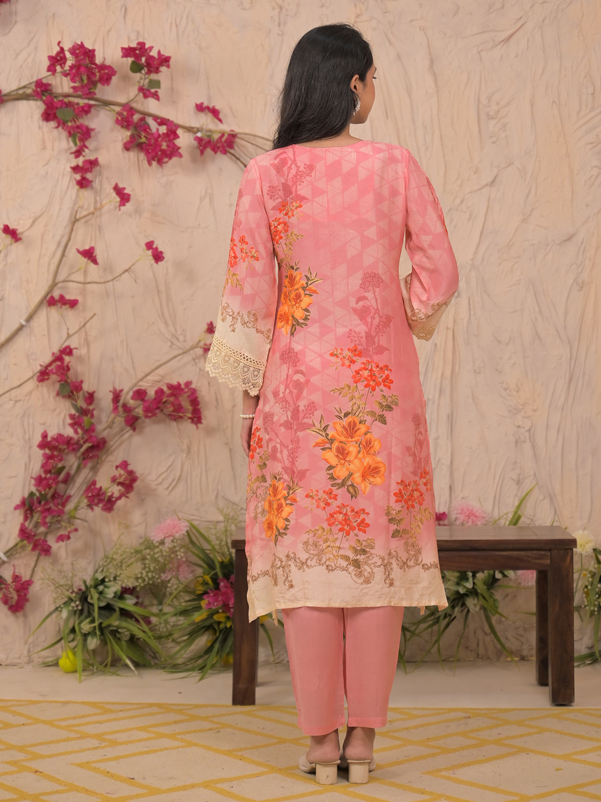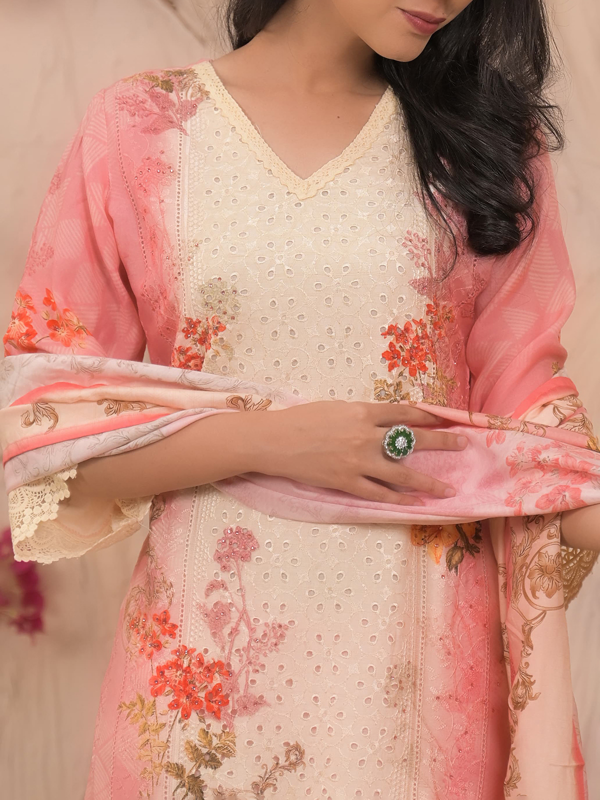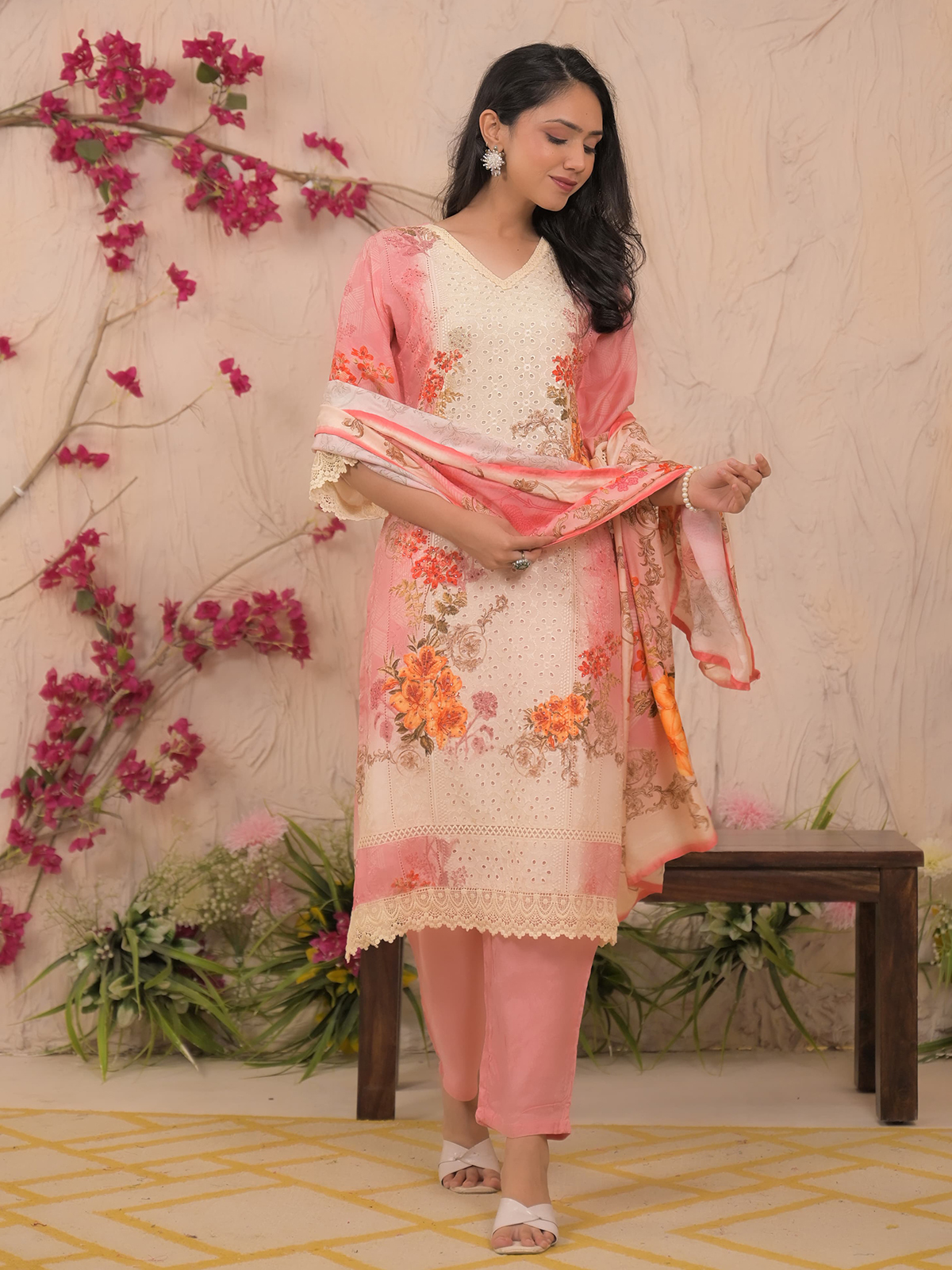 A rich pink cotton silk kurti set with detailed cutdana, stone, zari, sequins, and thread embroidery. The V-neck and quarter sleeves add to its refined silhouette. Paired with pant and dupatta ideal for wedding festivities or grand celebrations.