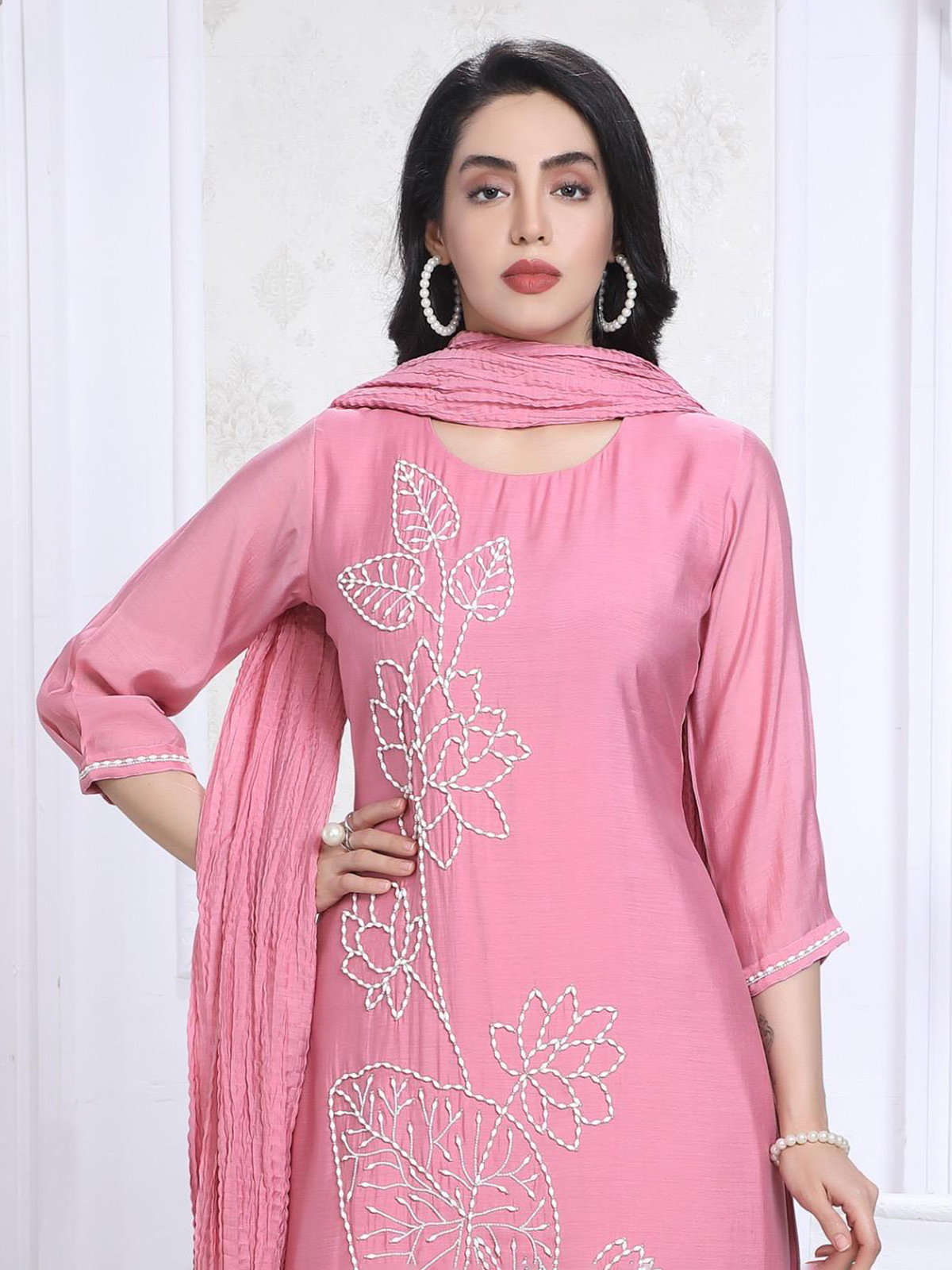 Crafted in rich pink silk straight cut kurti set is adorned with refined thread detailing. Designed with a round neckline and quarter sleeves, it comes with coordinated pants and a dupatta. Ideal for festive gatherings, family functions and graceful daytime celebrations.