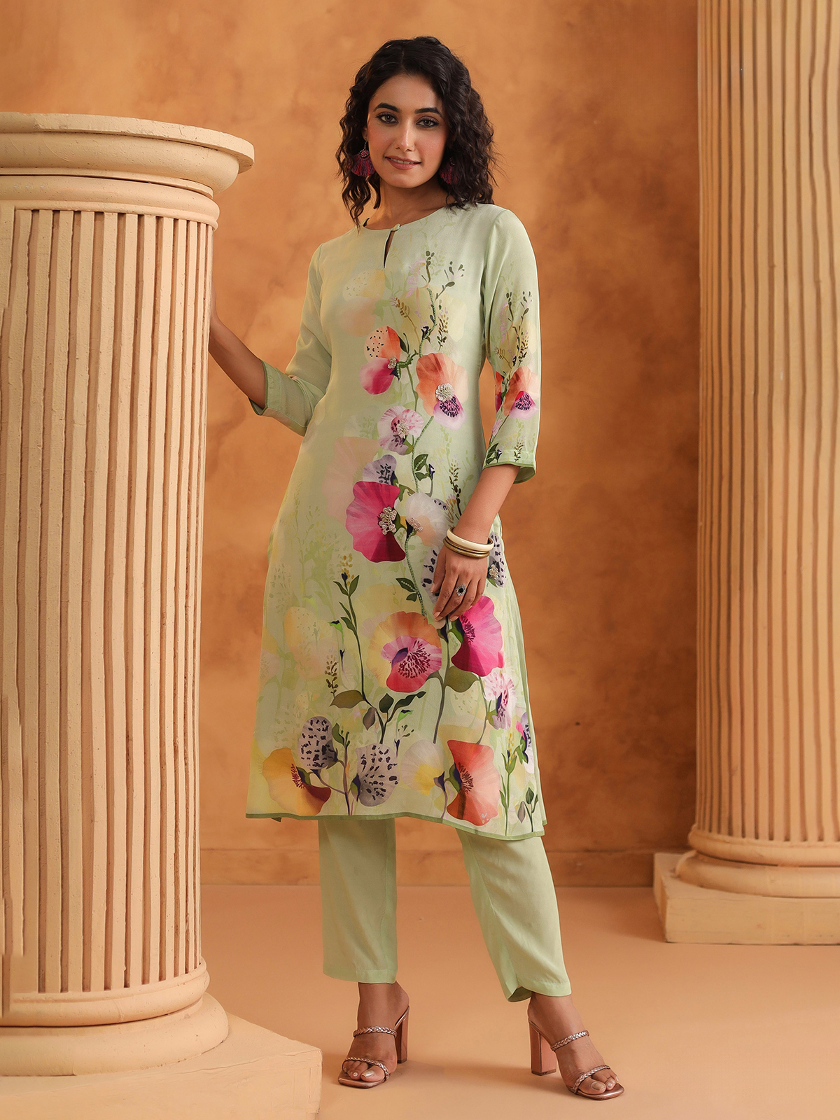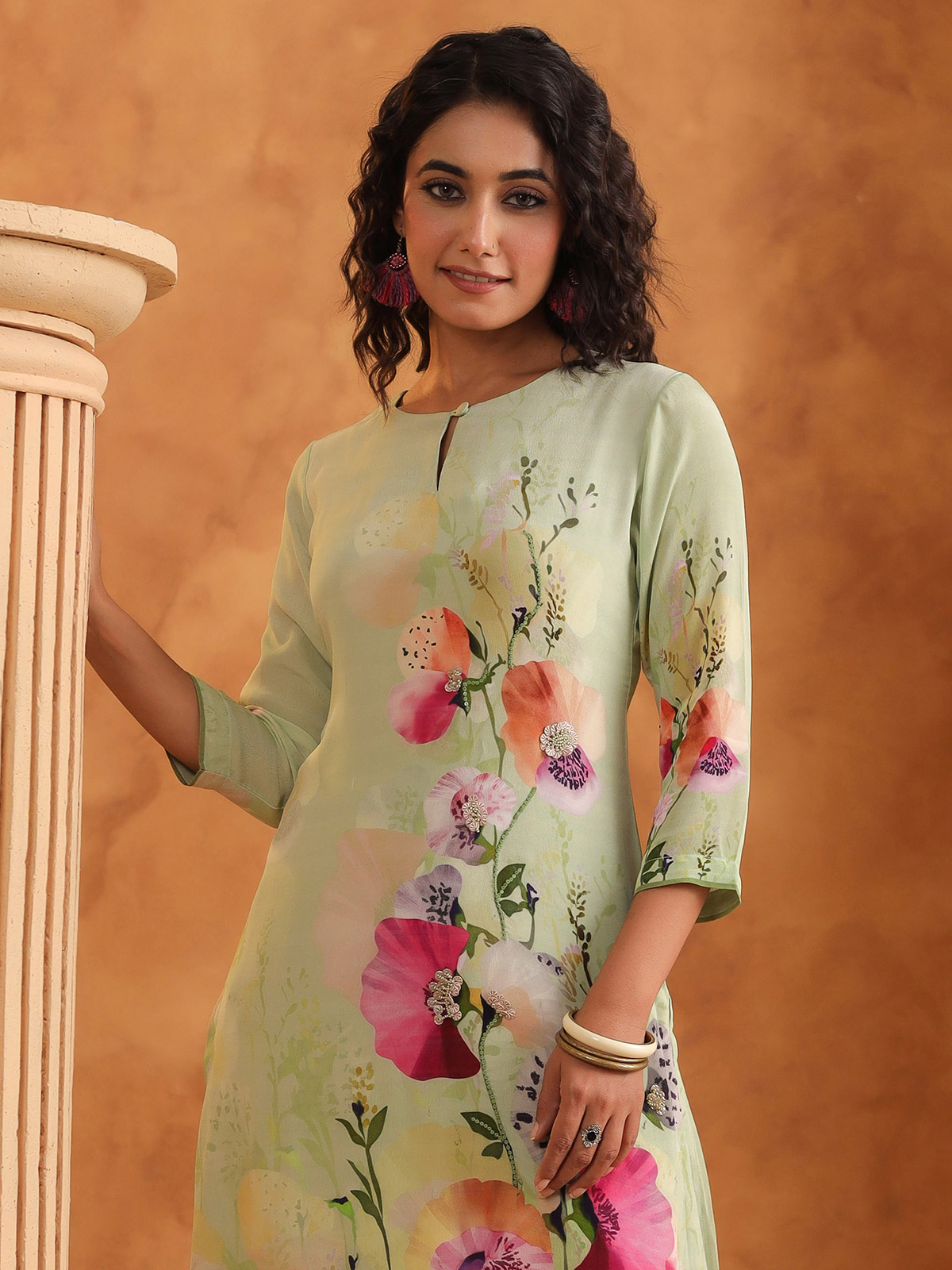 This pista green silk printed kurti gleams with sequins and beads, styled with a keyhole neckline and quarter sleeves. Completed with pants, the festive design blends youthful hues with shimmering detailing, bringing a refreshing charm to joyful occasions.