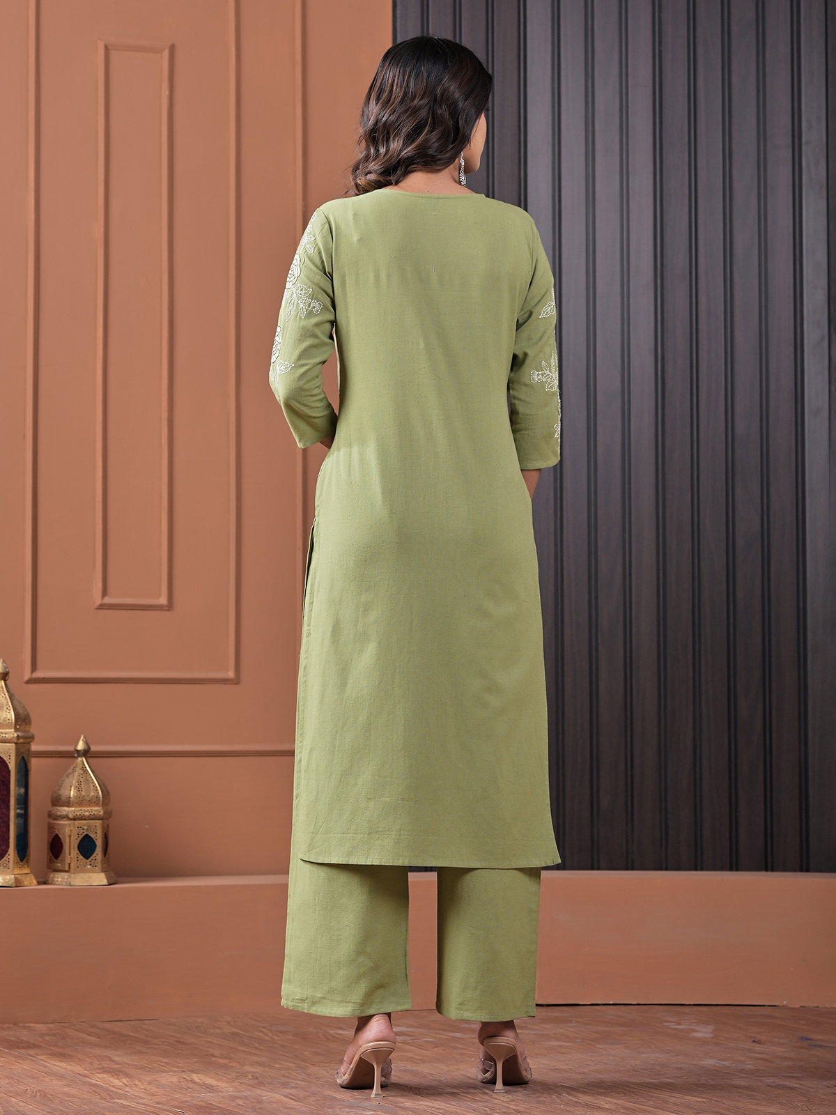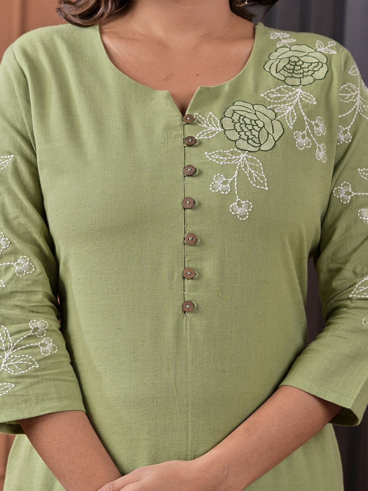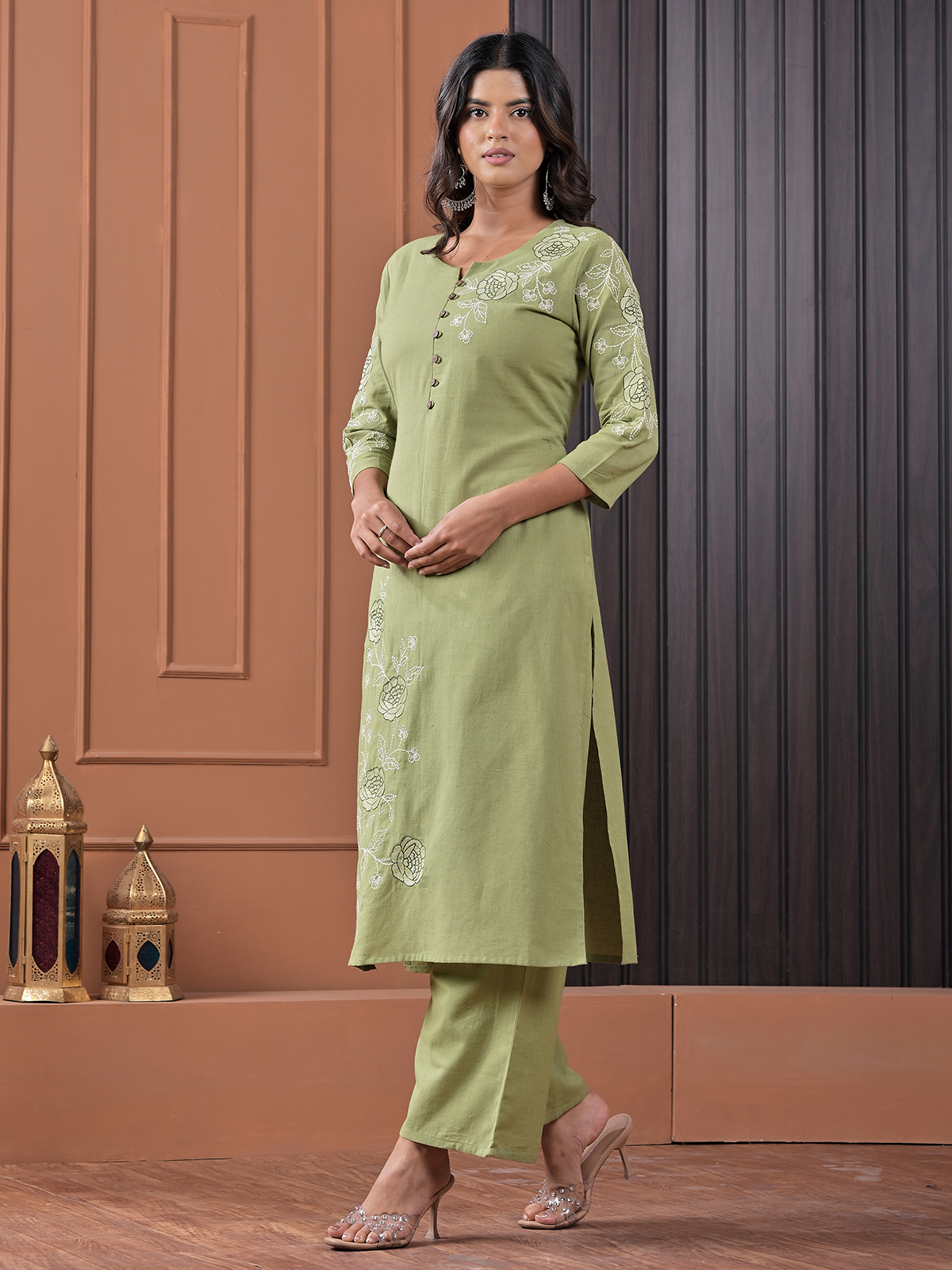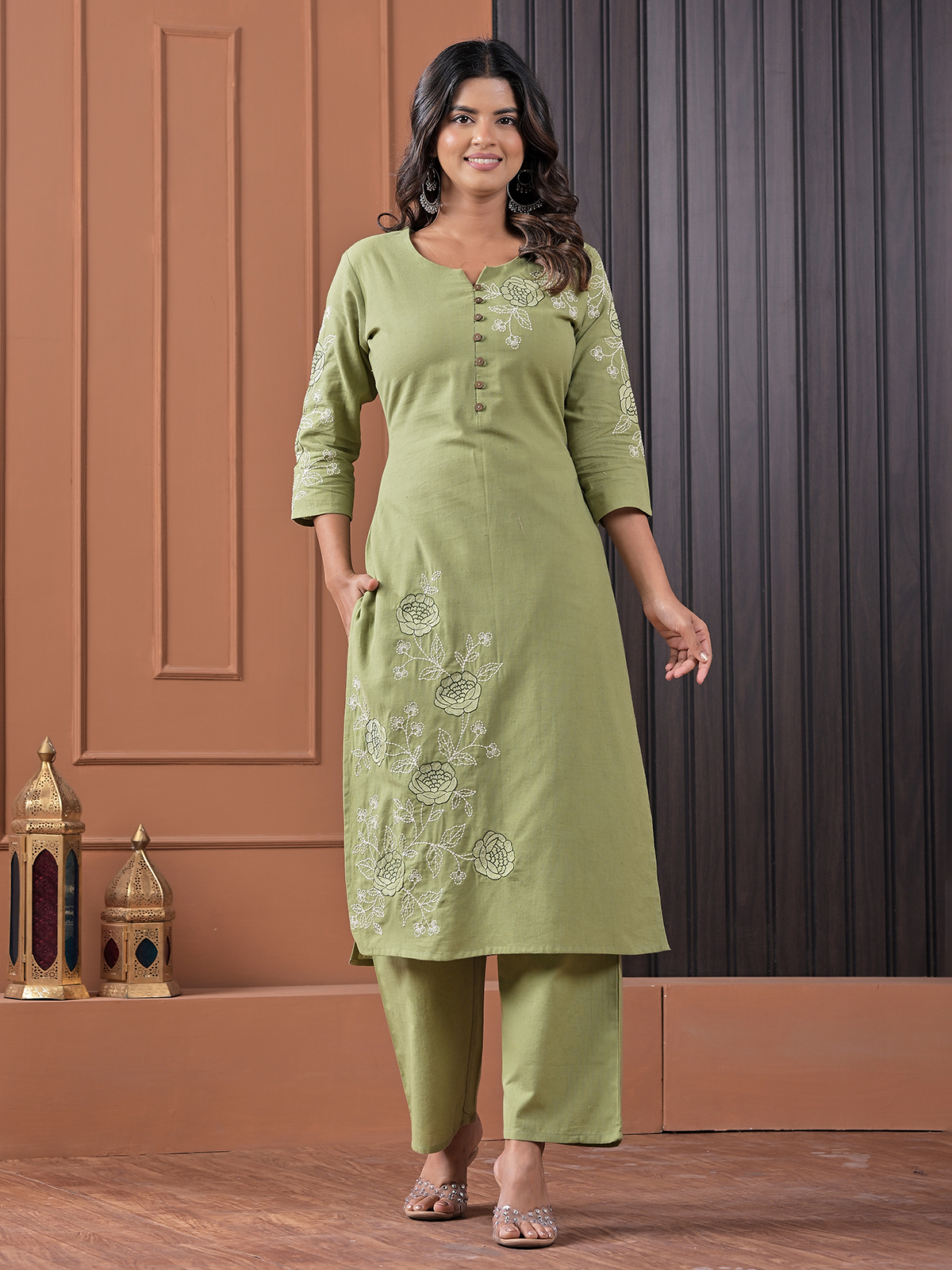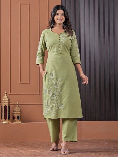 Upgrade your casual festive style with this pista green cotton kurti set featuring elegant thread and embroidery detailing. Designed with quarter sleeves and practical pants with pockets, it offers comfort without compromising sophistication. The breathable cotton fabric makes it perfect for day celebrations, family gatherings and relaxed festive occasions.