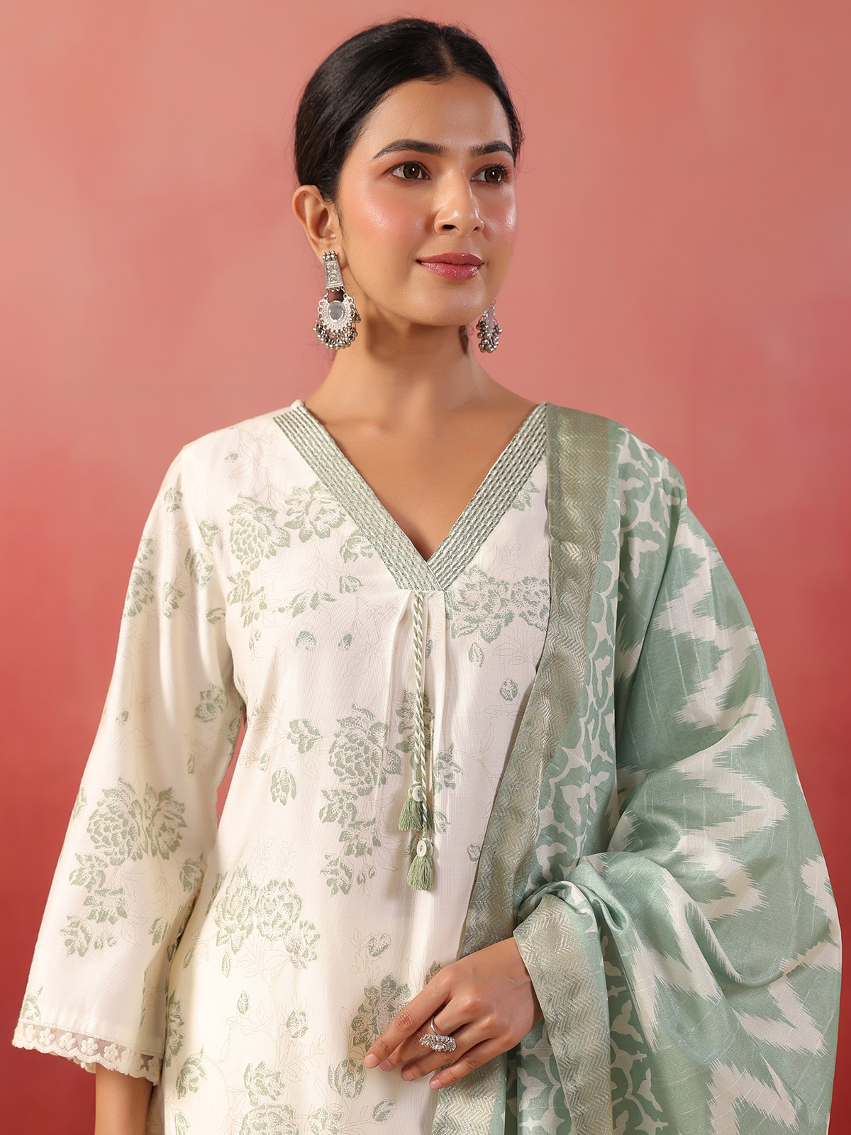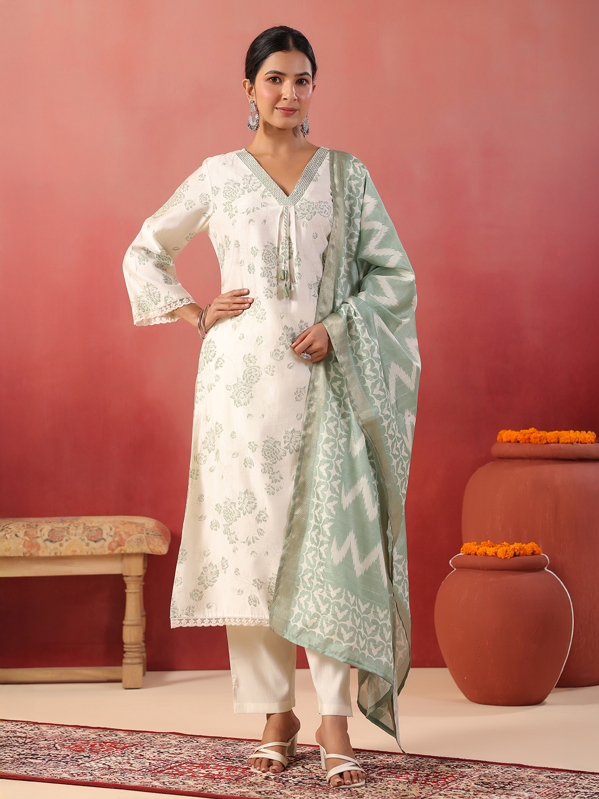 Pista Green Floral Printed Silk Kurti Set With Dupatta
