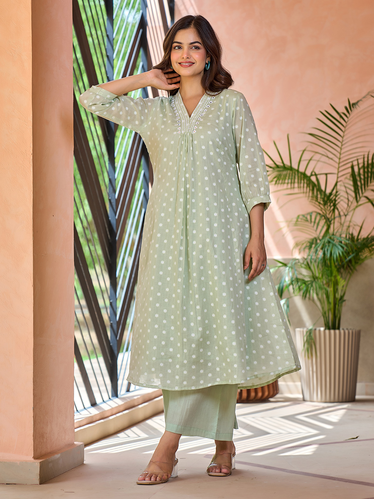 Playful and vibrant, this pista green cotton palazzo set features charming printed motifs. Mirror and thread work shimmer like scattered sunlight. With a V-neckline and quarter sleeves, it pairs elegantly with palazzo bottoms, making it perfect for festive events and joyful family celebrations.