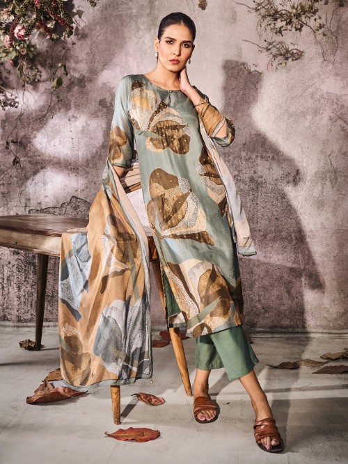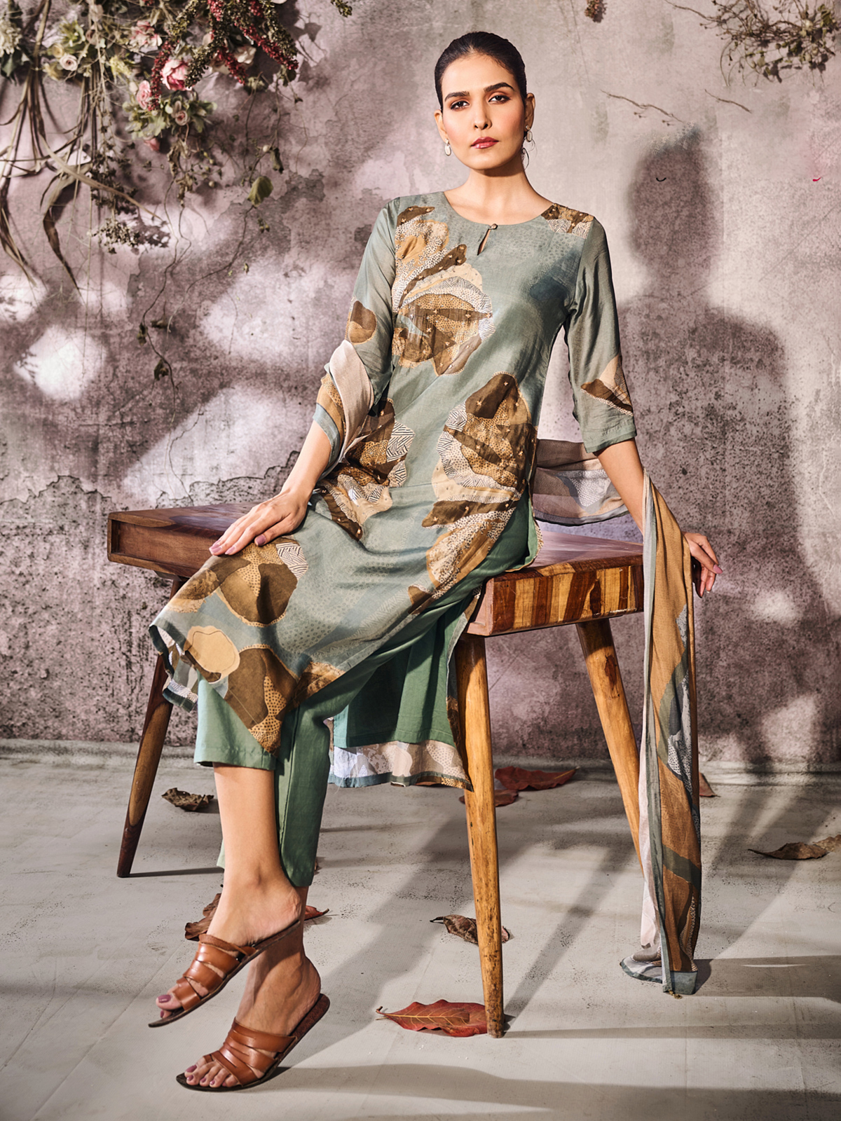 Pista green silk glows in quiet elegance, graced by subtle sequins that shimmer with poise. The keyhole neckline and quarter sleeves enhance its balanced charm. Teamed with pant and dupatta, it reflects serene beauty ideal for festive or casual moments.
