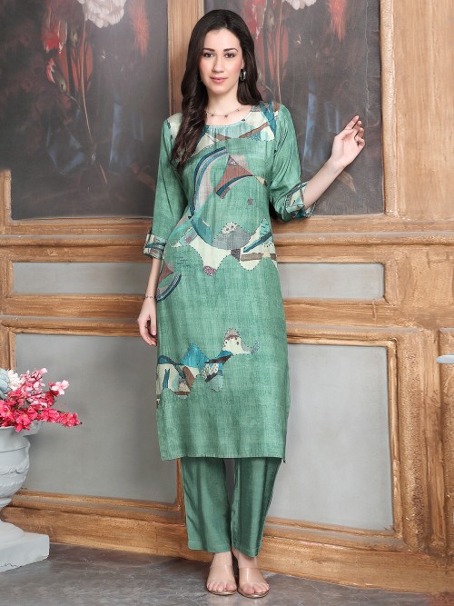 Pista Green Sequins Worked Printed Silk Kurti Set