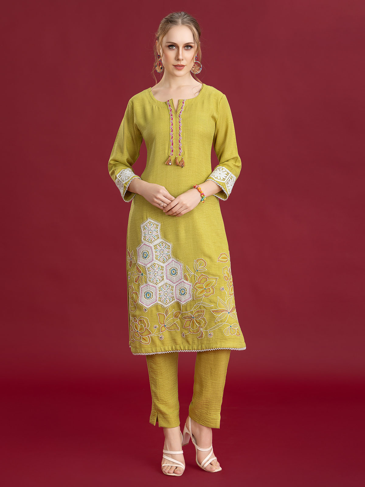 Crafted in pista green silk, this kurti and pant set has soft embroidery that gives it a simple yet festive look. With quarter sleeves and a comfortable fit, it is ideal for everyday wear with a touch of tradition.