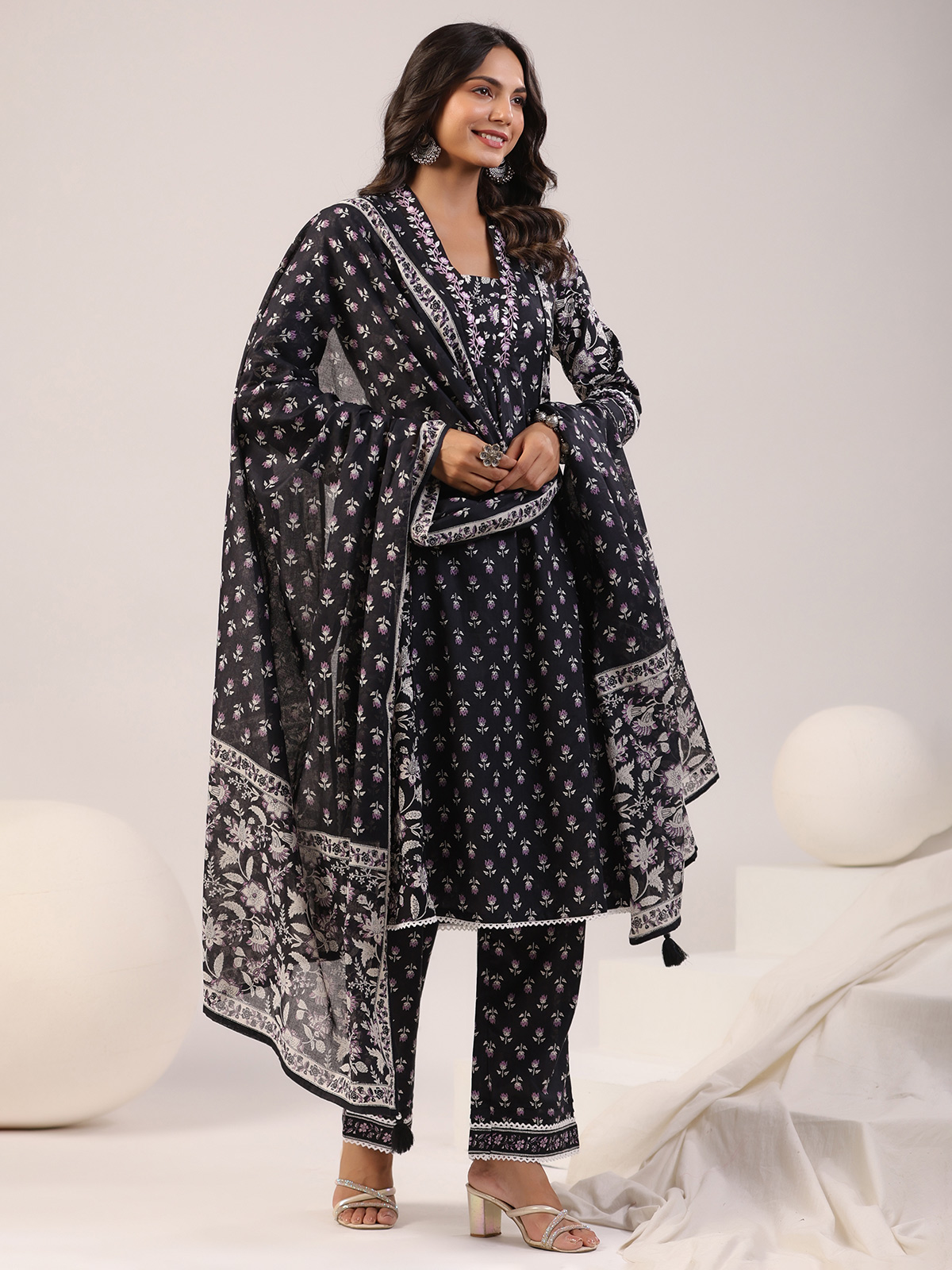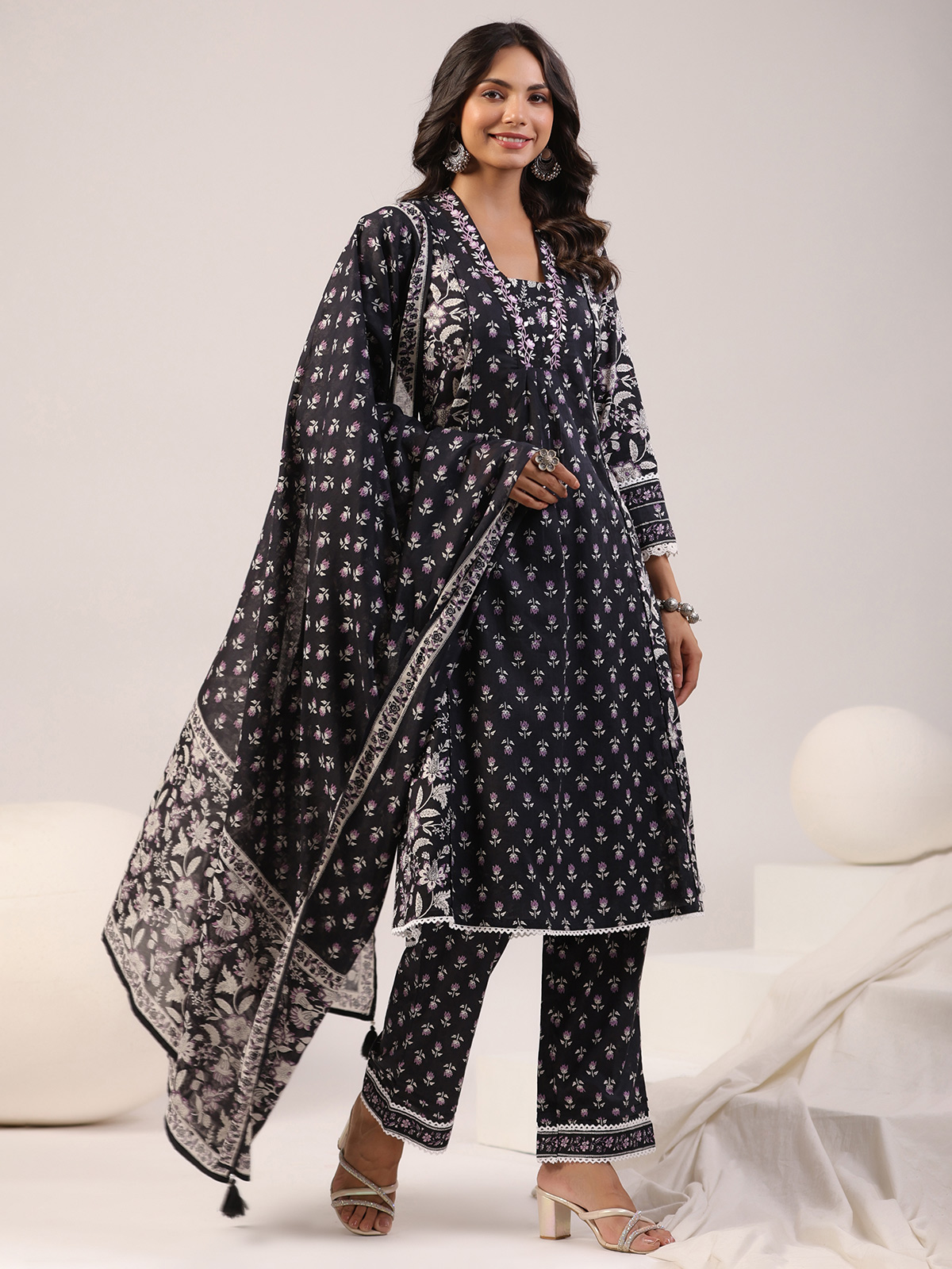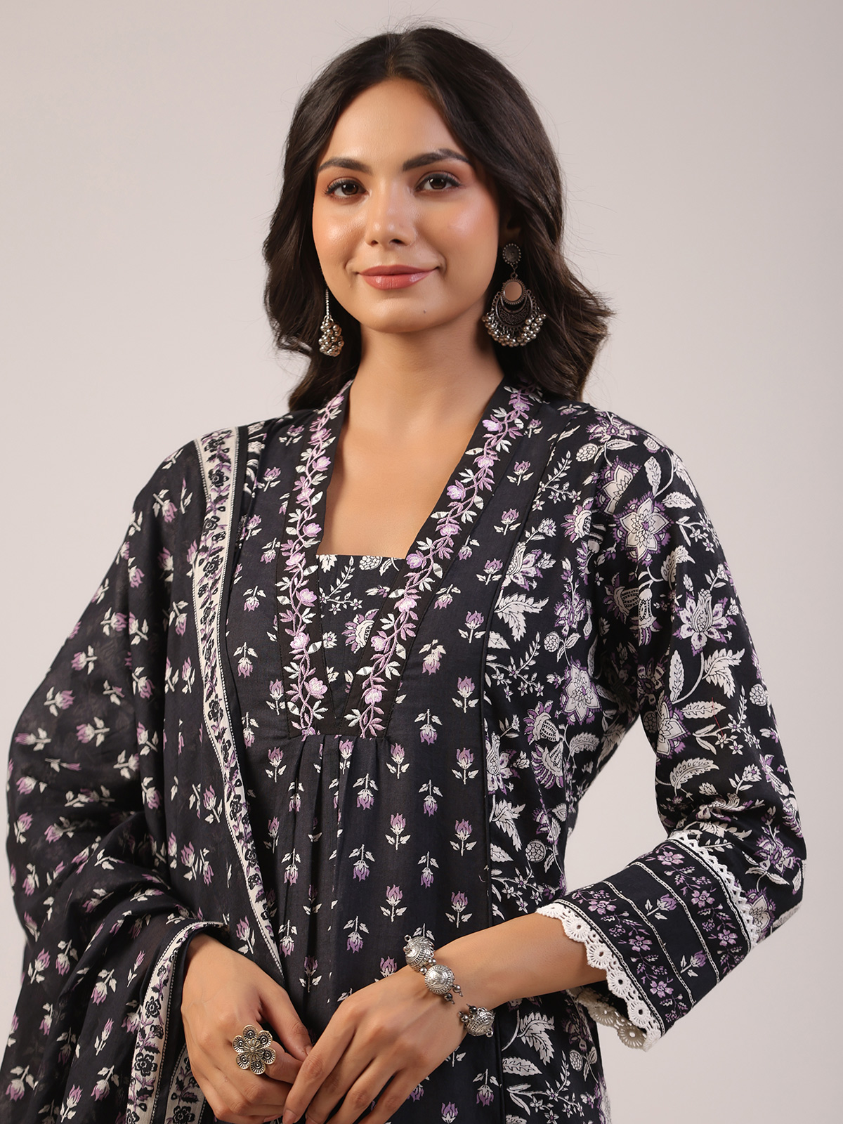 Purple And Black Casual Cotton Embroidered Kurti Set