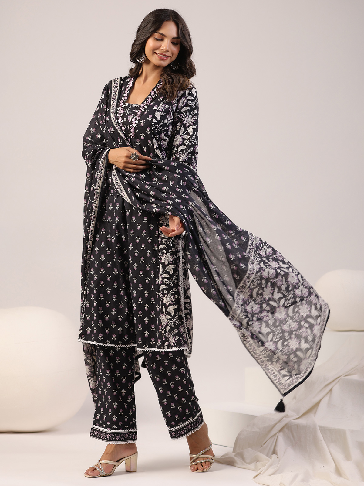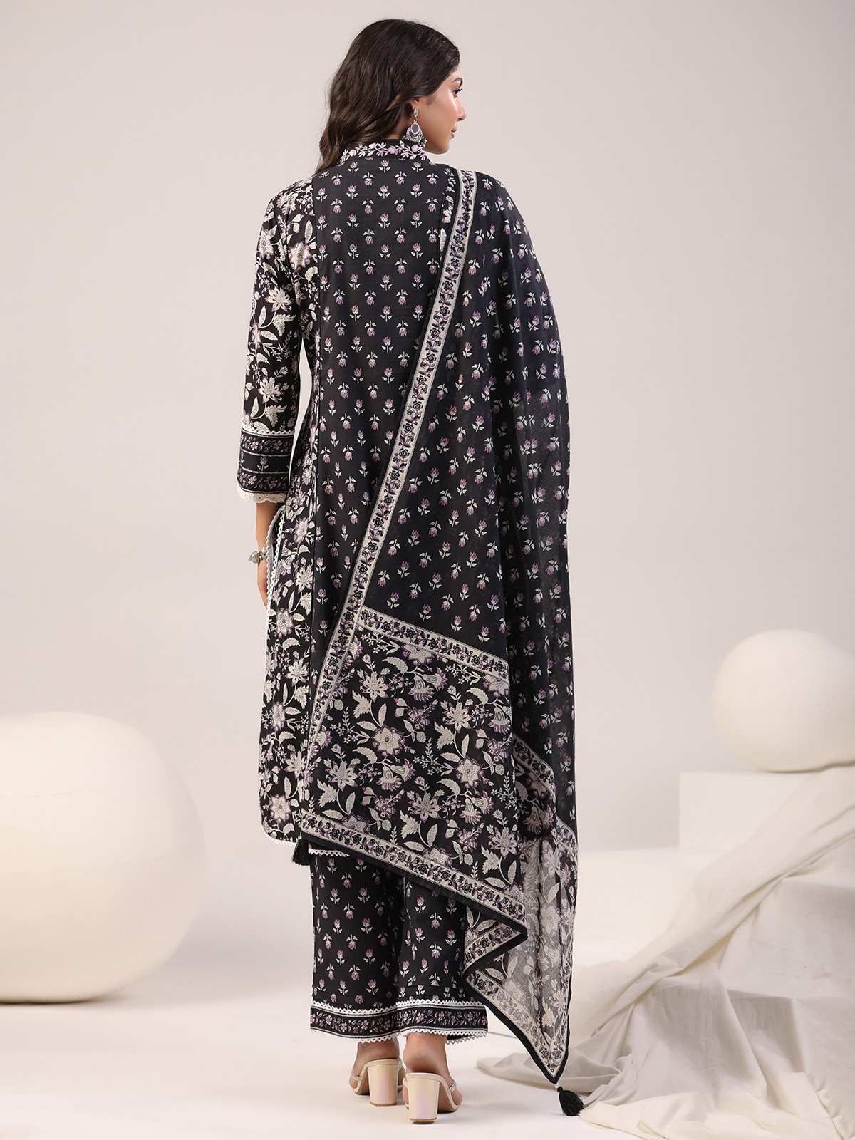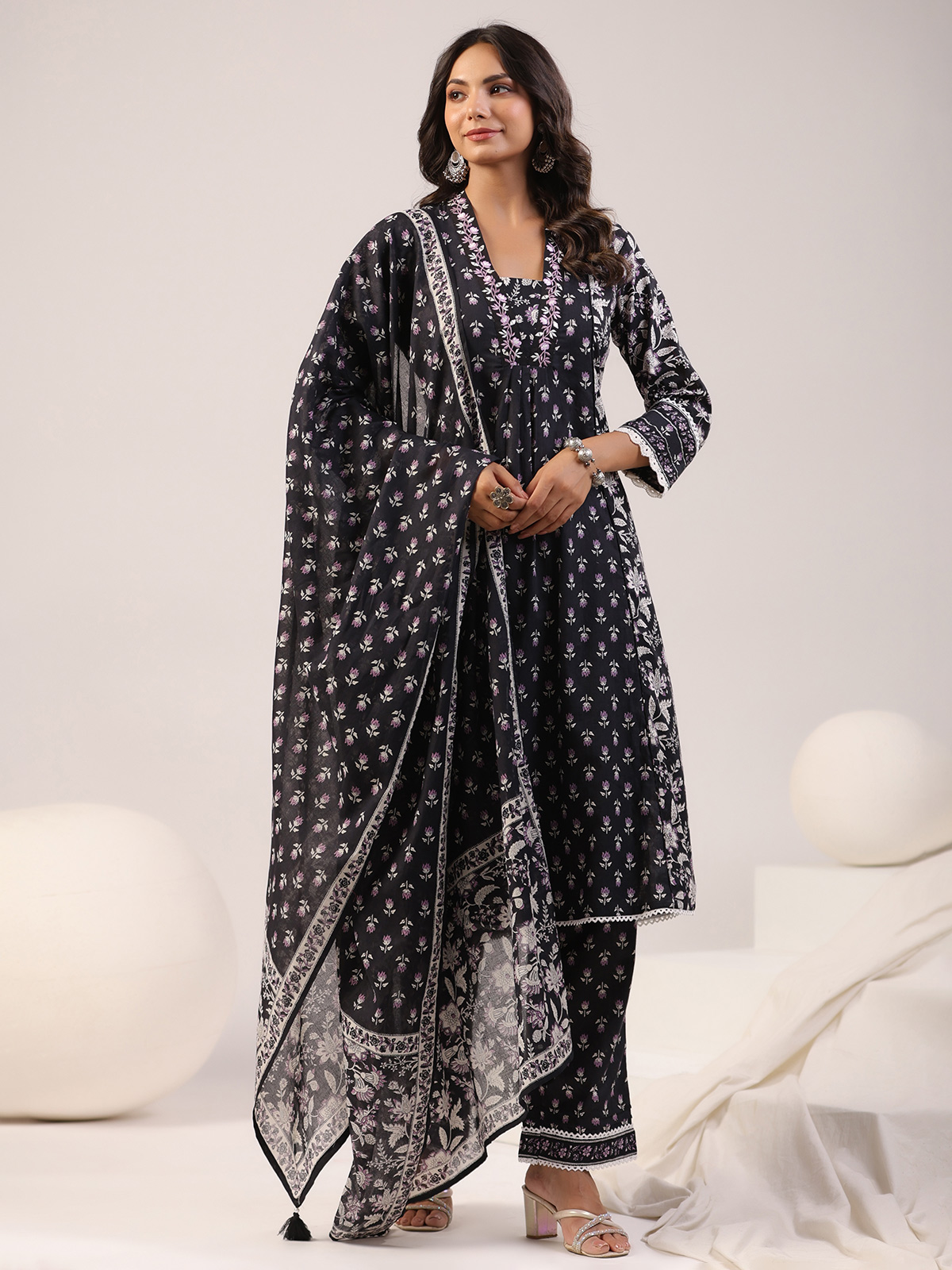 Purple And Black Casual Cotton Embroidered Kurti Set