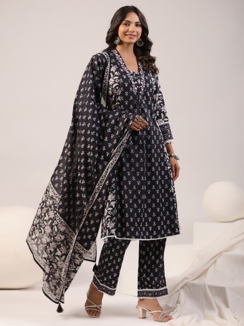 Wear this purple and black cotton kurti set for the ideal balance of comfort and style. Its exquisite embroidery and aabla embellishments make it stand out. It looks stylish and carefree when worn with slacks and a patterned dupatta.