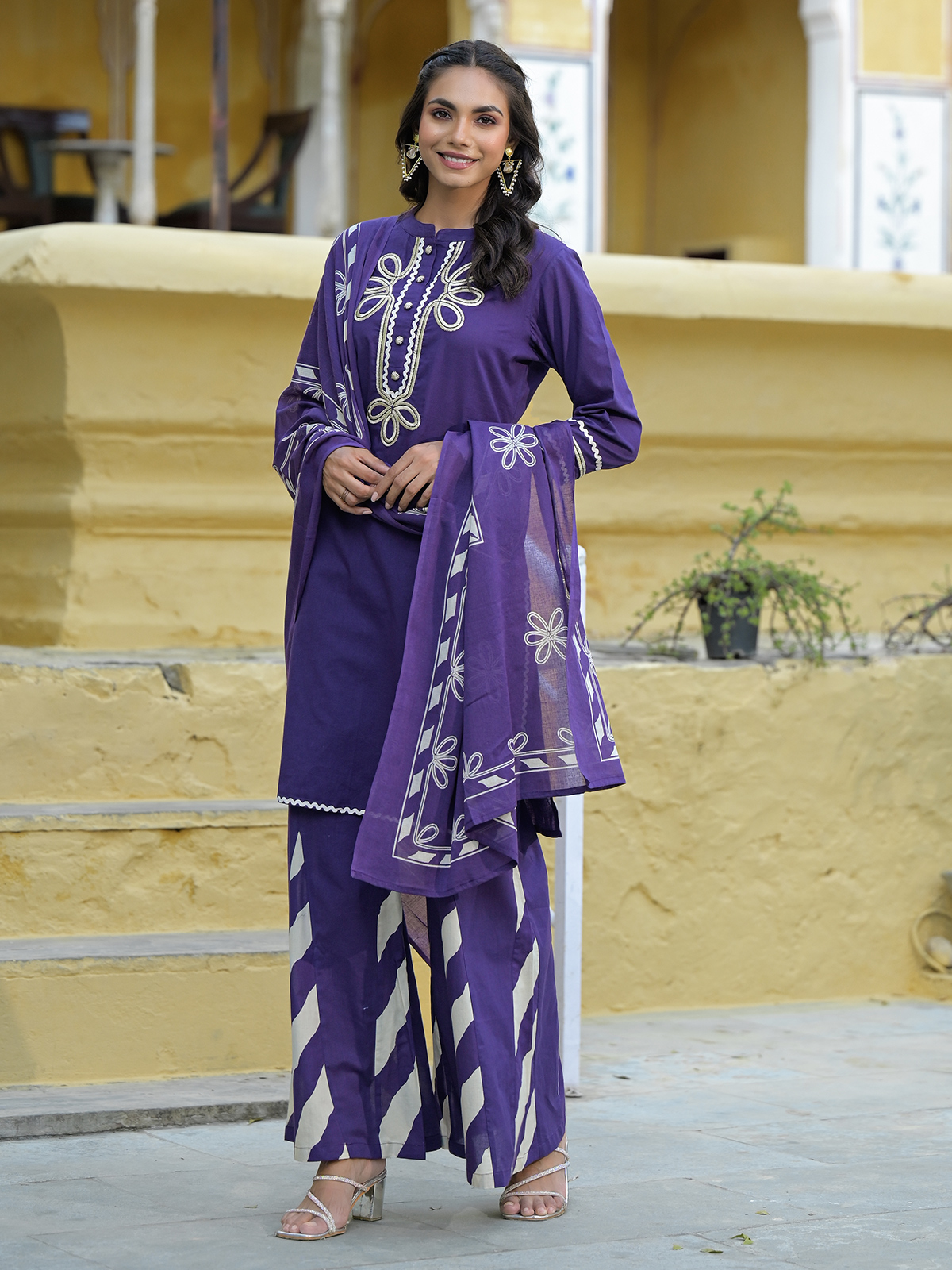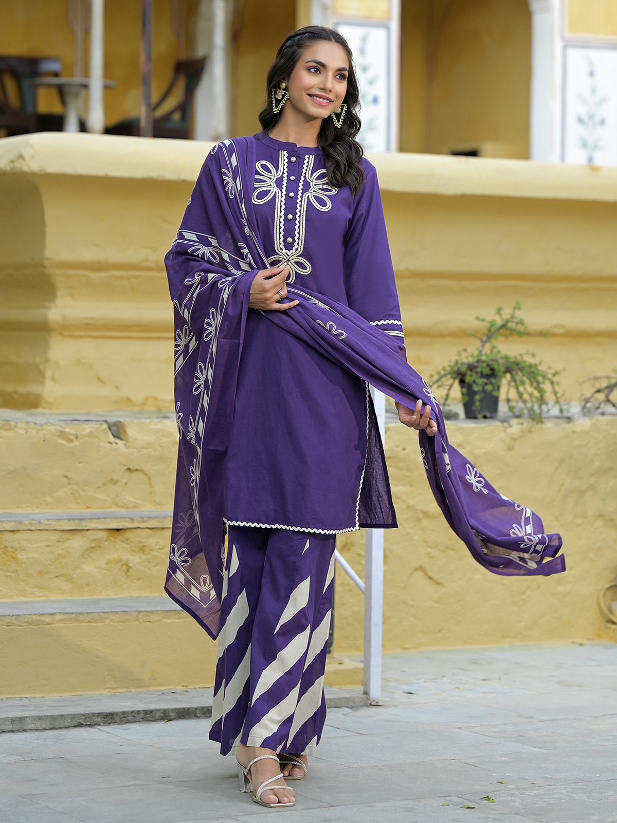 Grace meets comfort in this beautiful purple cotton kurti set, designed for effortless festive elegance. Styled with a round neckline and quarter sleeves, it showcases refined thread work that adds understated charm. Ideal for festive occasions and family gatherings, the set is completed with a palazzo and a coordinated printed dupatta.
