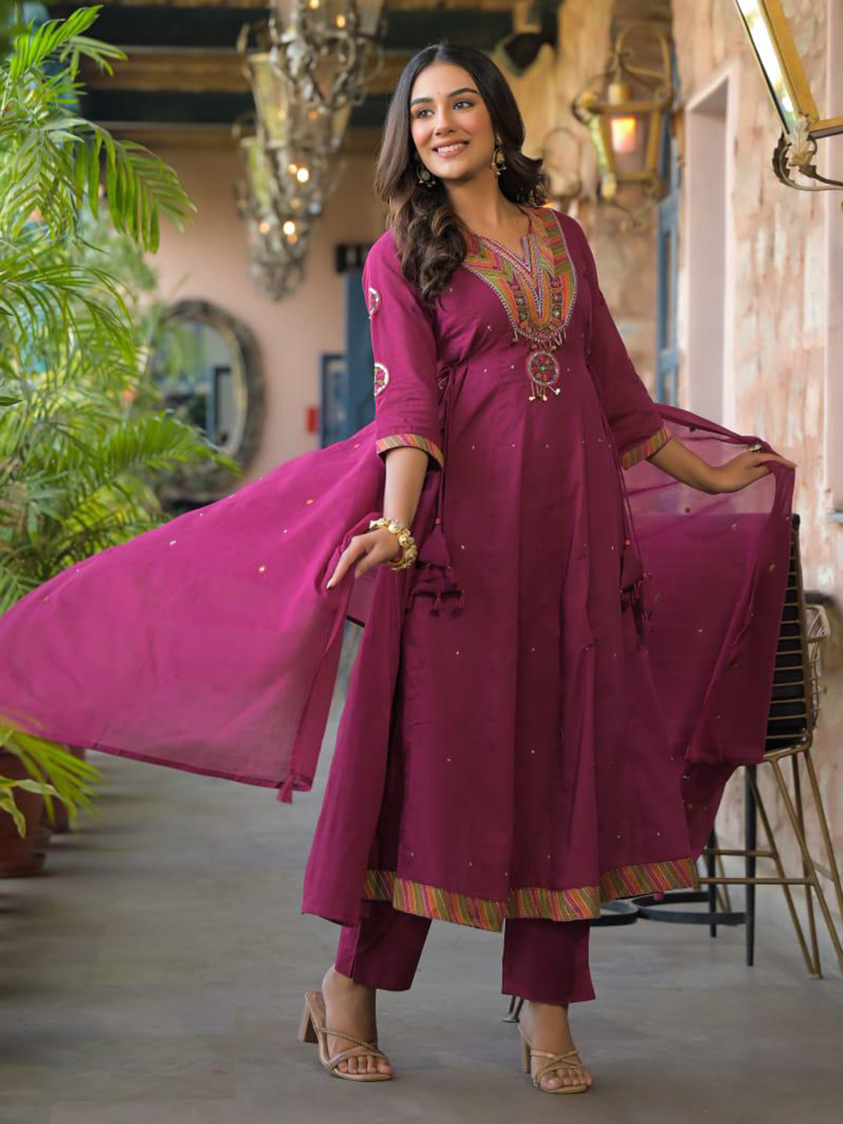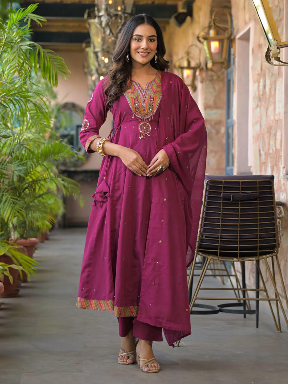 Elegant purple cotton silk kurti set enhanced with aabla, cutdana, beads, sequins and thread work. Styled with a sweetheart neckline and quarter sleeves, it comes with a pant and dupatta for festive occasions.