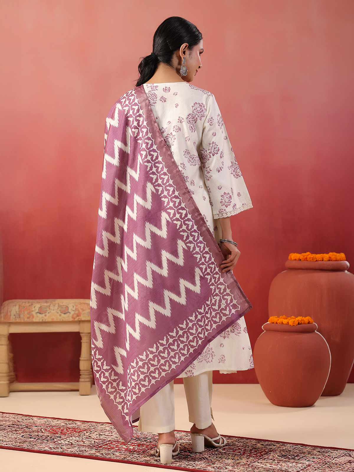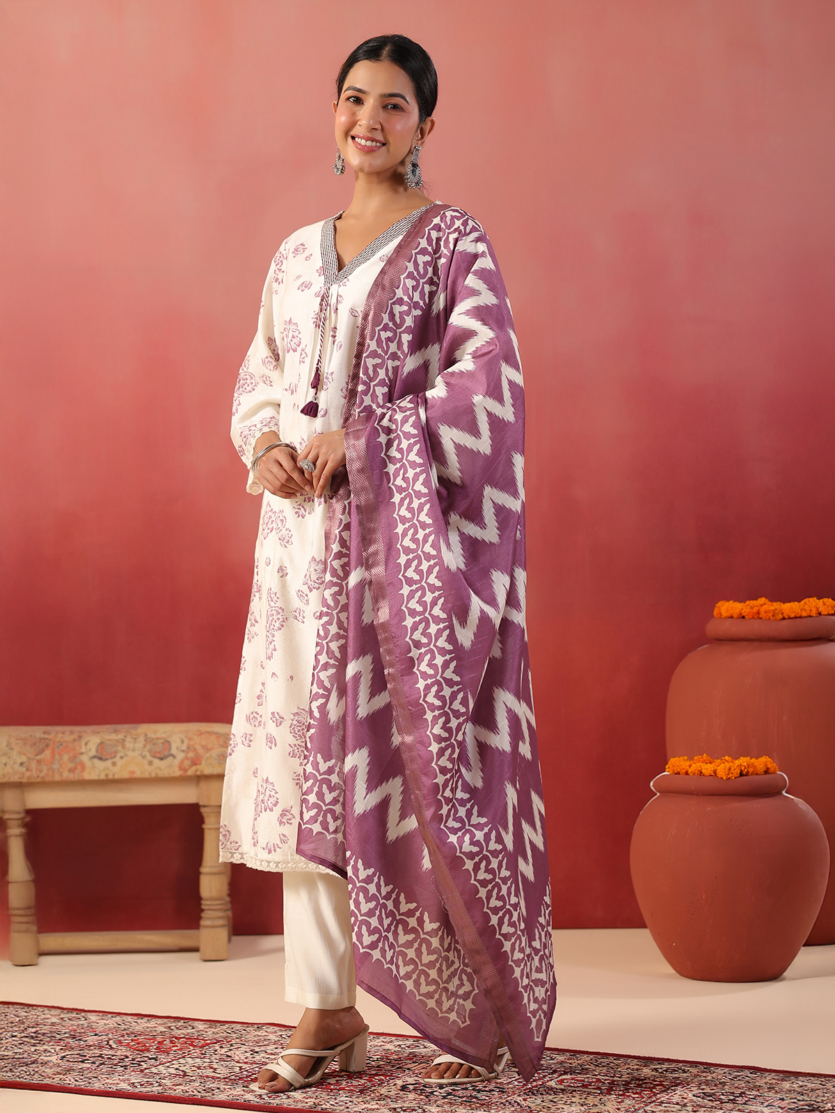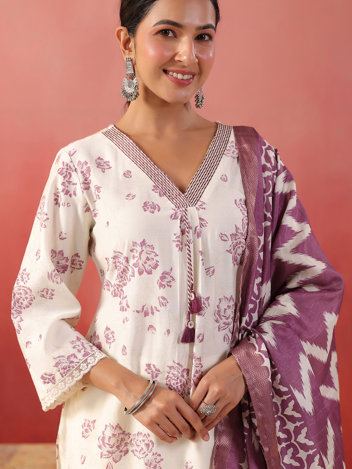 This purple silk kurti set showcases elegant floral prints paired with a coordinated dupatta and pants. Featuring a V-neck and quarter sleeves, it delivers a refined festive appeal while maintaining comfort, making it ideal for celebrations and special gatherings.