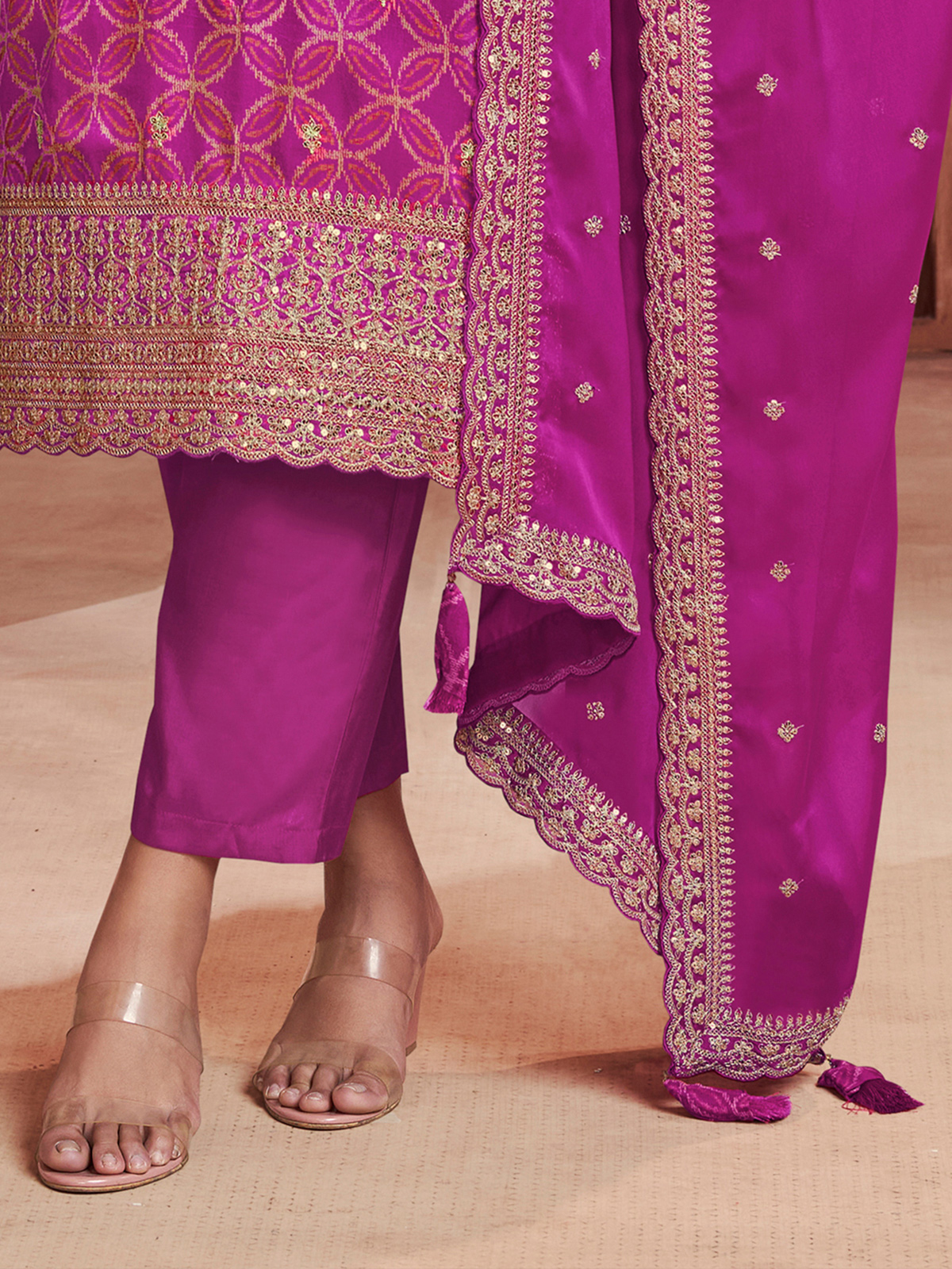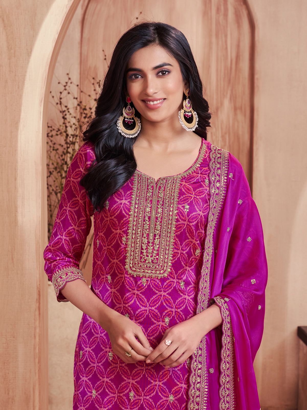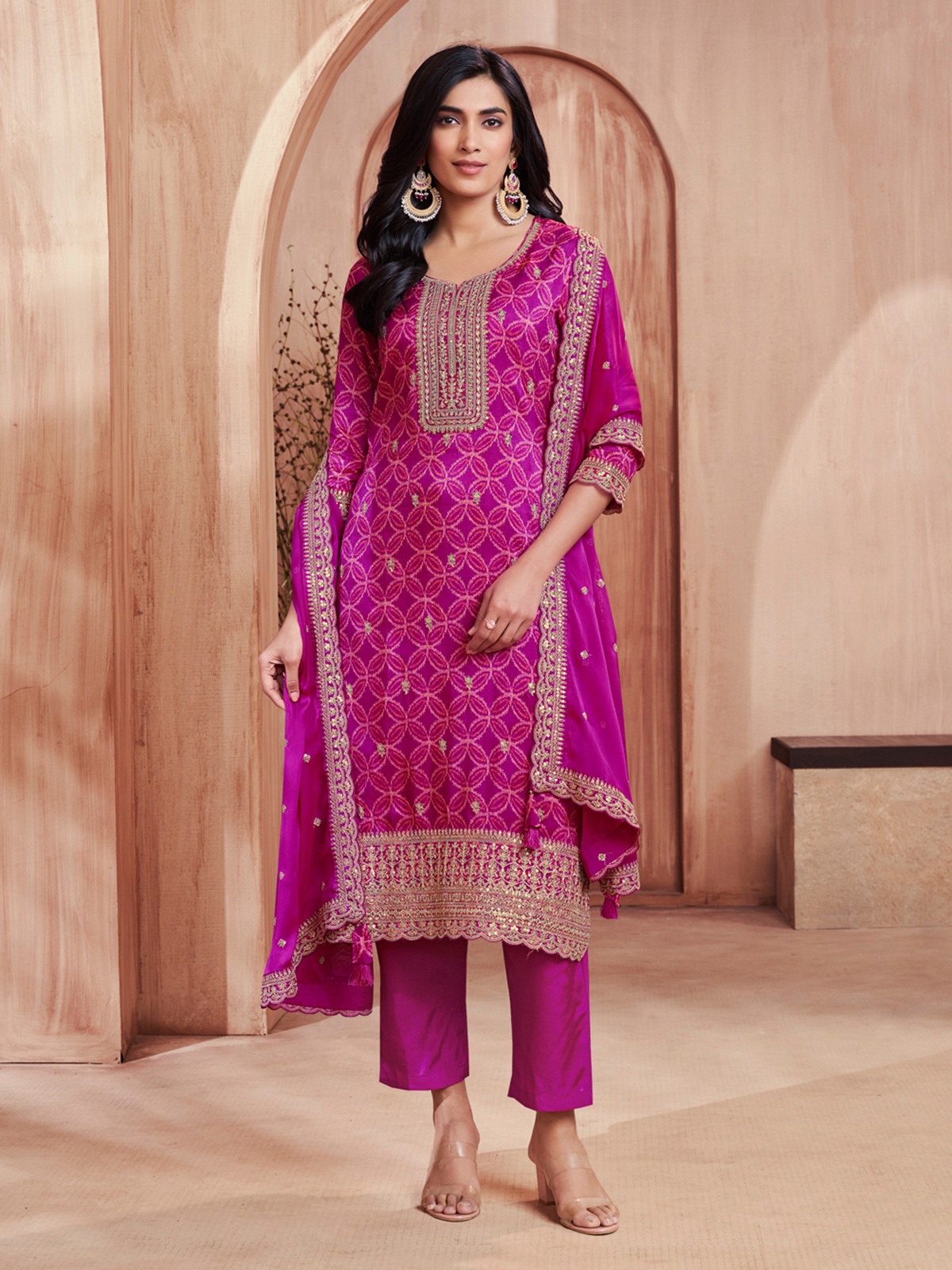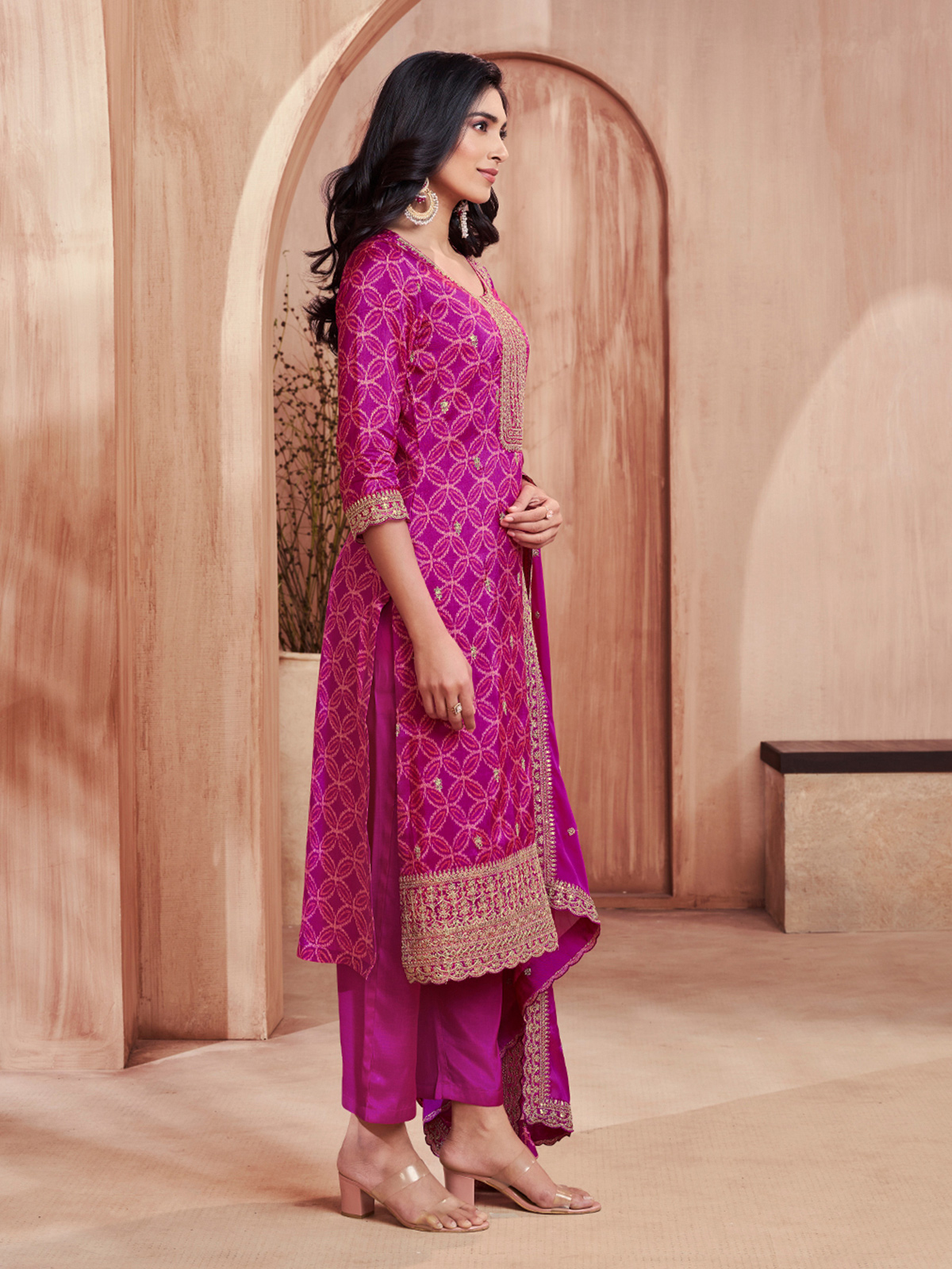 Crafted in graceful purple silk printed straight cut kurti set is adorned with delicate embroidery and sequin accents. Featuring a sweetheart neckline and quarter sleeves, it is paired with a pant and dupatta, offering an elegant silhouette for weddings and festive gatherings.