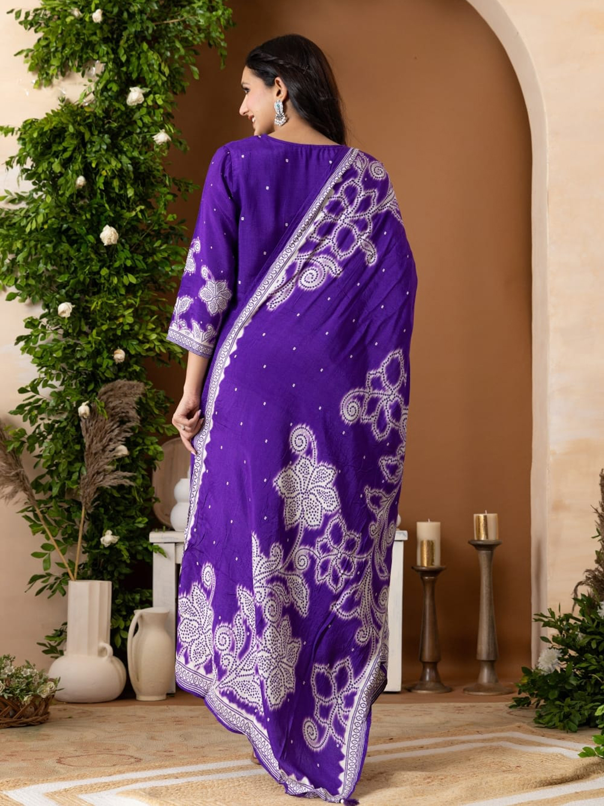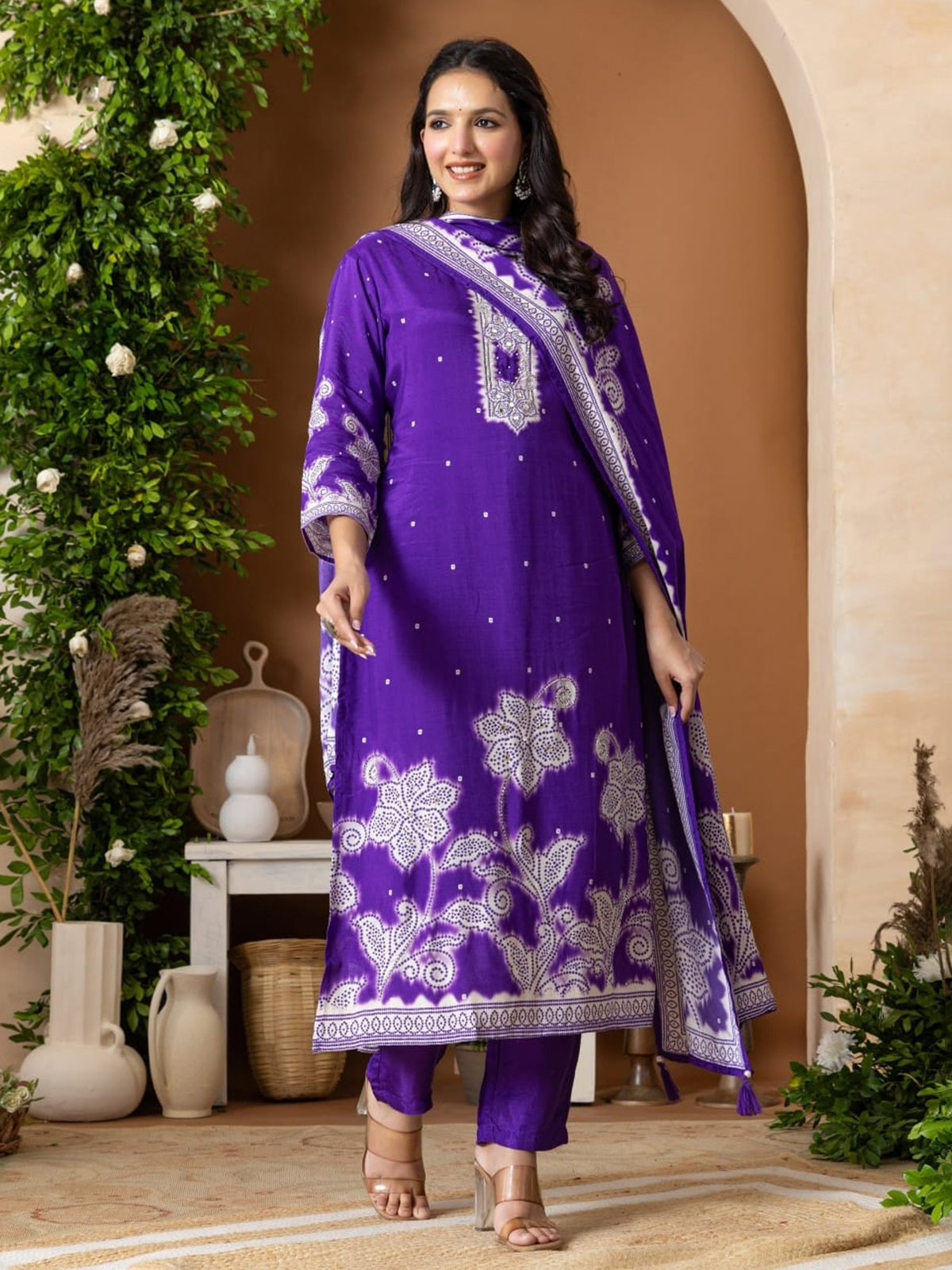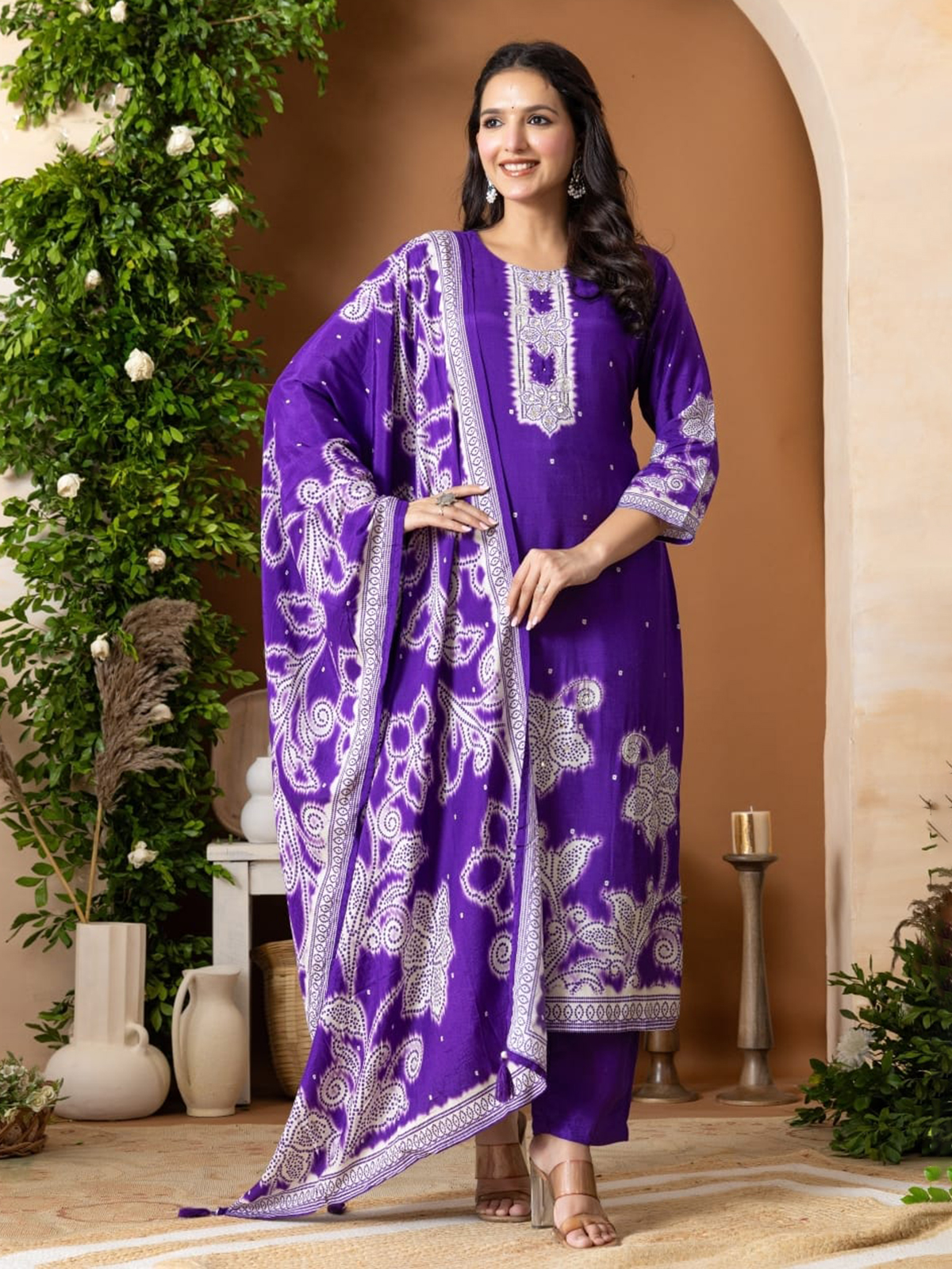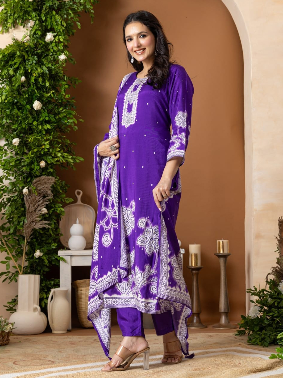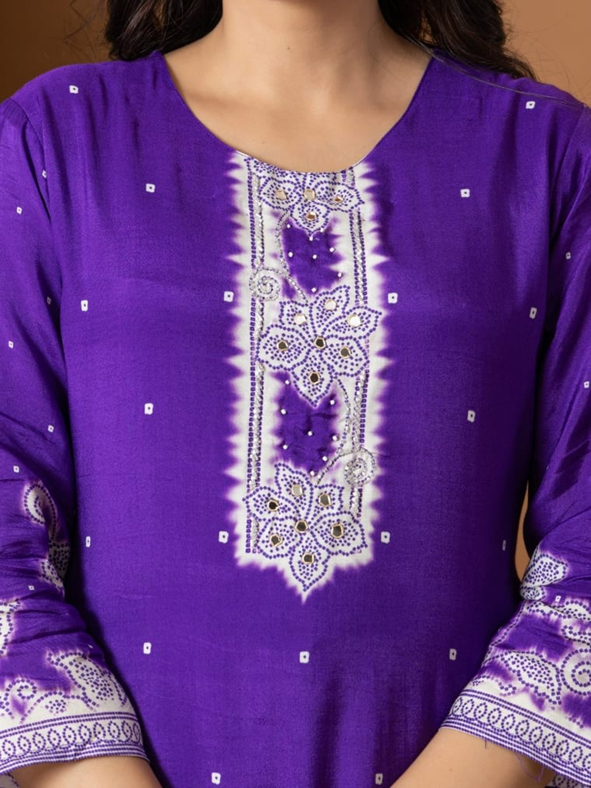 Lush purple silk glows with mirror, beads, and cutdana detailing that sparkle like starlight. Featuring a round neckline and quarter sleeves, this set is complemented by tailored pants and a printed dupatta, offering a refined and artistic look perfect for festive celebrations and joyful gatherings.
