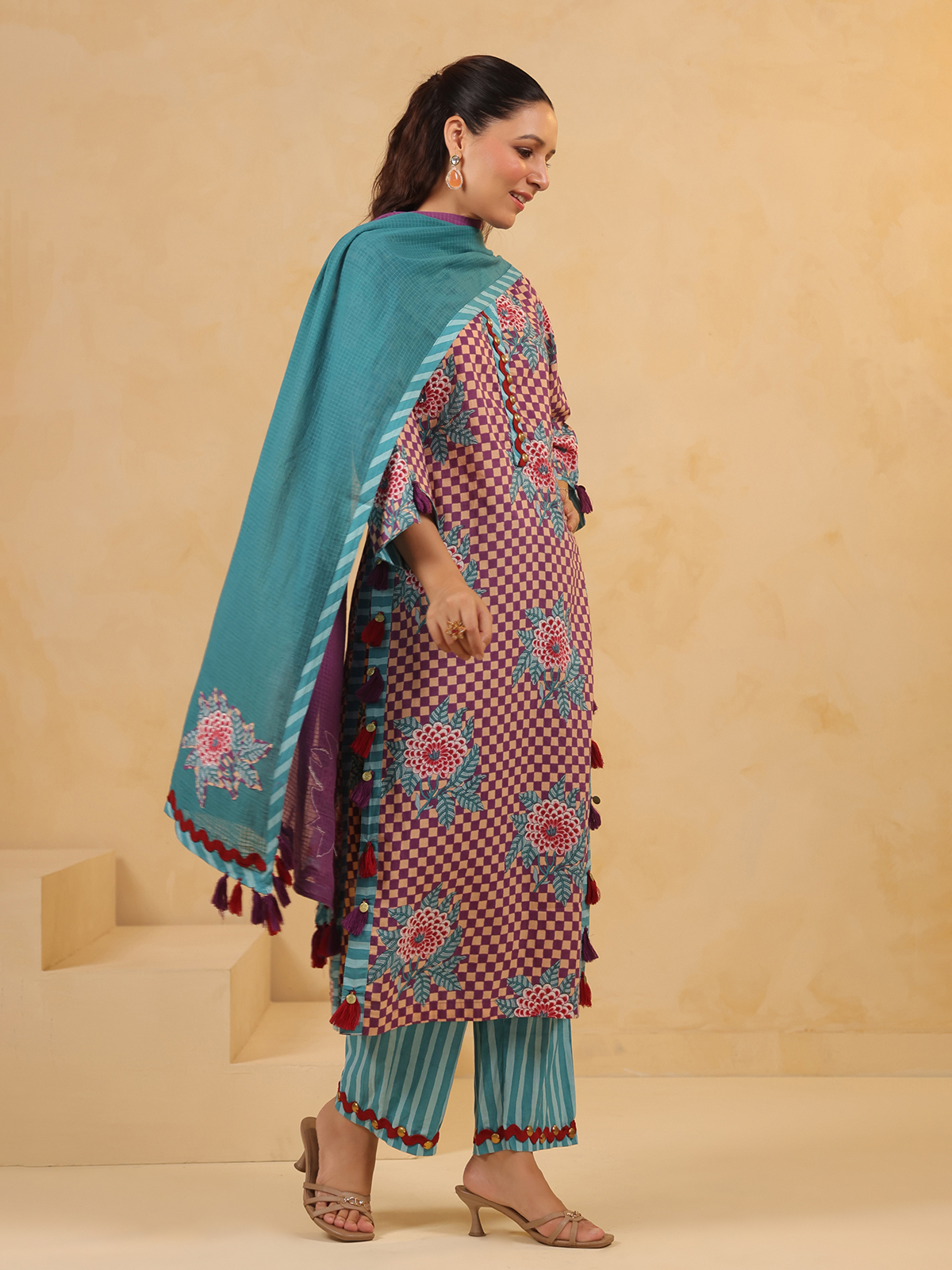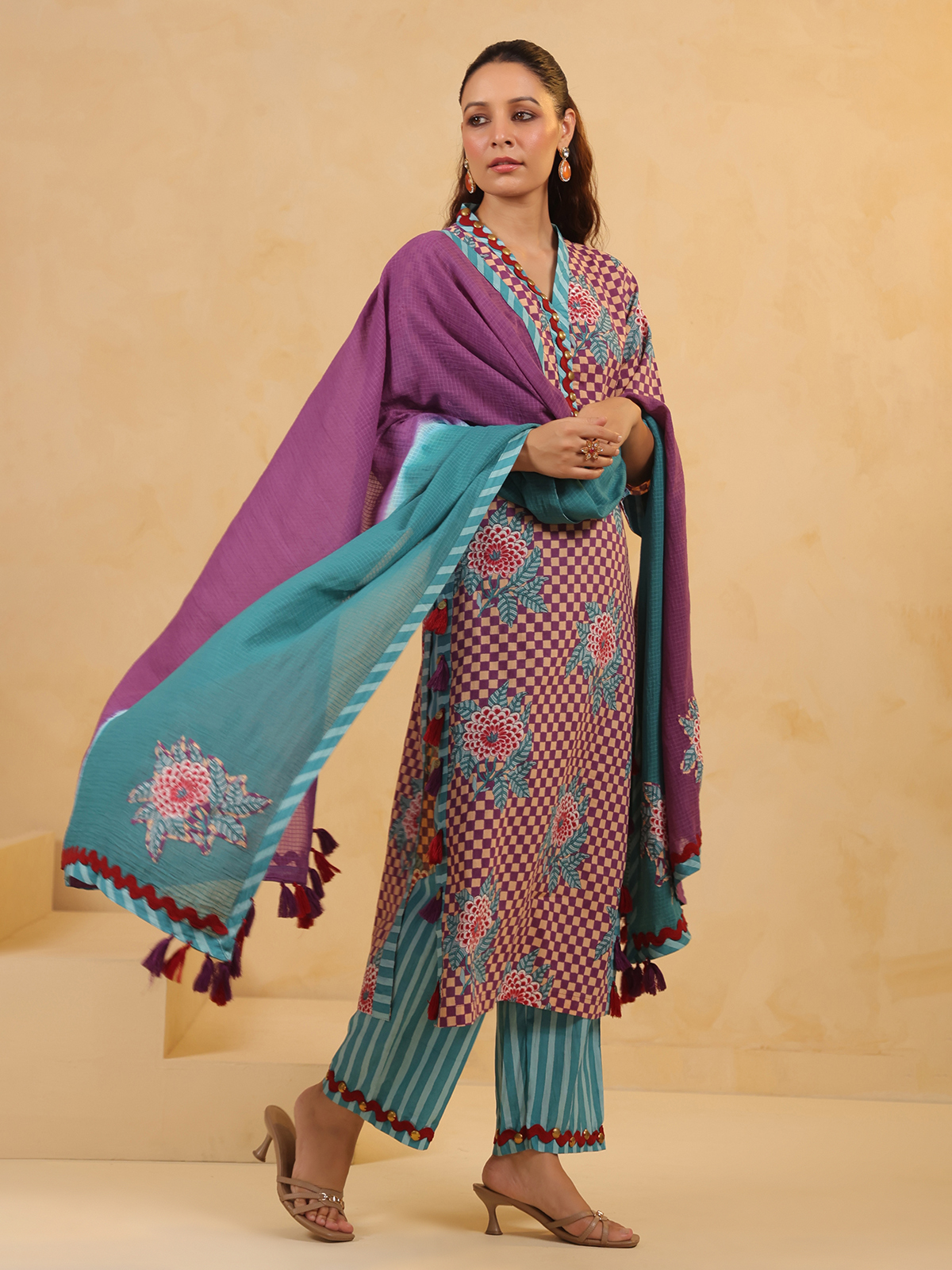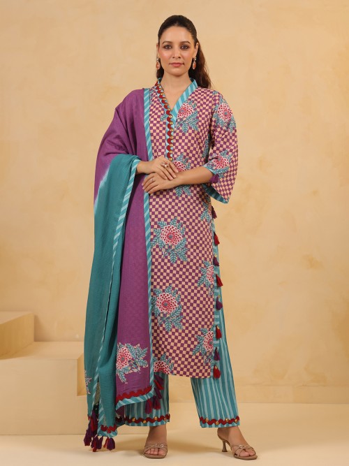 Celebrate vibrant tradition in this purple silk kurti set, printed and embellished with coins and sequins. Styled with a V-neckline, quarter sleeves, coordinating pants, and a dupatta, this outfit brings rich color and radiant detail to your festive wardrobe.