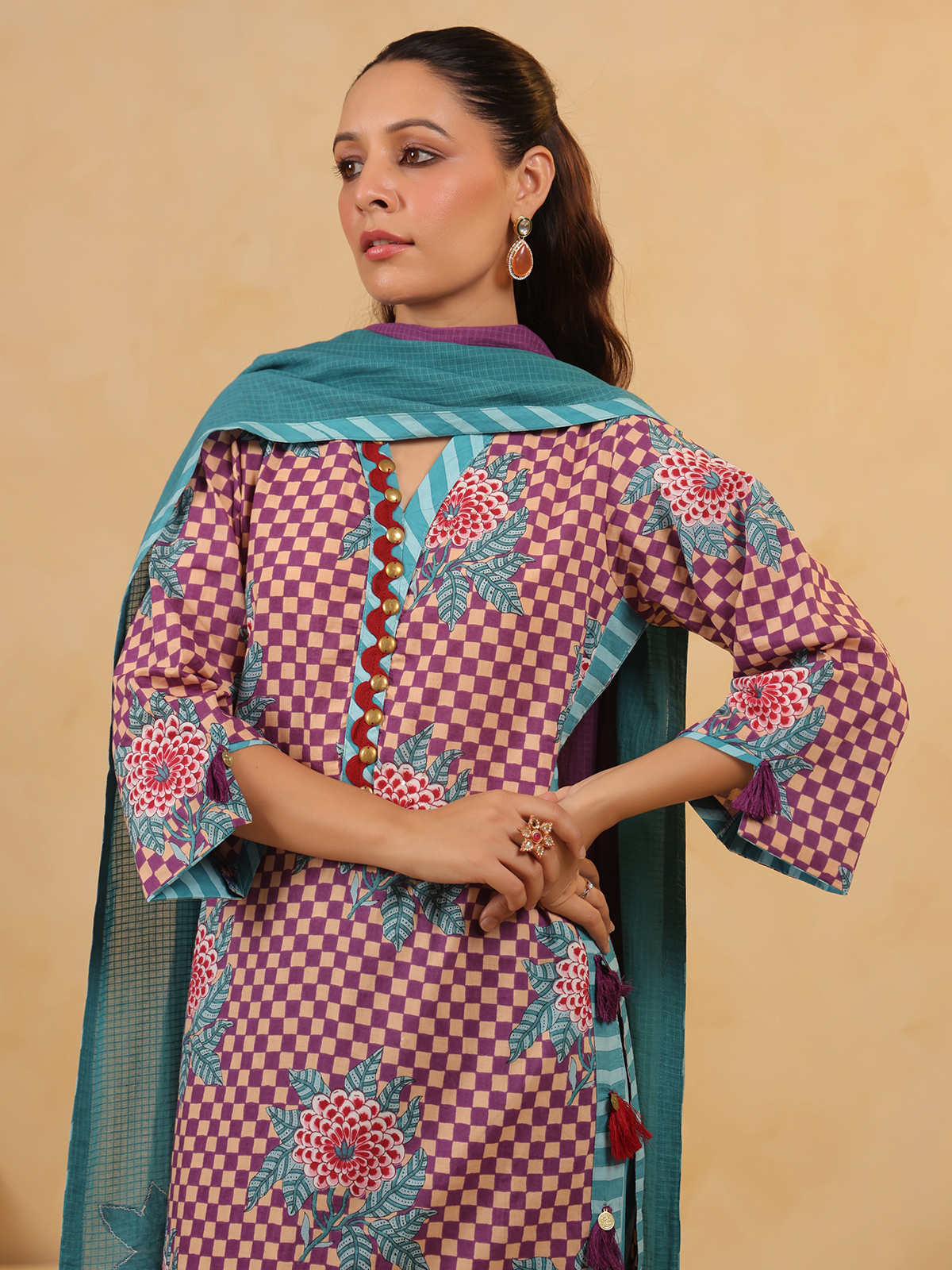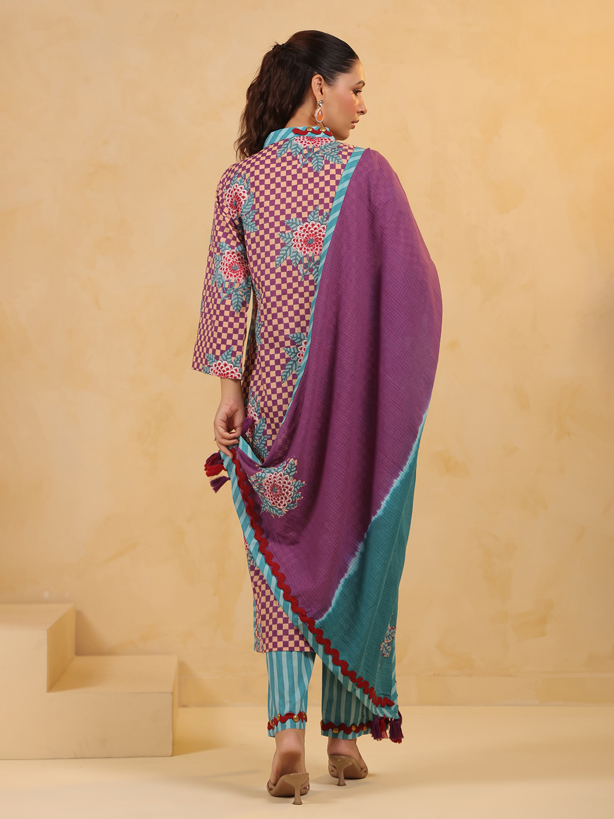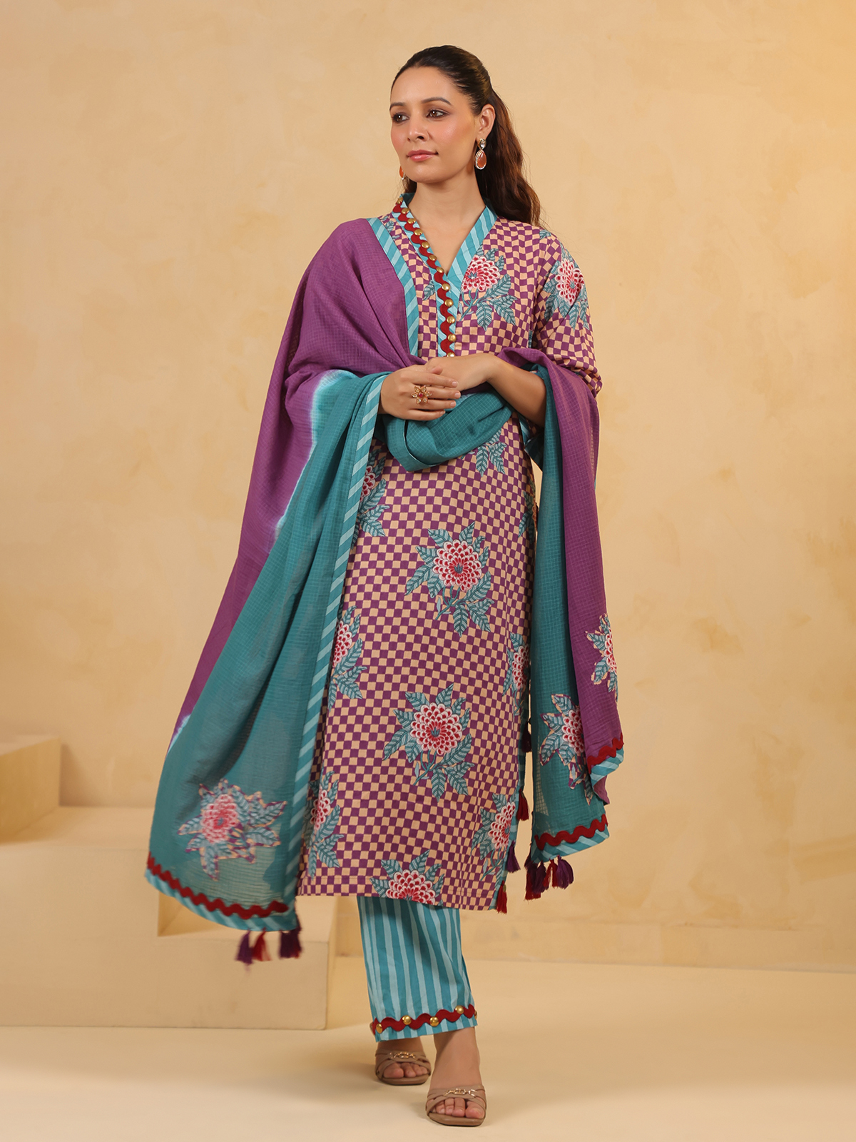 Celebrate vibrant tradition in this purple silk kurti set, printed and embellished with coins and sequins. Styled with a V-neckline, quarter sleeves, coordinating pants, and a dupatta, this outfit brings rich color and radiant detail to your festive wardrobe.