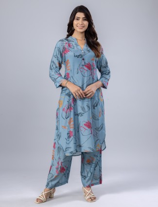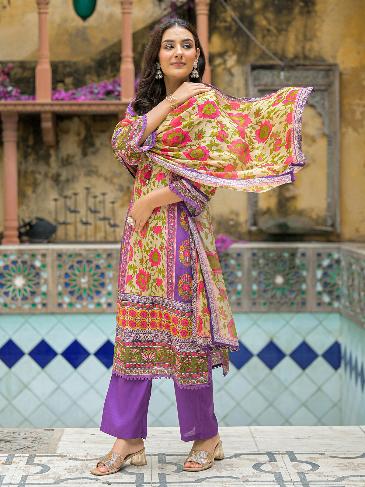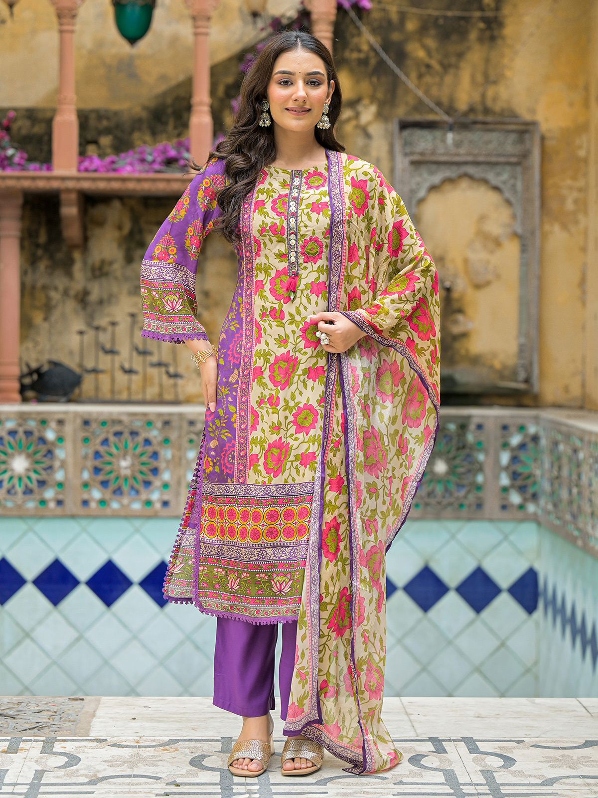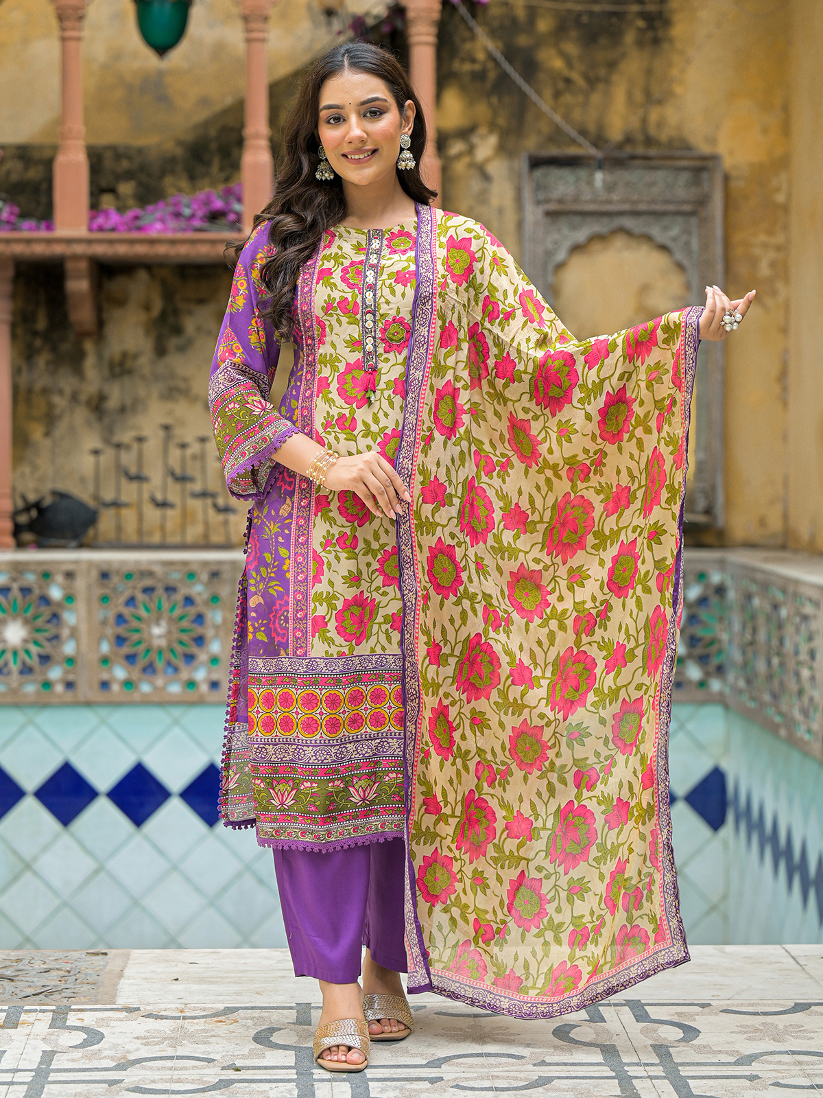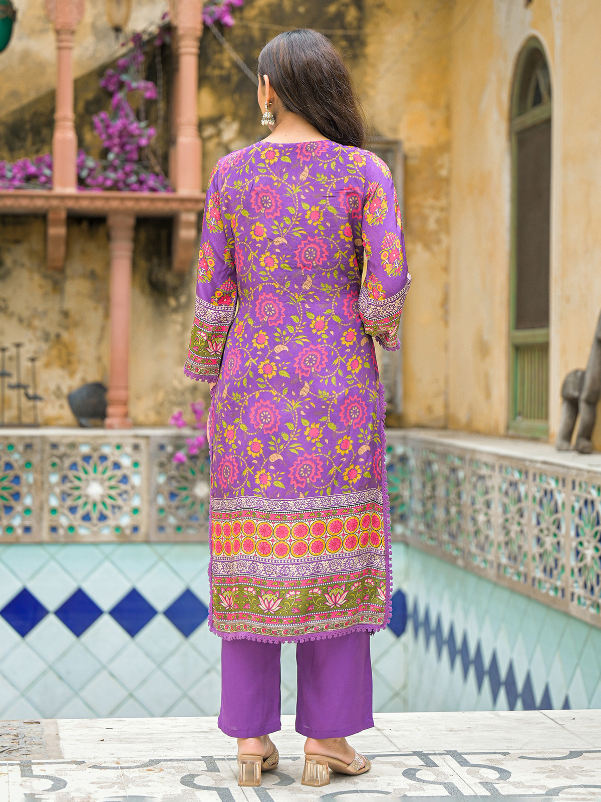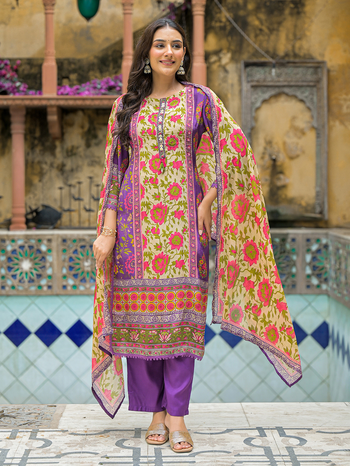 Crafted in opulent purple silk, this festive kurti set dazzles with sequins and beads. Featuring a round neckline and quarter sleeves, it comes with a dupatta and palazzo, offering a graceful balance of comfort, shine, and timeless beauty.