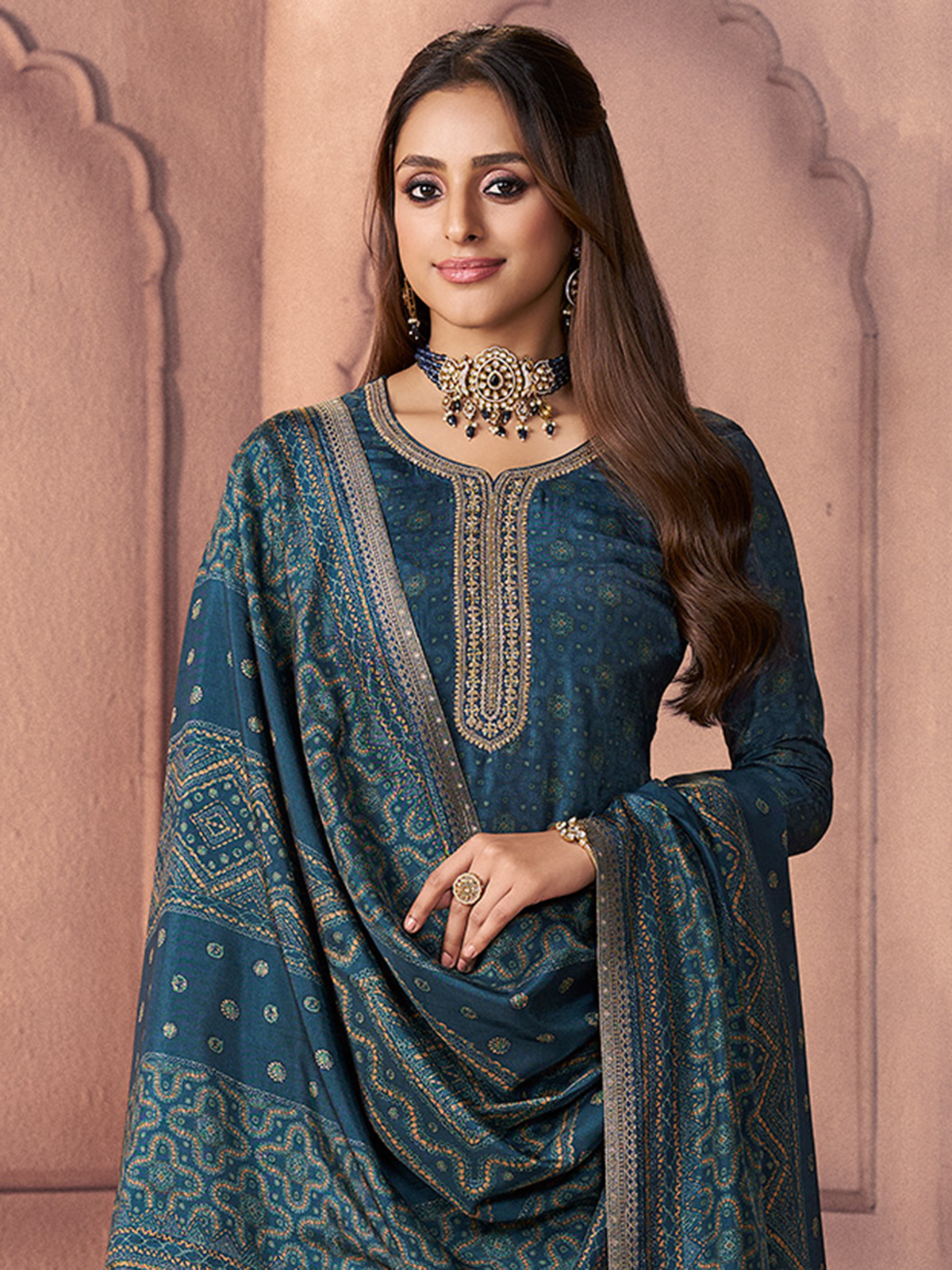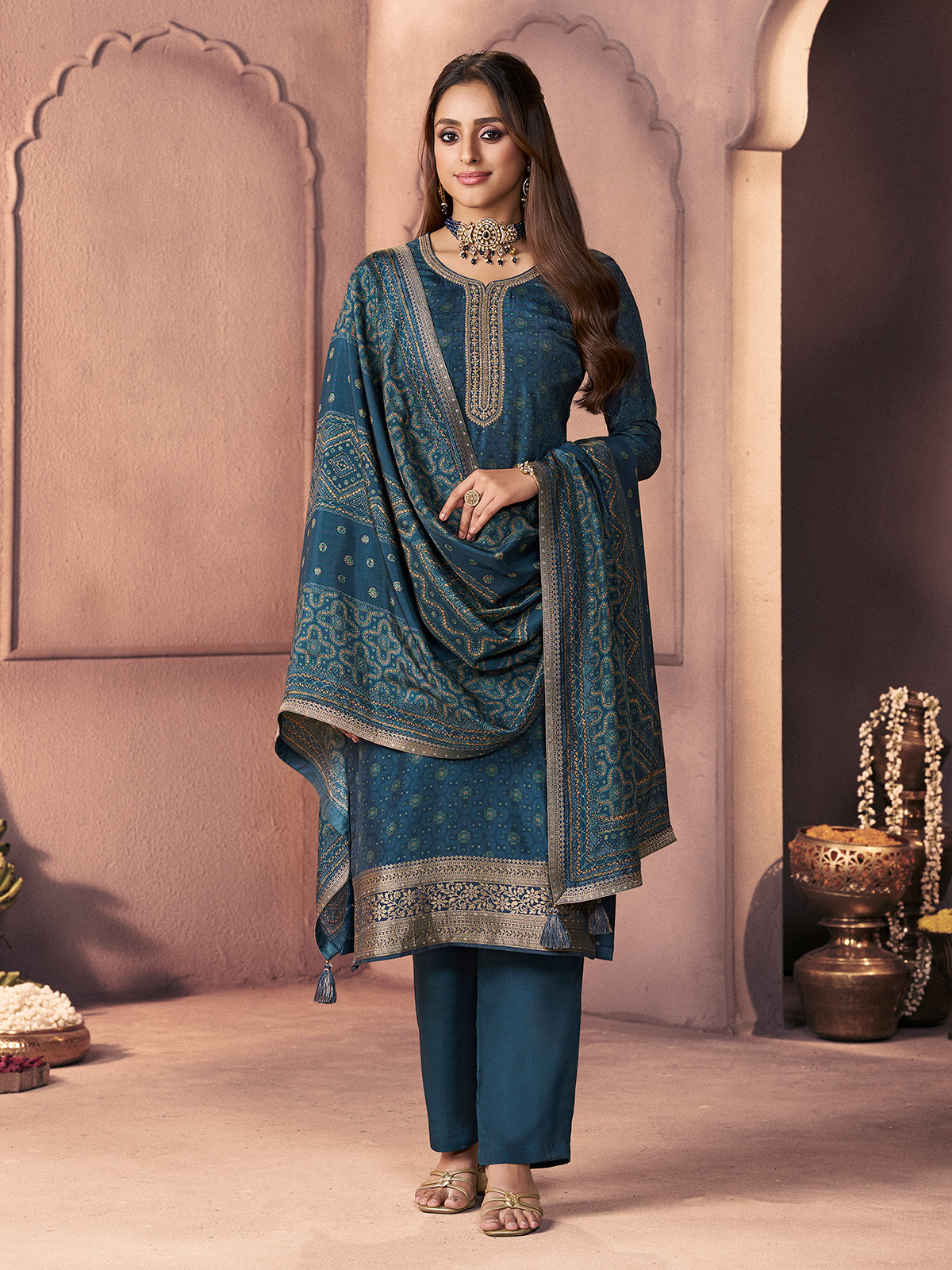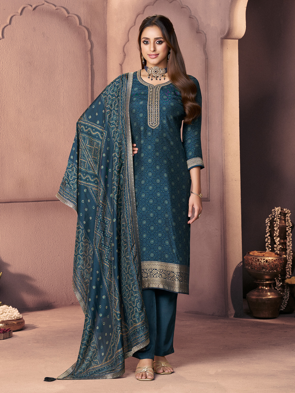 Radiating effortless grace and timeless femininity, this rama blue silk kurti set is designed to enhance the natural beauty of the woman. Crafted in rich silk, it brings a luxurious festive charm to your wardrobe. The kurti features a round neckline, quarter sleeves, and exquisite zari, resham, cutdana, and sequin work that adds refined sparkle. Ideal for Festival and eid celebrations, it comes paired with a comfortable pant and a beautifully coordinated dupatta.