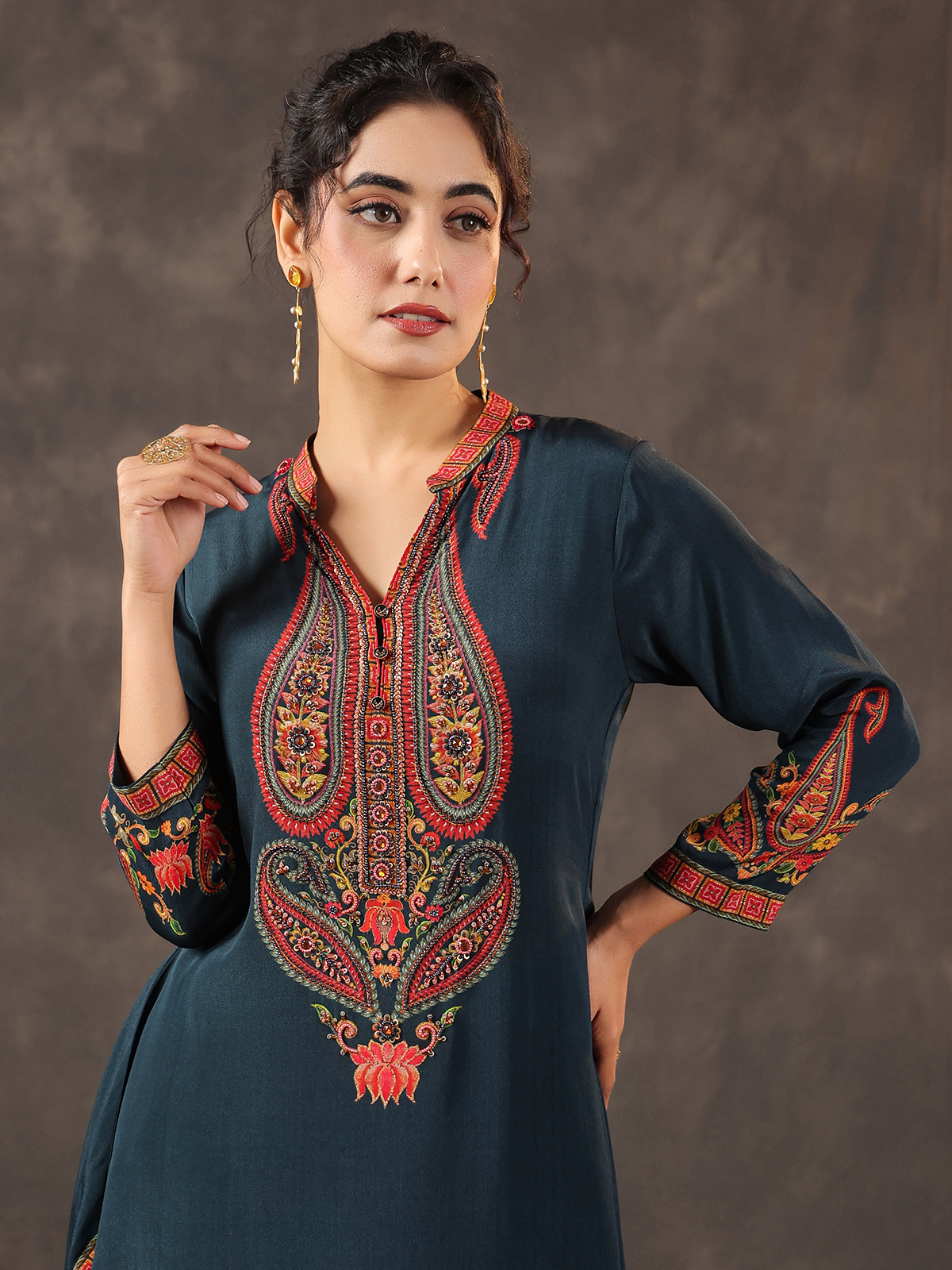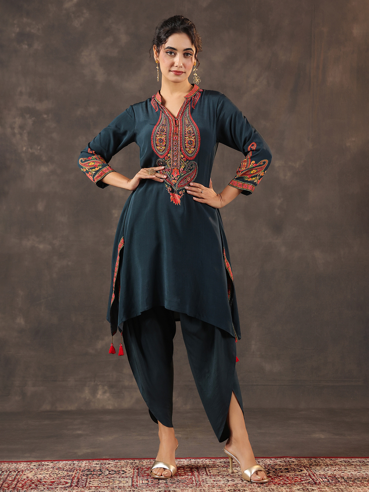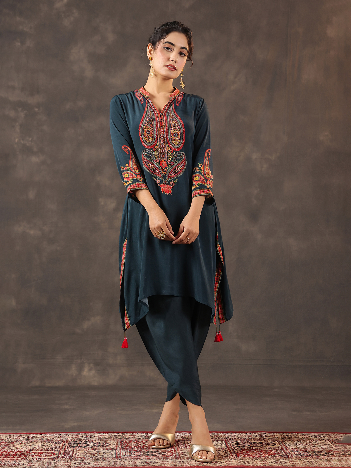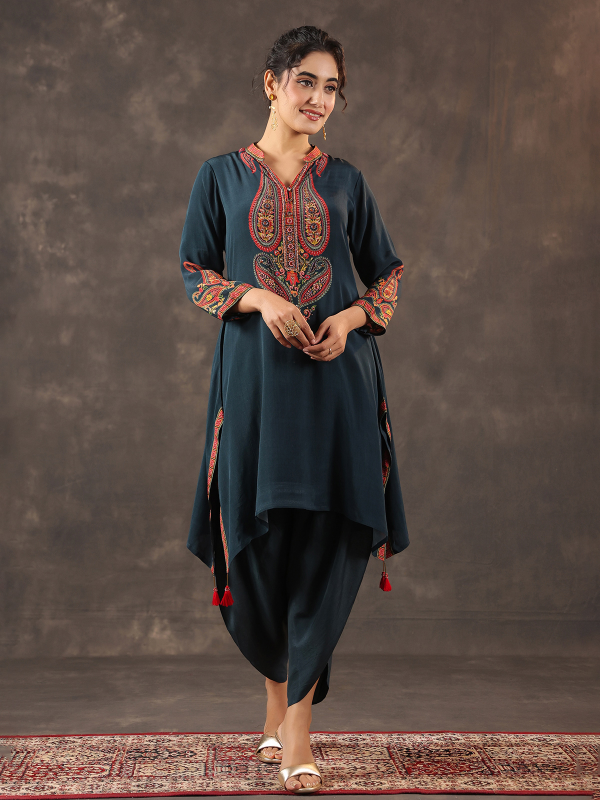 Bright and lively rama blue viscose crepe kurti set reflects modern ethnic style. The printed kurti features a collar neckline with quarter sleeves. Embellished with cutdana, sequins, beads and thread detailing. Styled with a fashionable dhoti bottom, the ensemble forms a contemporary festive silhouette perfect for casual celebrations.
