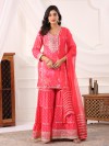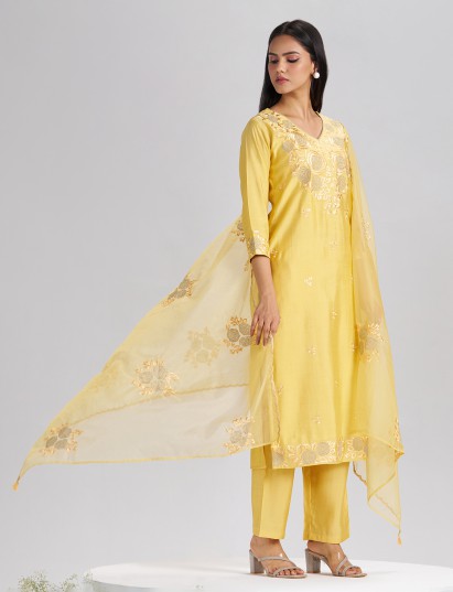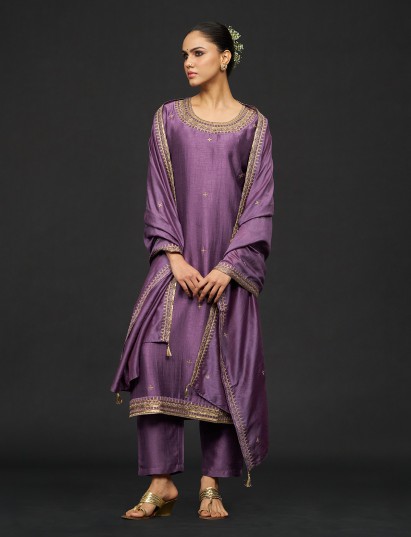 Dramatic in rama blue and wine silk, this kurti set showcases a printed design enhanced with cutdana, sequins, and beads. Paired with pant and dupatta, its round neckline and quarter sleeves give it regal festive appeal.