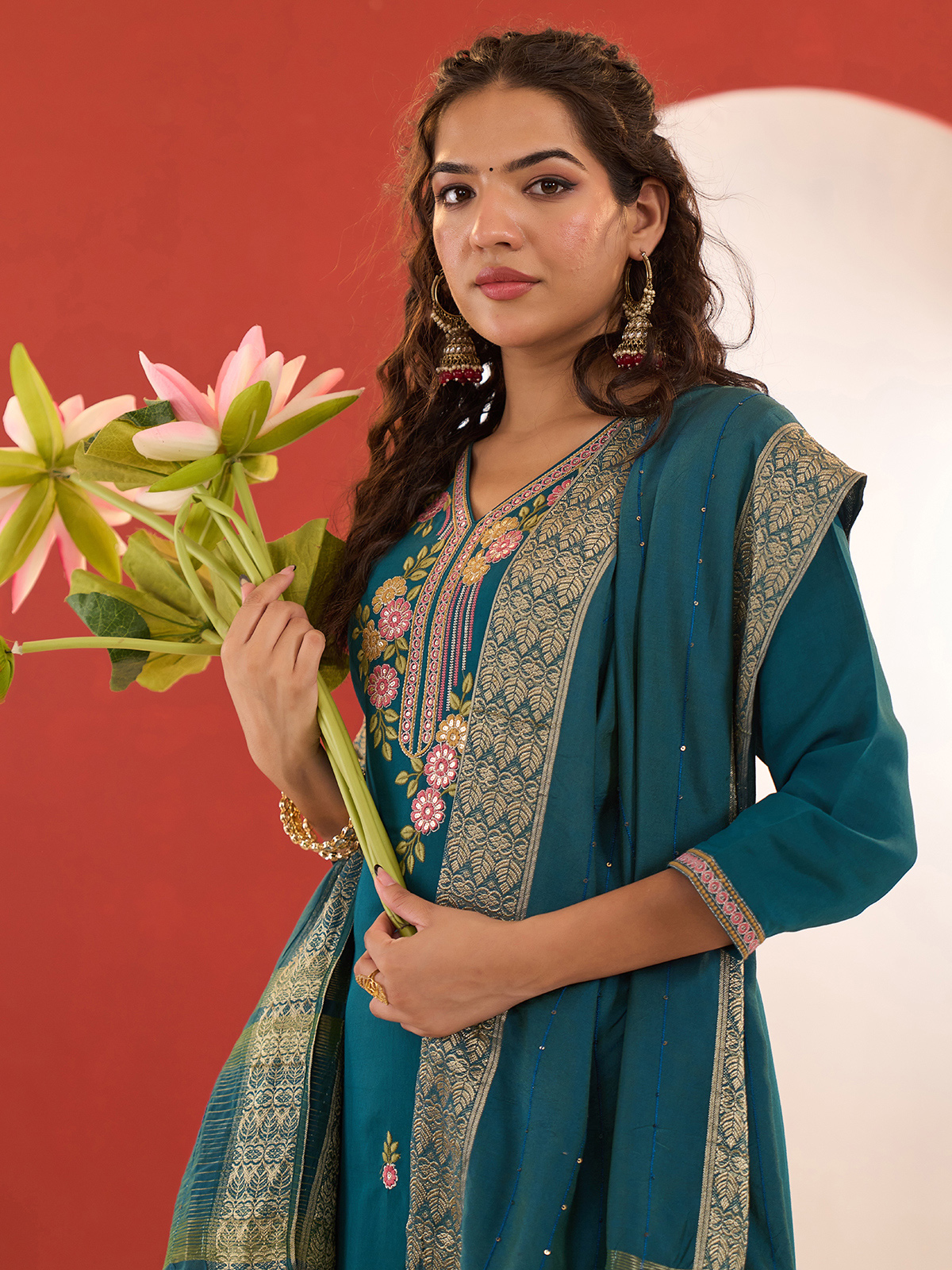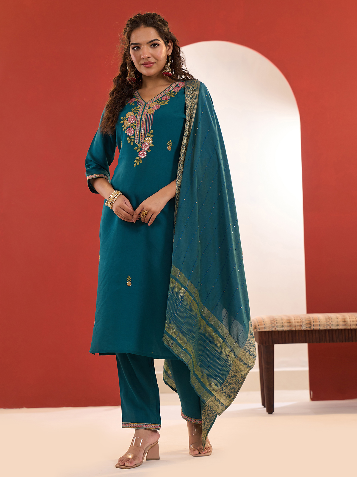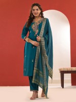 This rama green cotton silk kurti set features refined embroidery and delicate sequin work, paired with a coordinated dupatta. The V-neckline and quarter sleeves lend a sophisticated touch, making it a perfect festive ensemble that blends traditional artistry with everyday comfort.