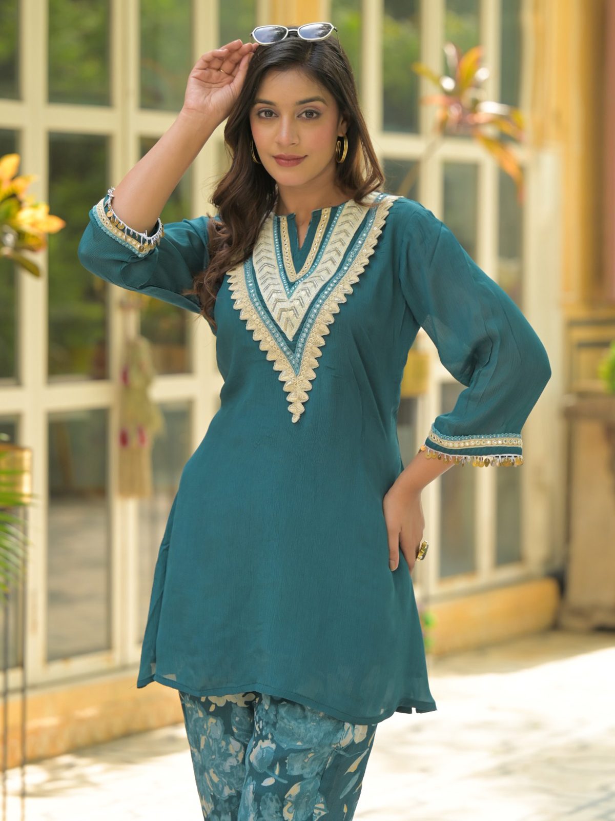 Charming in rama green cotton silk, this floral printed kurti set is elevated with patchwork accents. Designed with a V neckline, quarter sleeves, and pant, it makes a festive outfit that blends simplicity with graceful artistry.