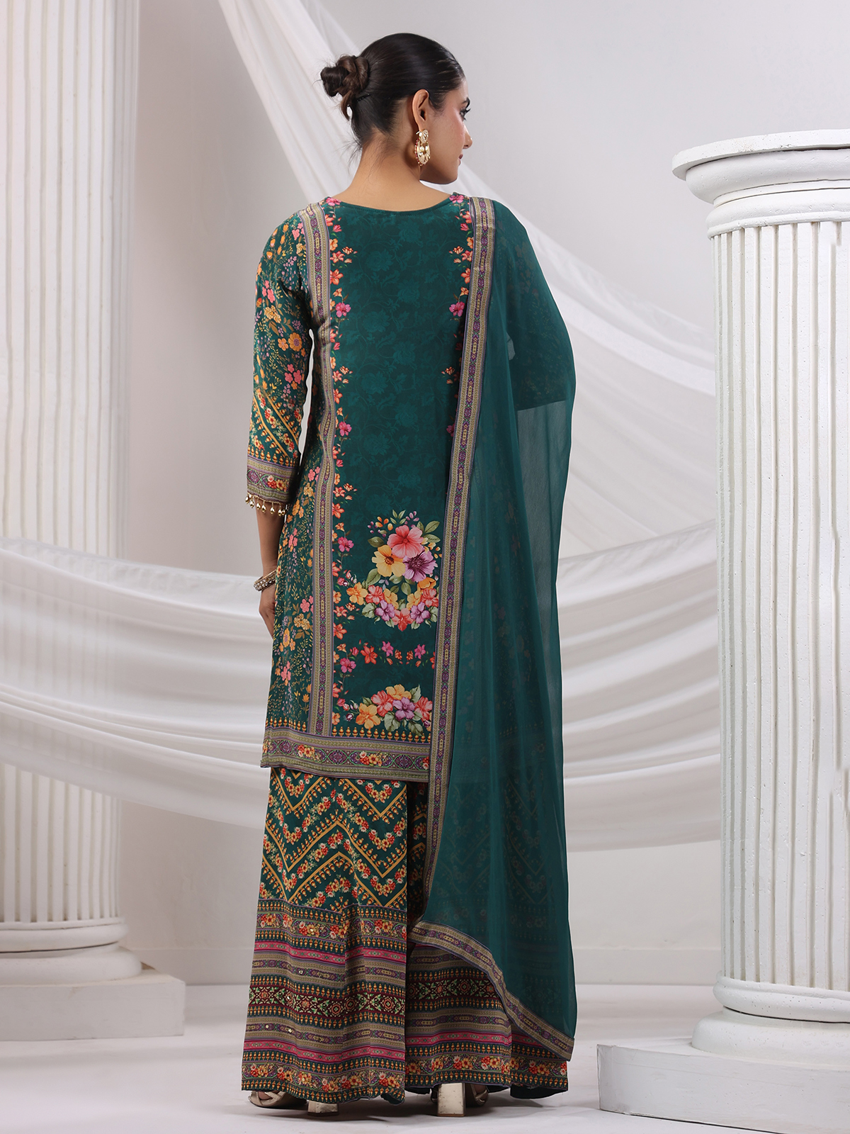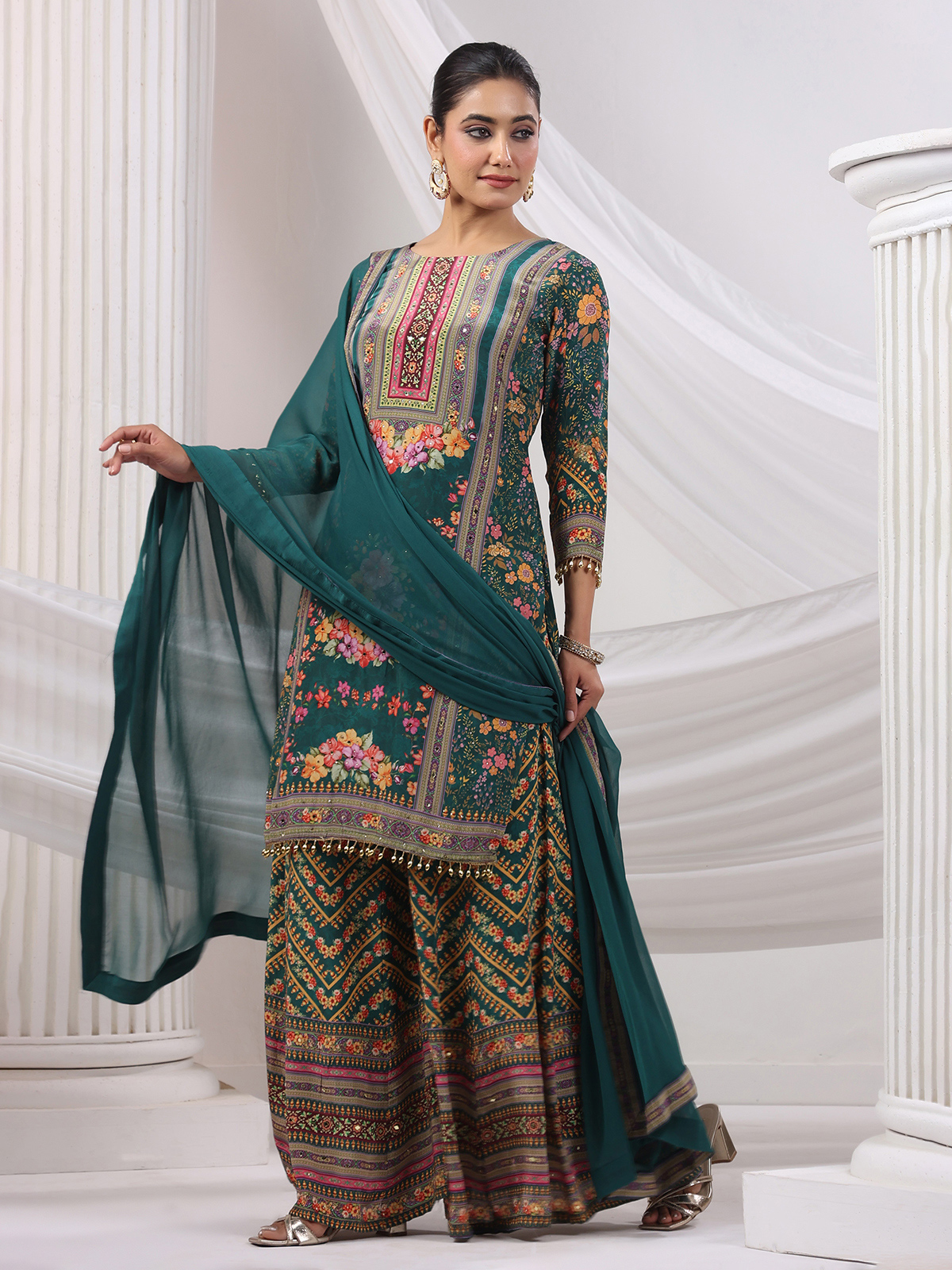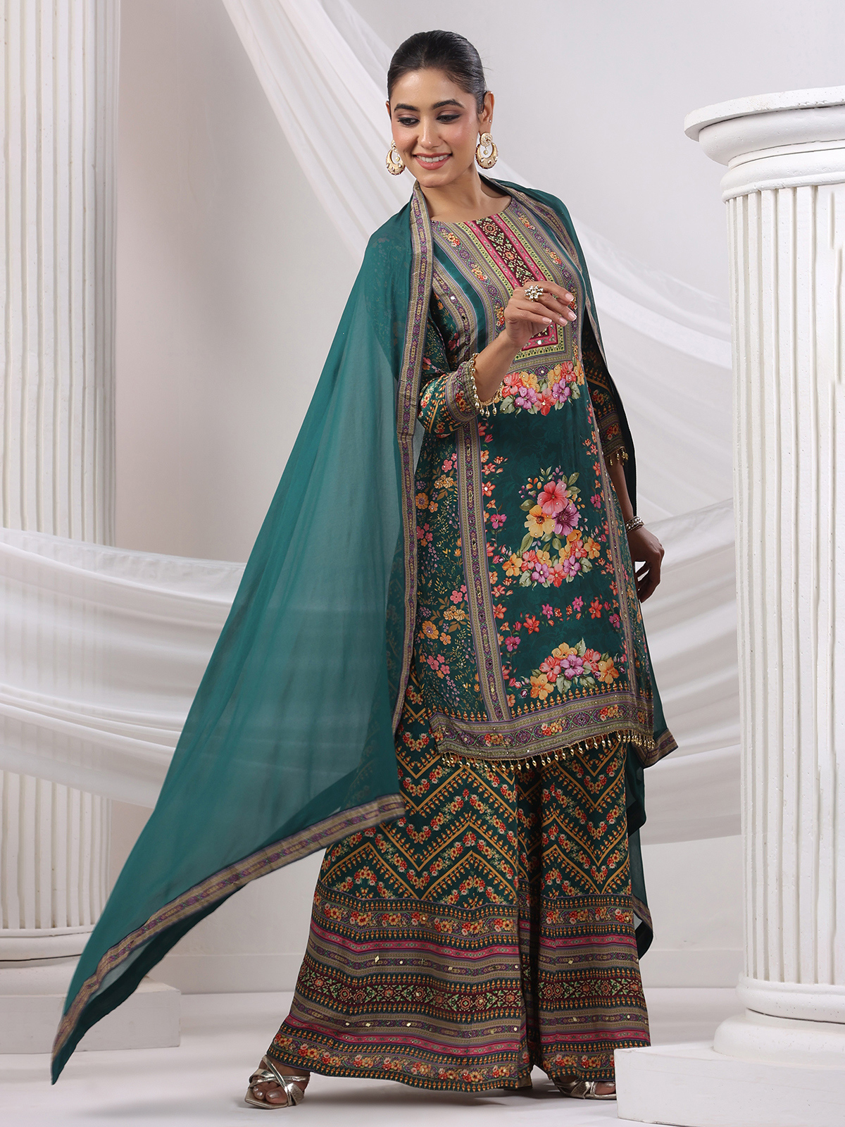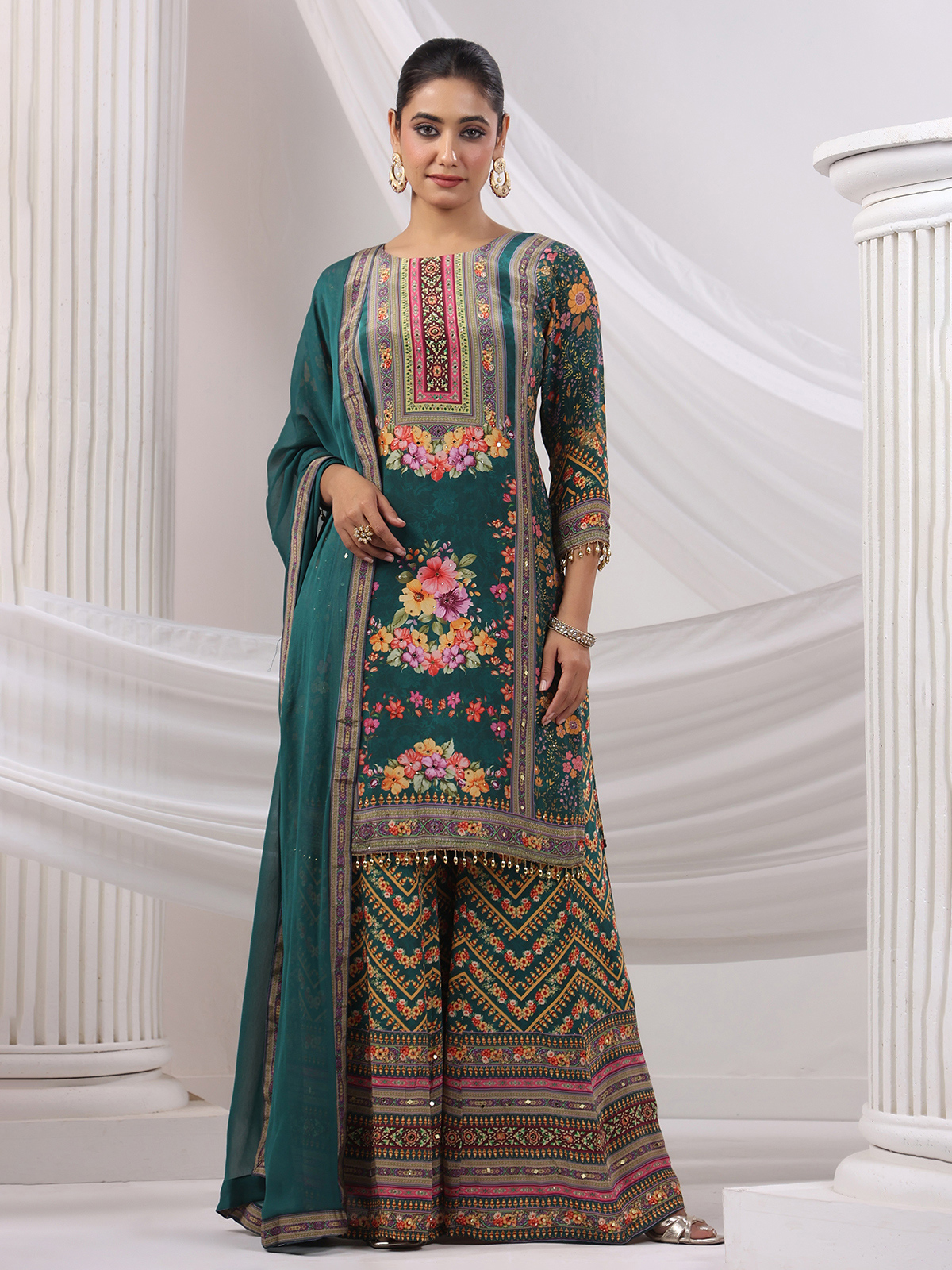 This rama green silk palazzo kurti set blooms with floral prints, embellished with mirror, stone, and tussle detailing. Featuring a round neckline and quarter sleeves, it is completed with a flowing palazzo and dupatta. A vibrant wedding or festive option that combines cultural charm with elegance.