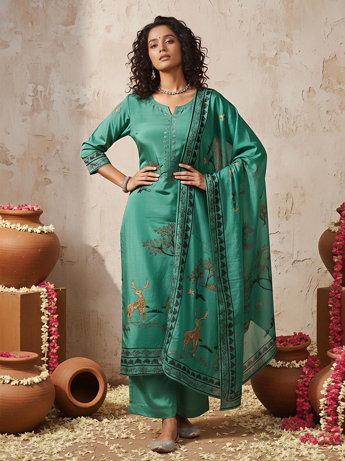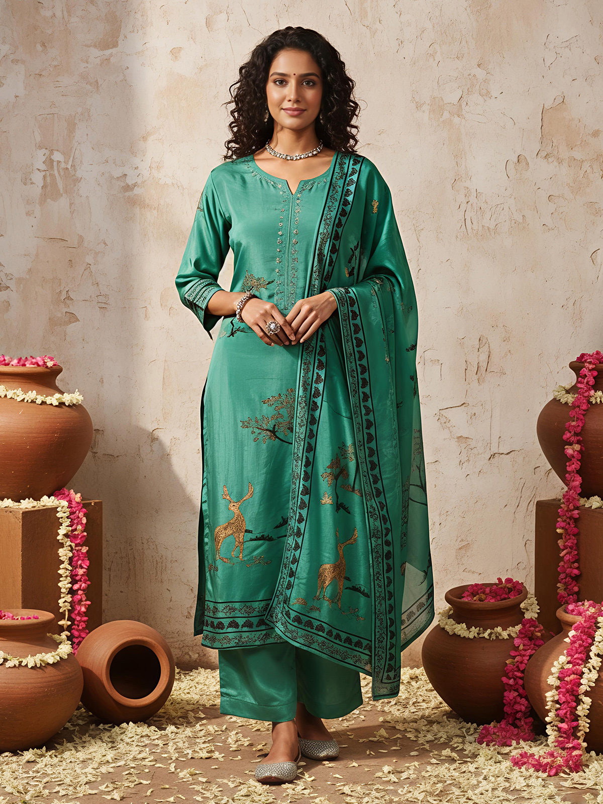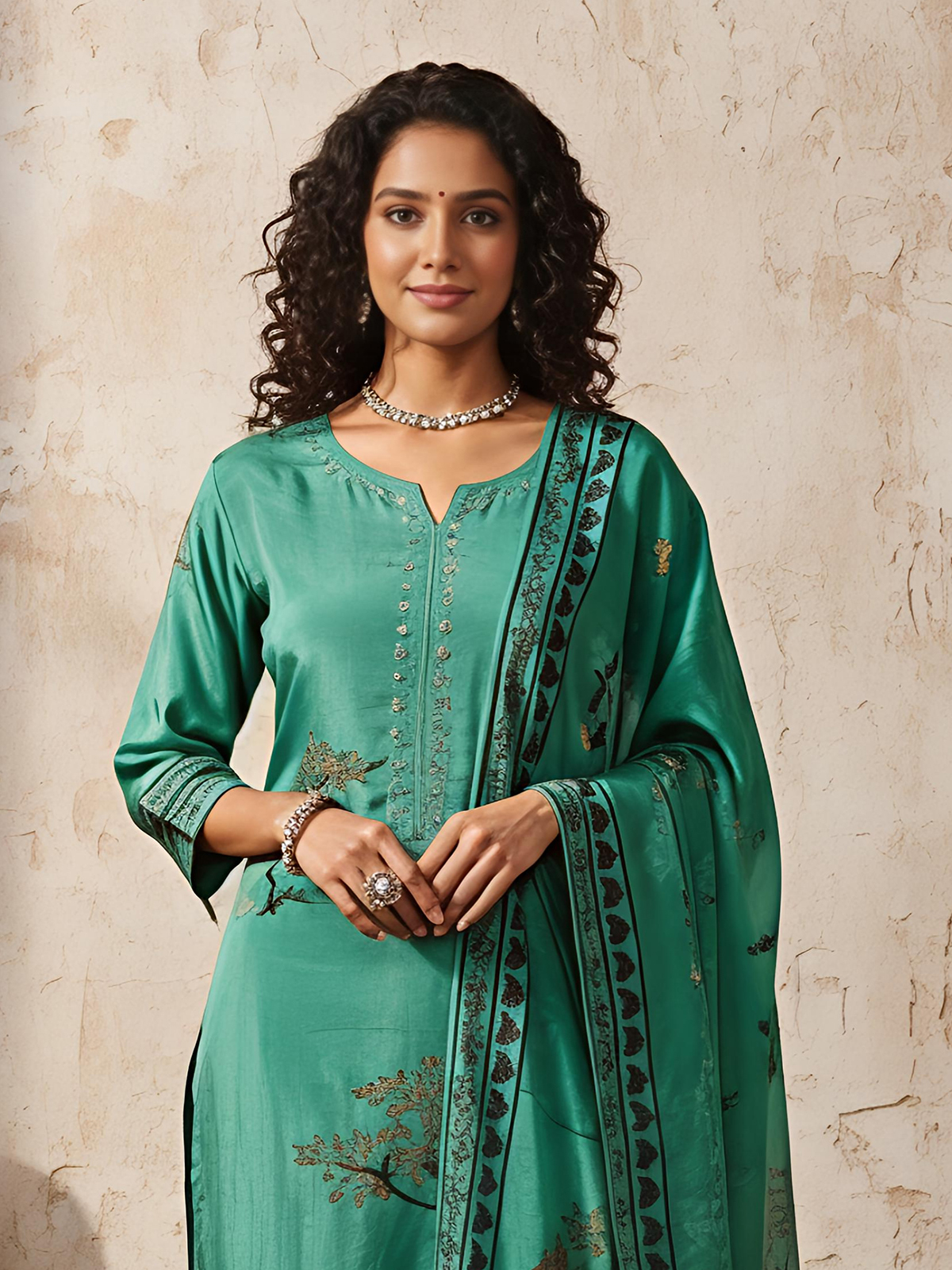 This rama green satin silk kurti set is detailed with refined thread embroidery and soft sequin accents over a printed base. Featuring a sweetheart neckline and quarter sleeves, it is paired with a palazzo and dupatta, suitable for festive and casual wear.