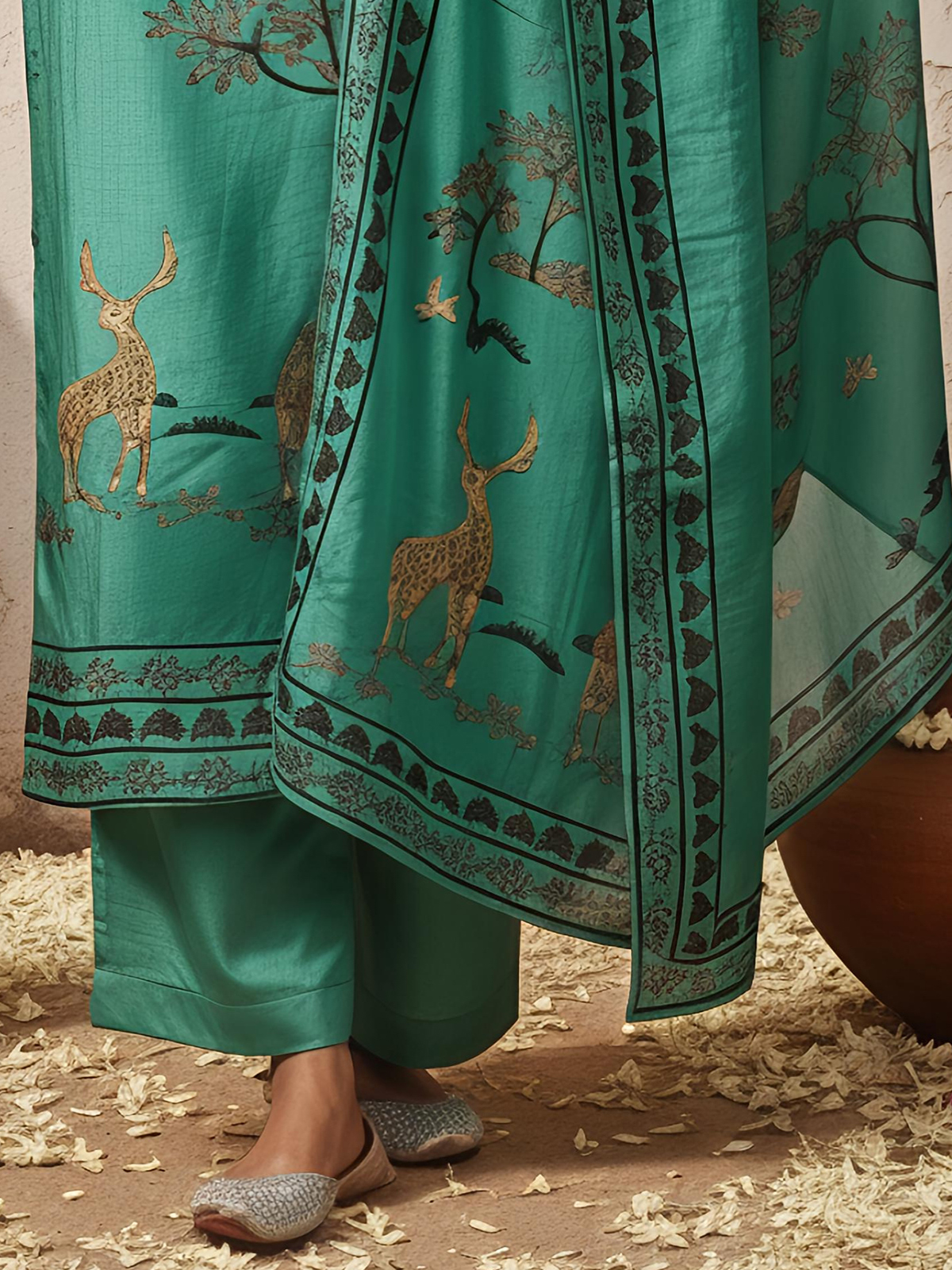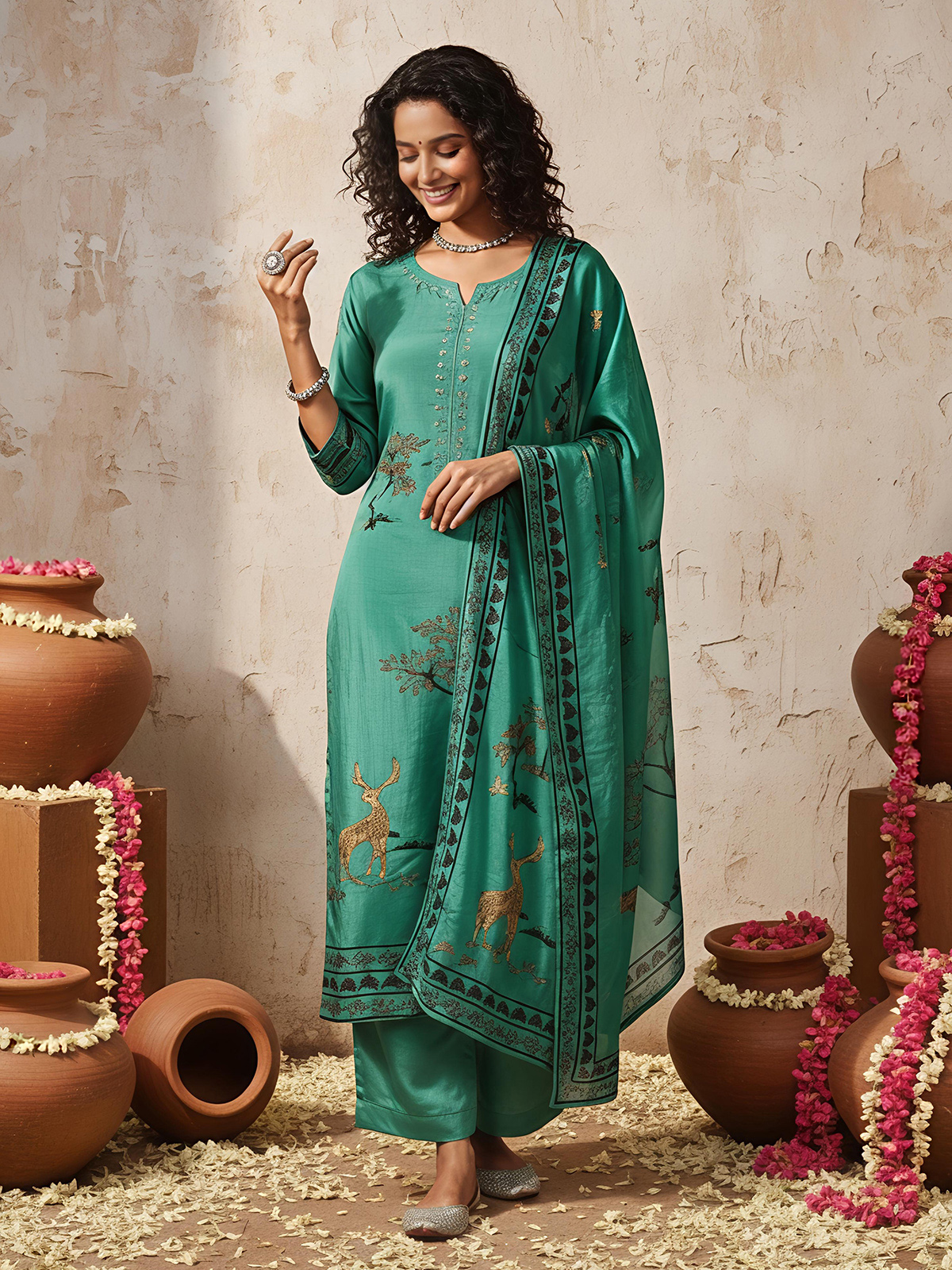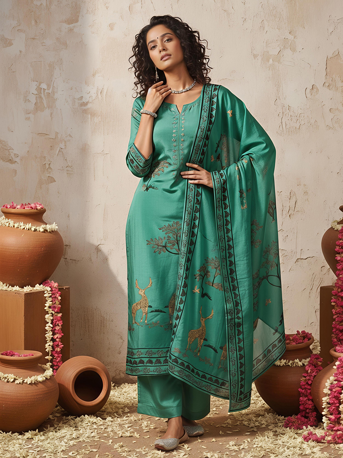 This rama green satin silk kurti set is detailed with refined thread embroidery and soft sequin accents over a printed base. Featuring a sweetheart neckline and quarter sleeves, it is paired with a palazzo and dupatta, suitable for festive and casual wear.