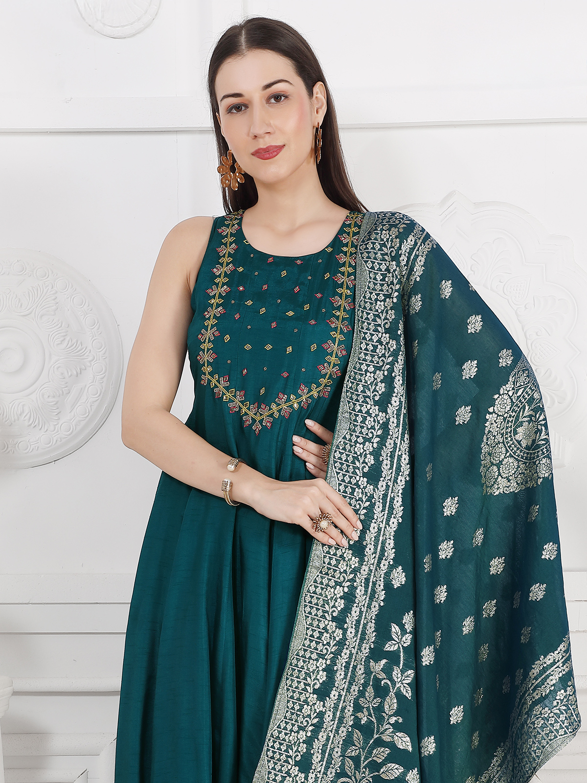 Rama green silk captures the spirit of grandeur in this captivating kurti set. Richly adorned with cutdana, beads, zari, and sequins, the round sleeveless neckline glimmers with royal brilliance. Balanced with palazzo and a zari-enhanced dupatta, it stands as a symbol of festive artistry, crafted for timeless elegance and radiant celebrations.