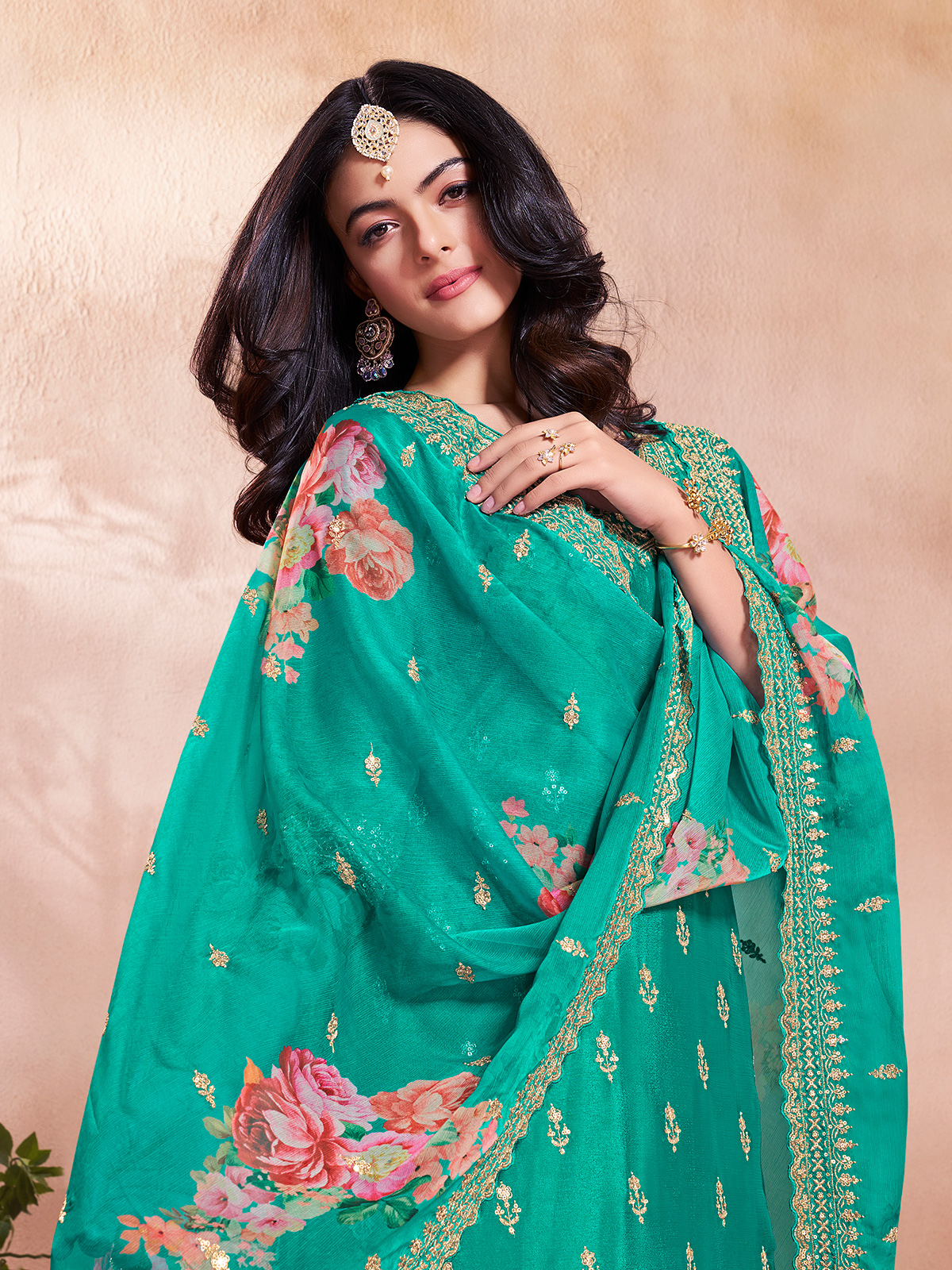 Shaped in smooth silk, this serene Rama green salwar suit carries a refined festive presence. Soft resham and sequins lend a modern radiance to the round neckline and quarter sleeves. The flowing palazzo adds airy comfort, while the thoughtfully printed dupatta introduces a delicate finishing touch to this graceful celebration-ready outfit.
