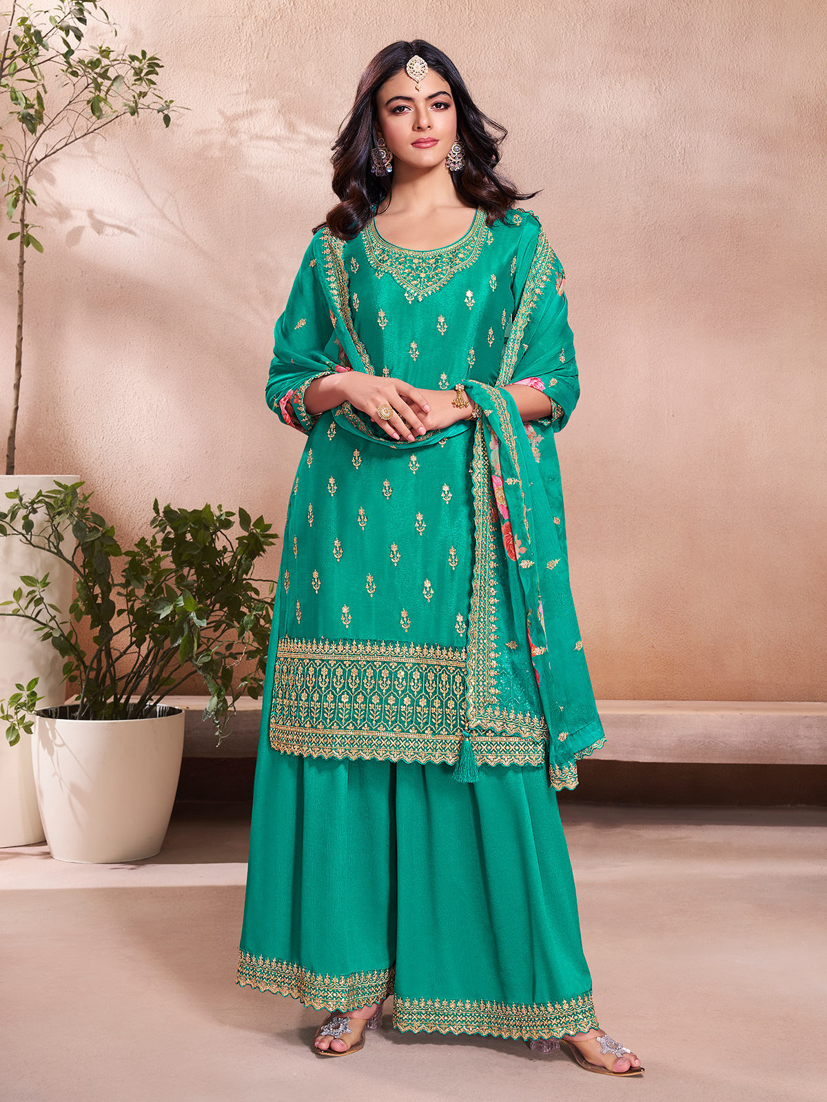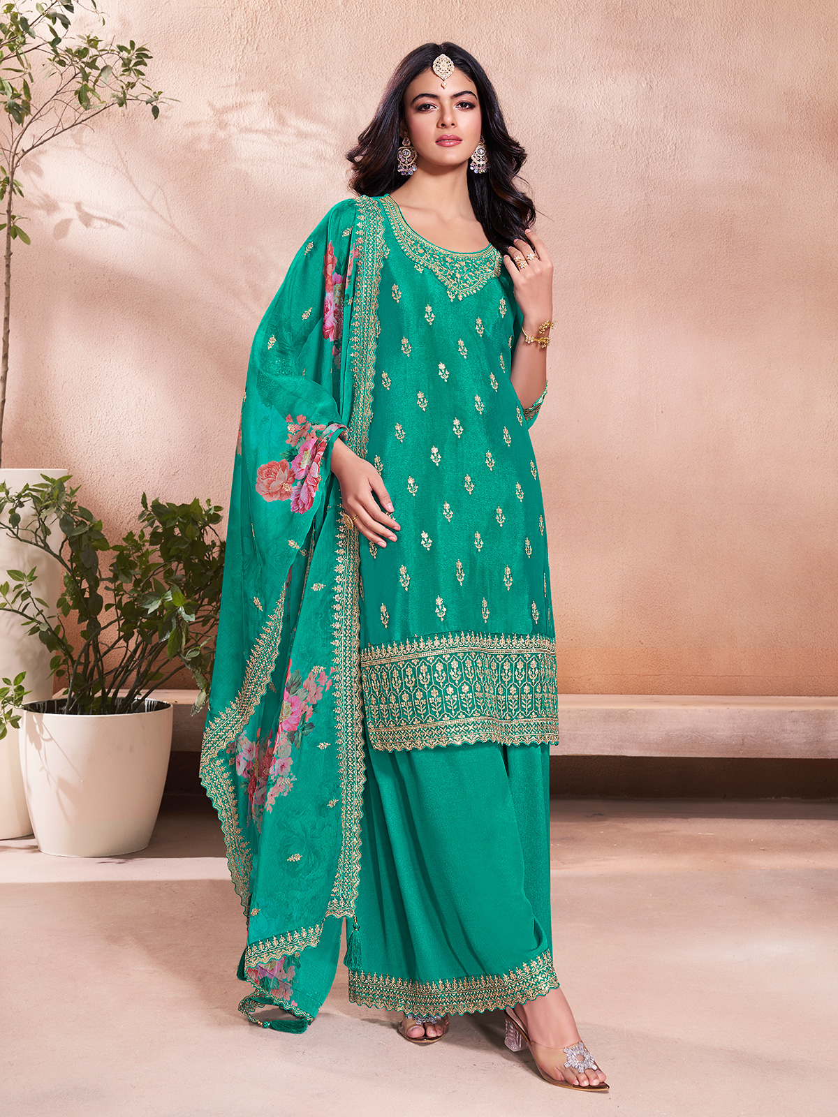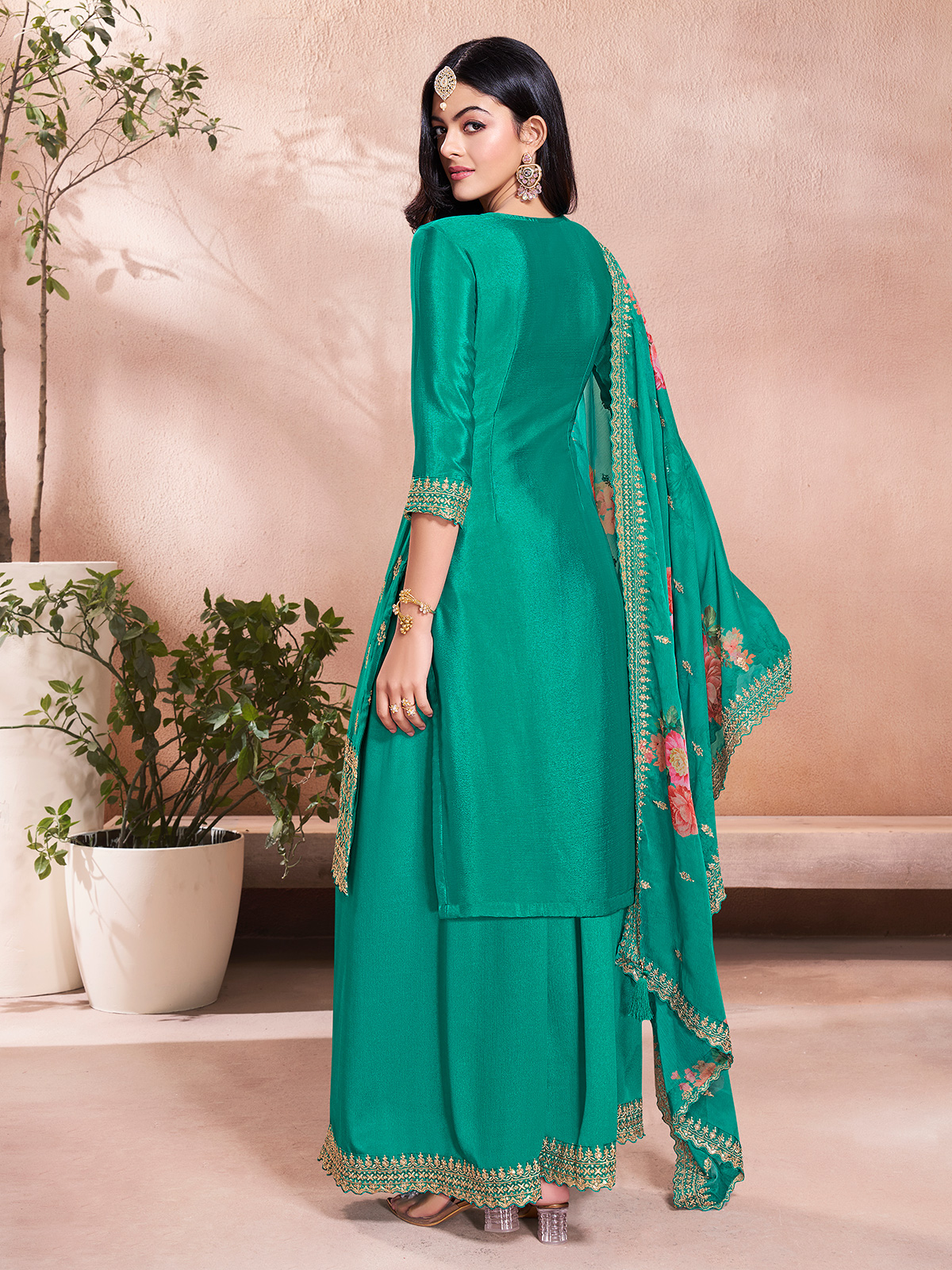 Rama Green Silk Palazzo Suit Paired With Printed Dupatta