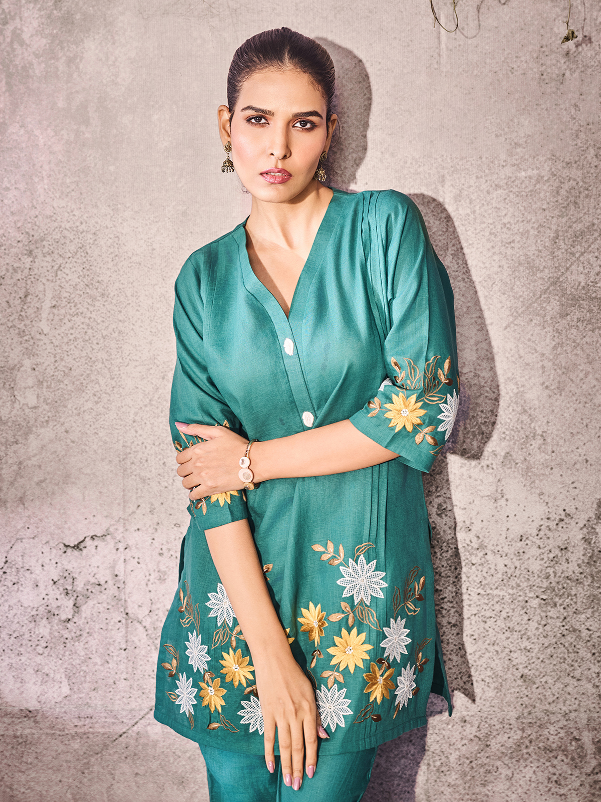 A refreshing rama green cotton canvas hosts delicate embroidery and prints that exude tranquil beauty. The V-neckline and quarter sleeves bring relaxed sophistication. Paired with pant and dupatta, it carries simplicity refined by festive serenity.