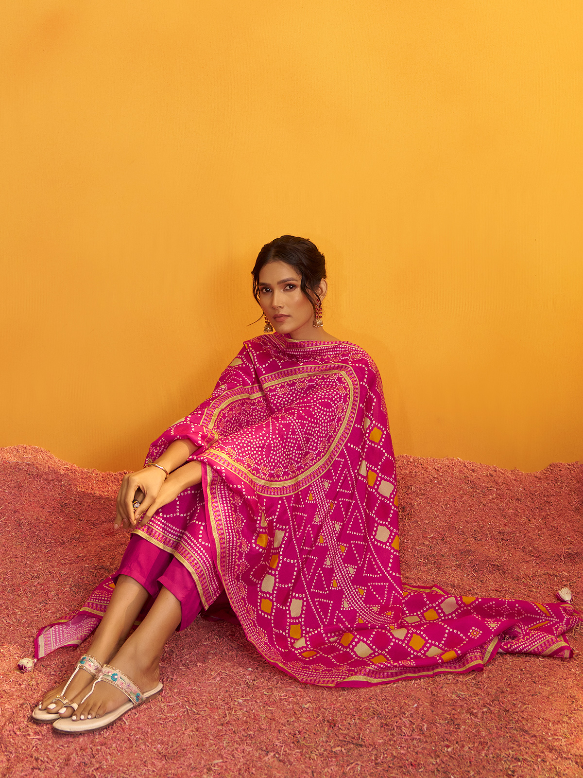 Rani Pink Bandhej Silk Yoke Kurti Set