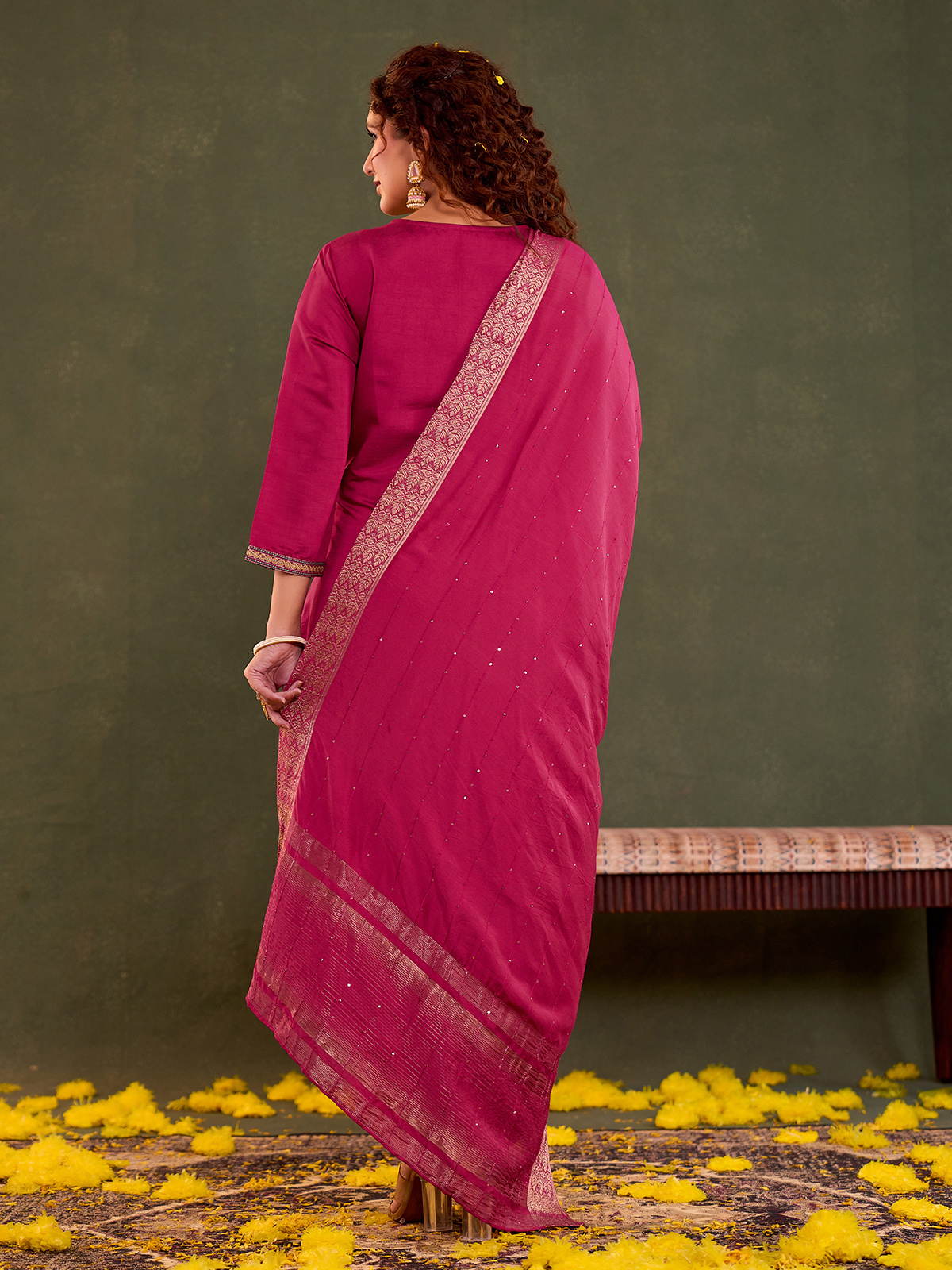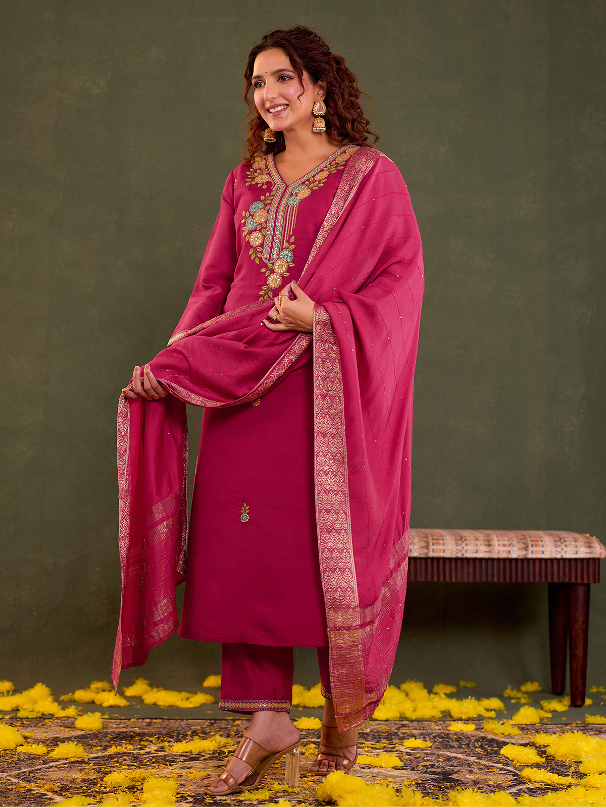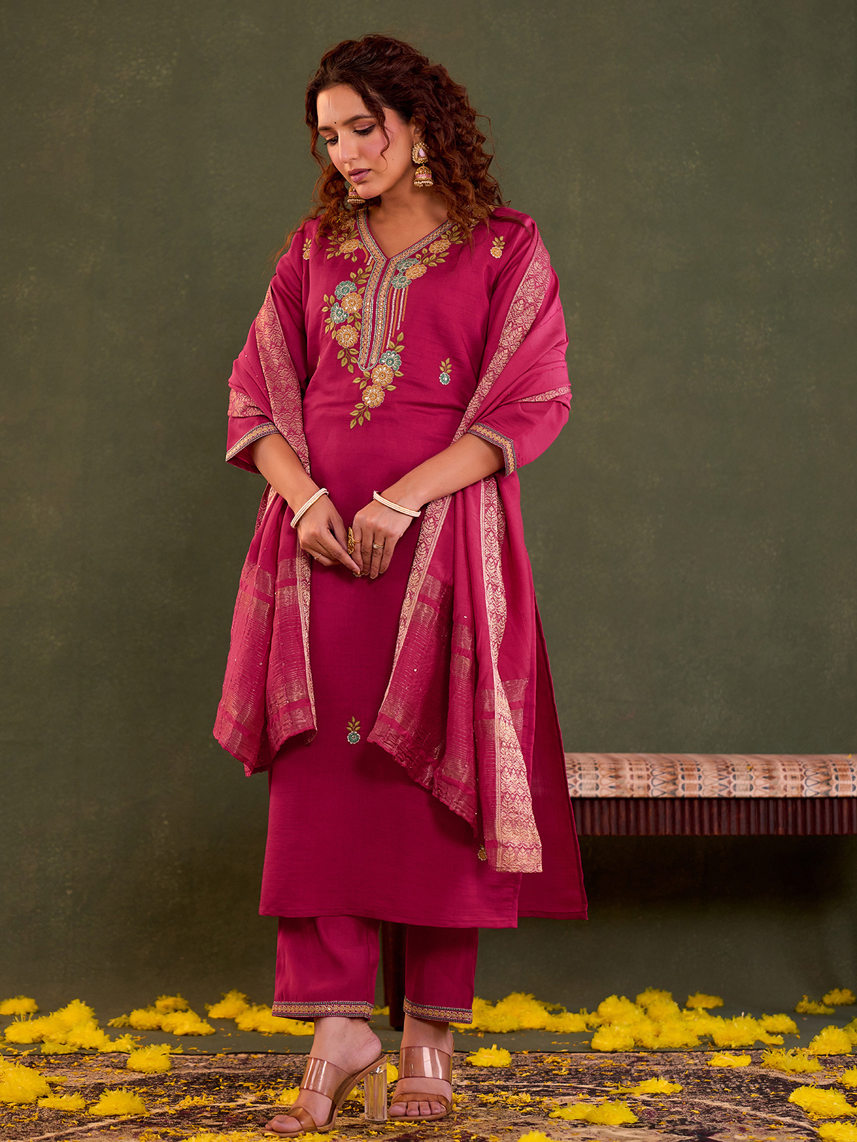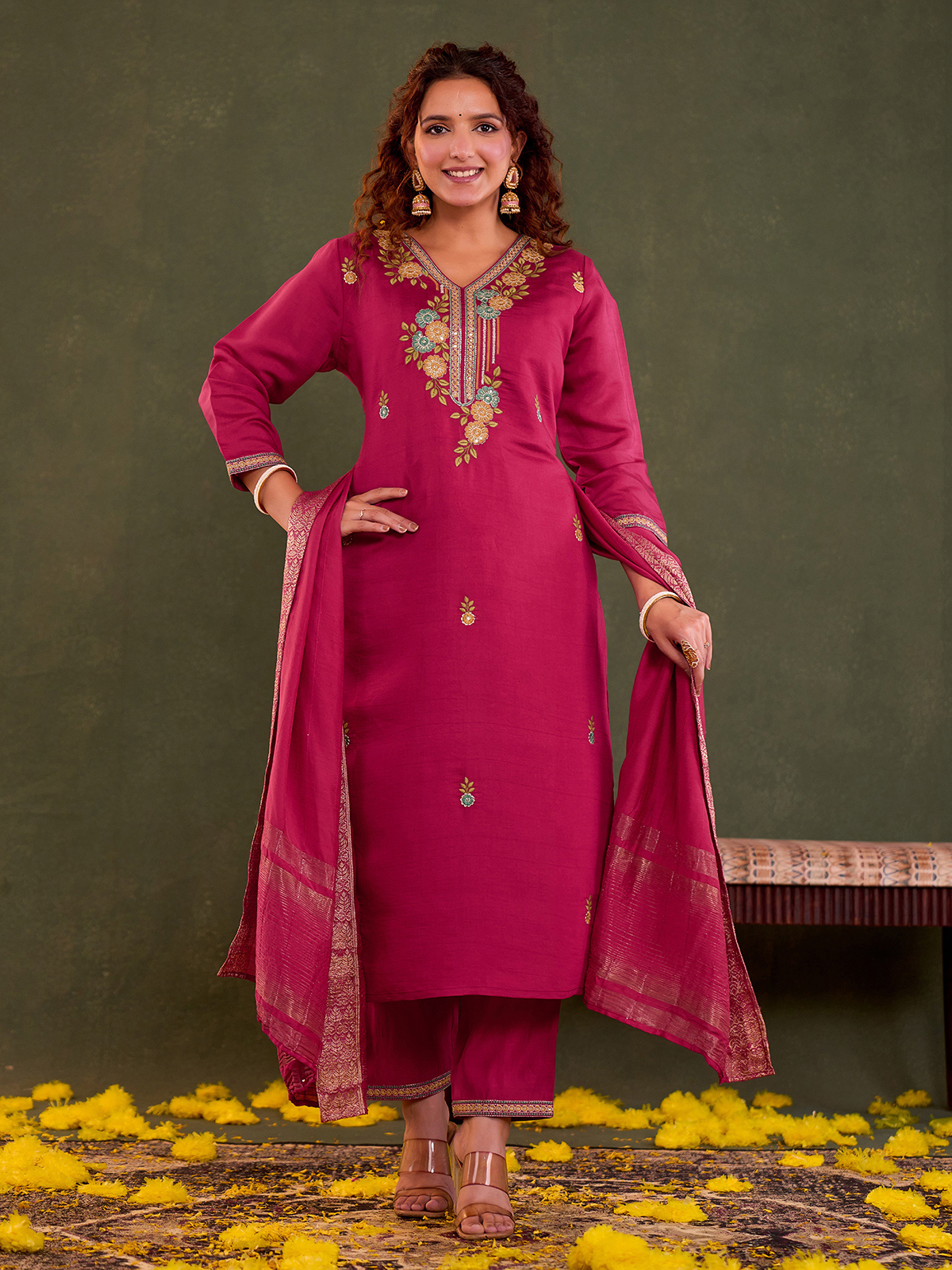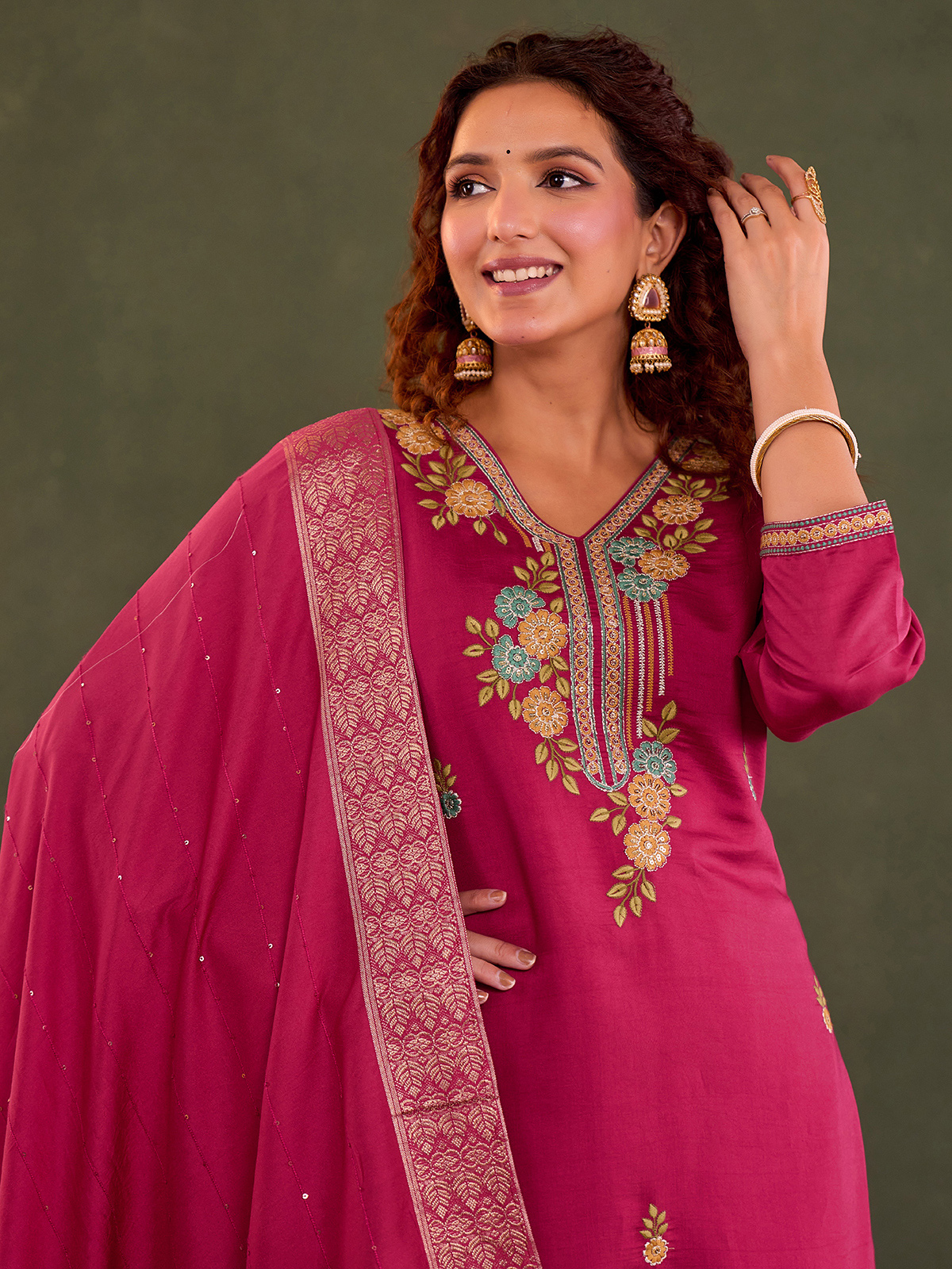 Elevate festive dressing with this rani pink cotton silk kurti set, detailed with fine embroidery and subtle sequin accents. Styled with a matching dupatta and pants, the V-neck and quarter sleeves offer a graceful silhouette with comfort and vibrant ethnic elegance.