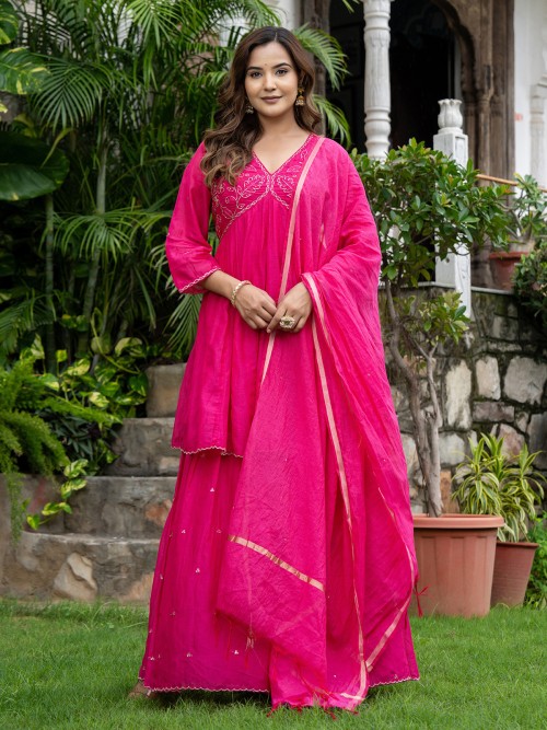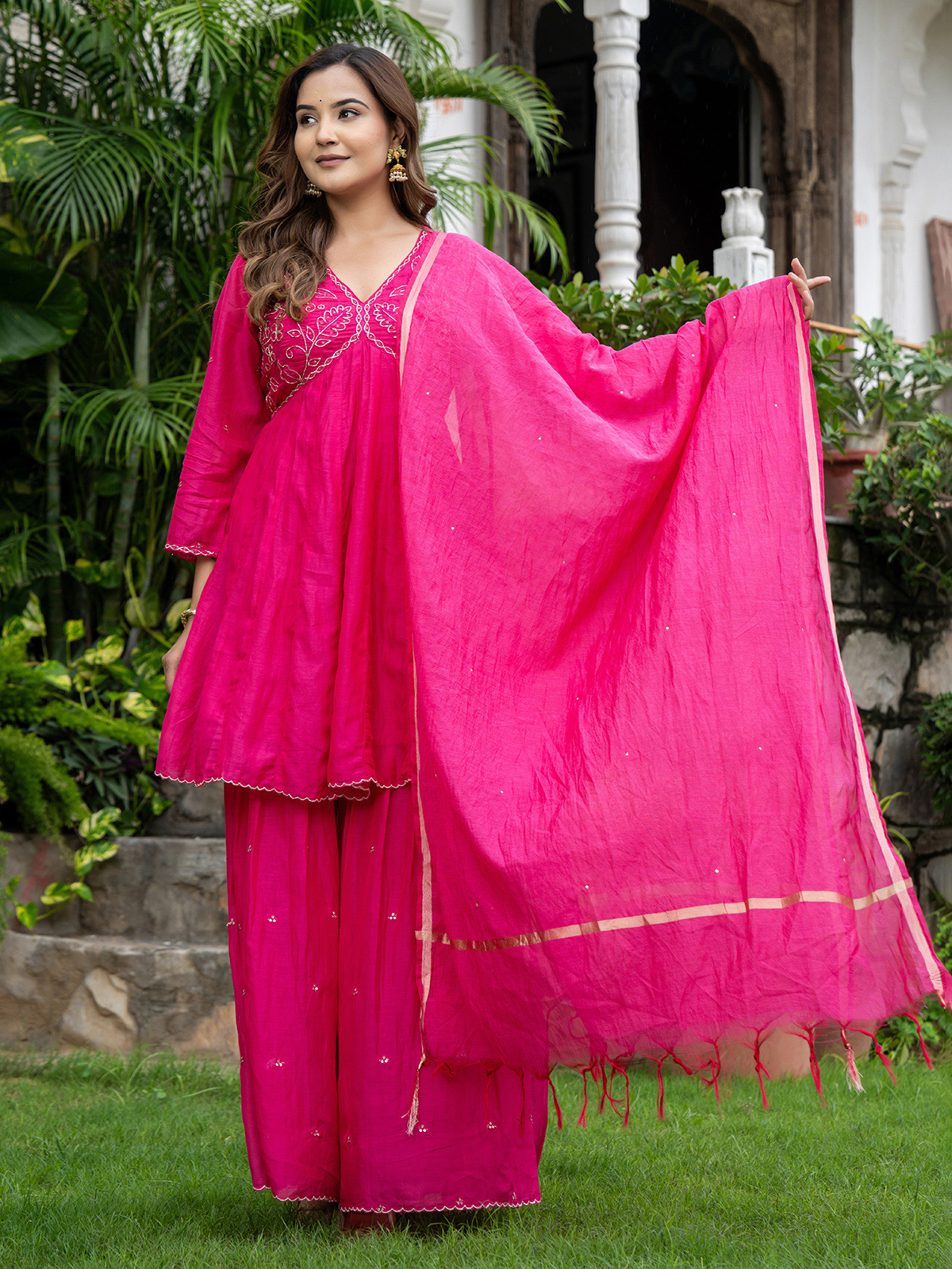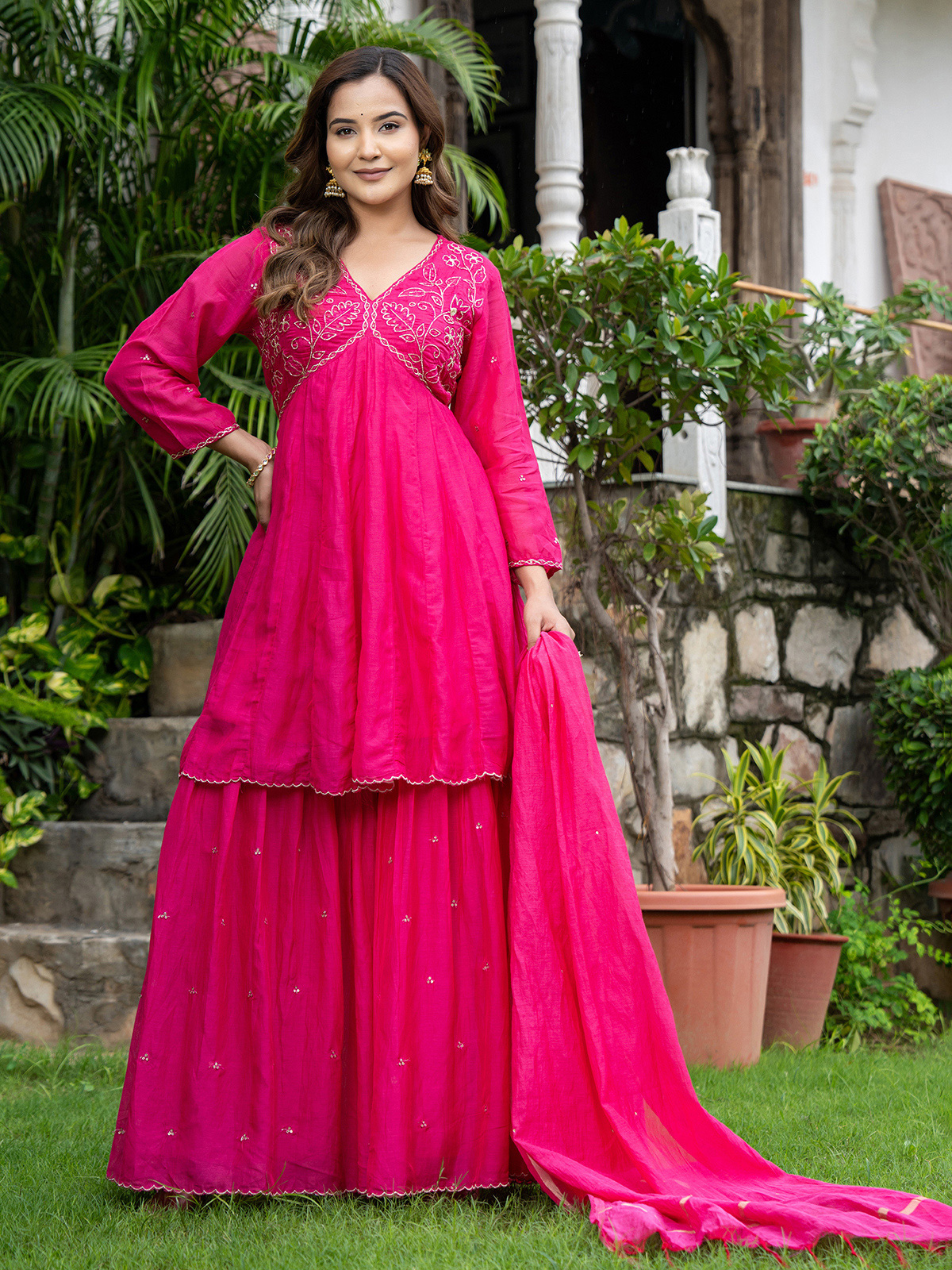 Vivid and celebratory, this rani pink cotton silk sharara kurti set is decorated with thread and sequins work. Styled with a V-neckline, quarter sleeves, and dupatta, it creates a festive look that combines cultural beauty with modern grace.