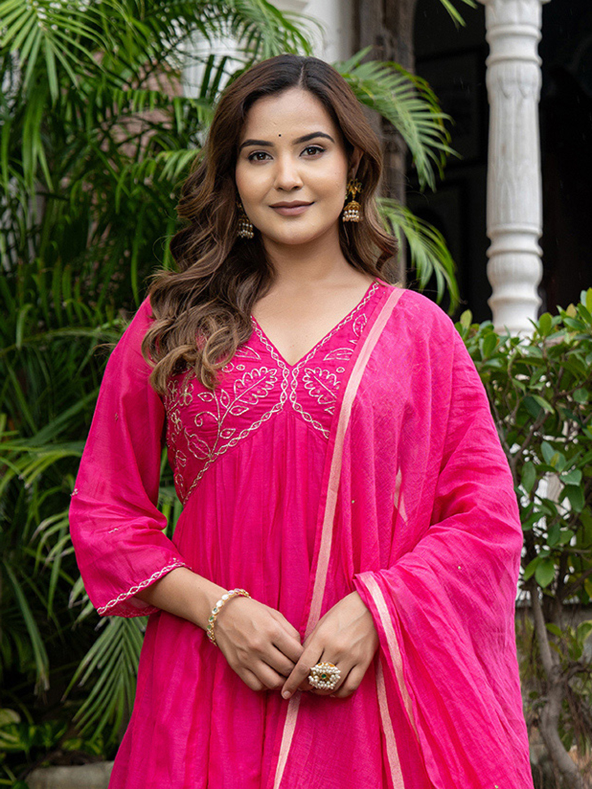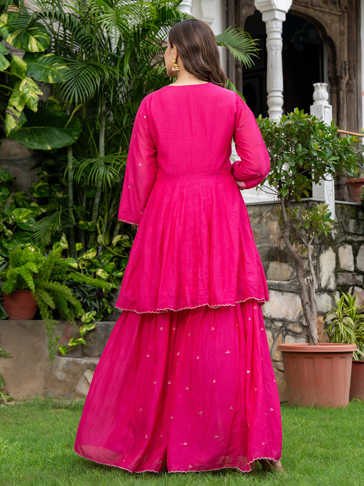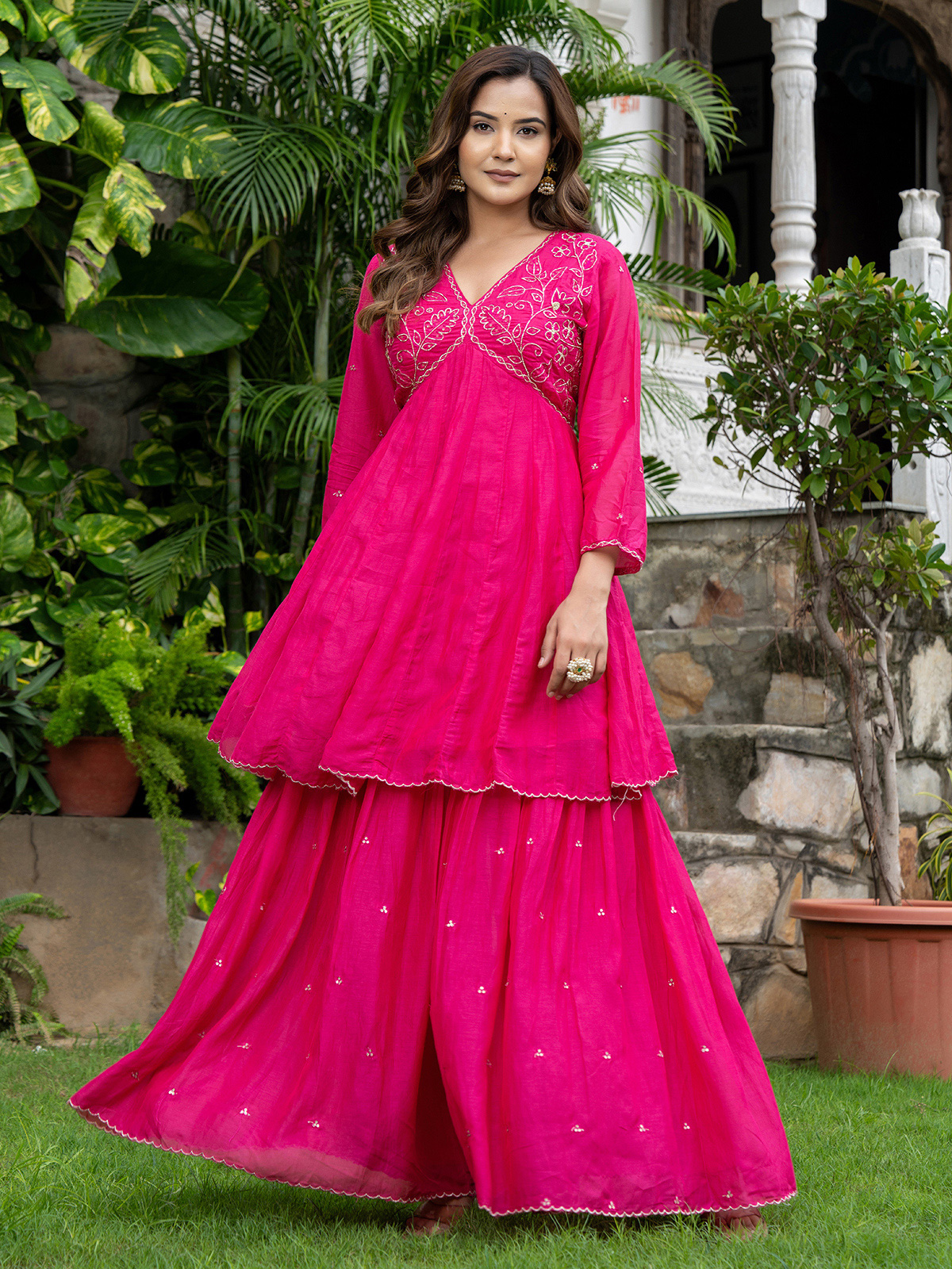 Vivid and celebratory, this rani pink cotton silk sharara kurti set is decorated with thread and sequins work. Styled with a V-neckline, quarter sleeves, and dupatta, it creates a festive look that combines cultural beauty with modern grace.