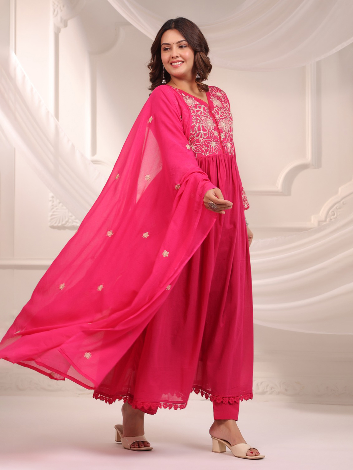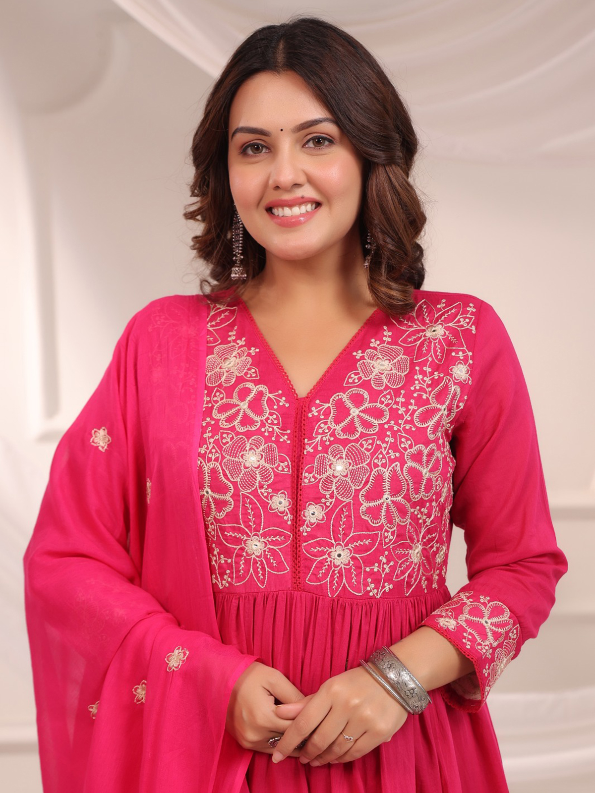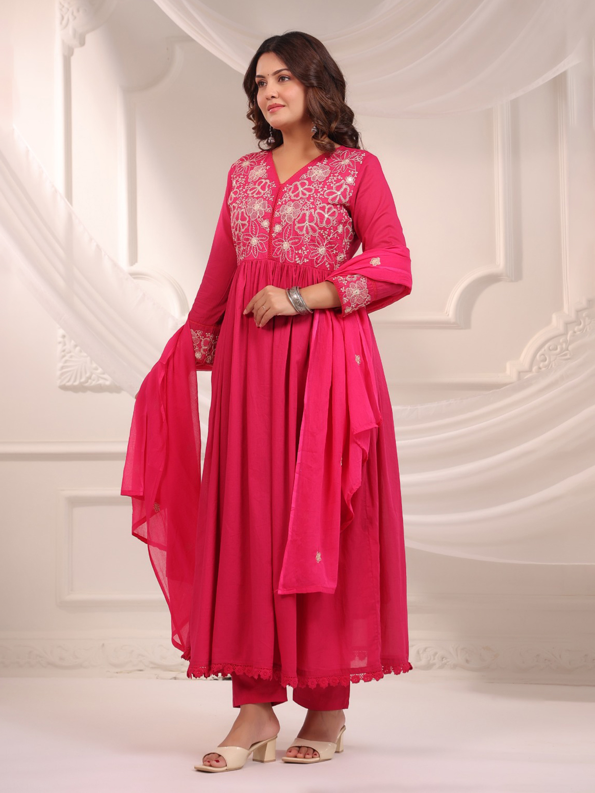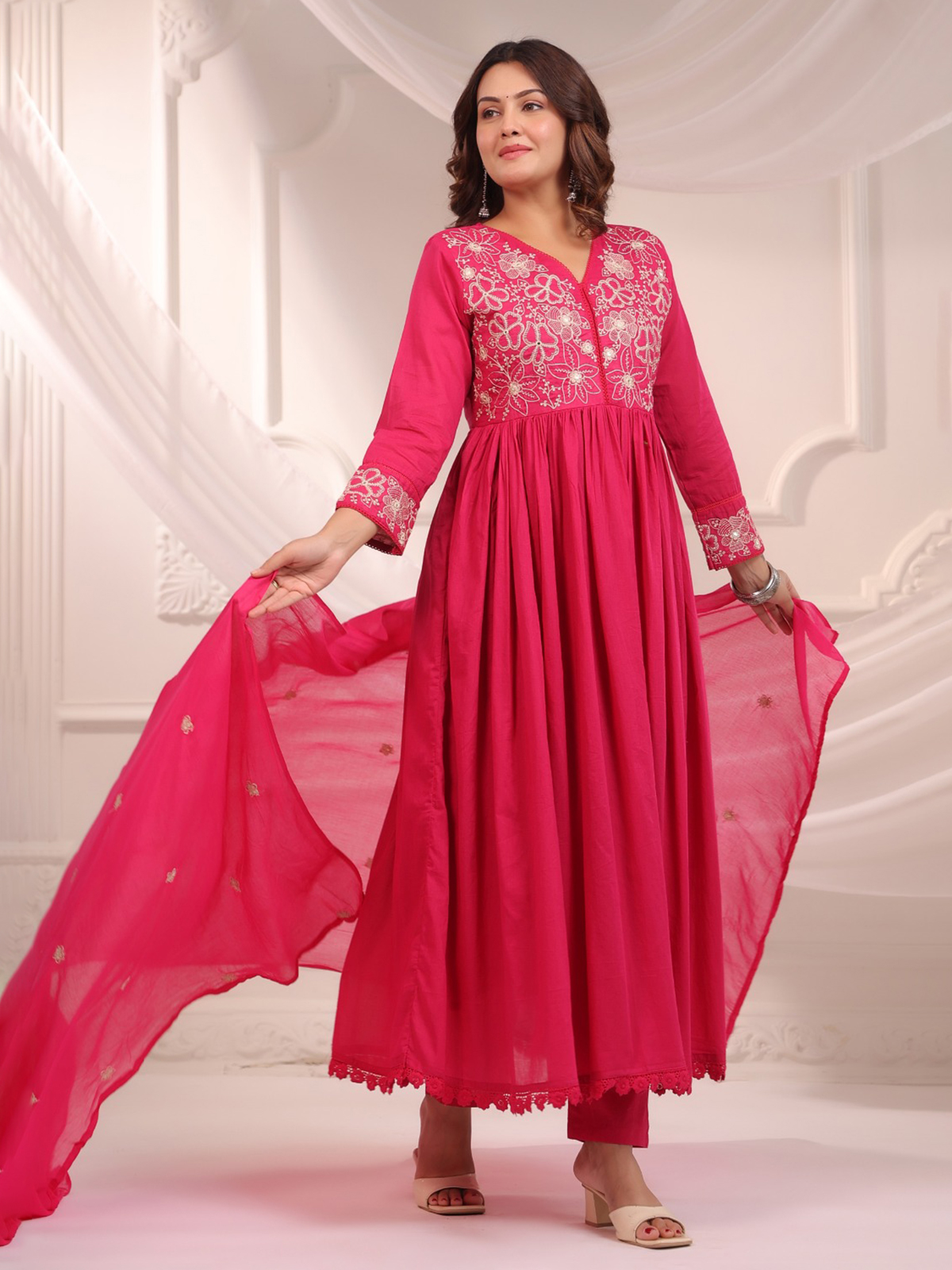 Radiating festive charm, this rani pink cotton silk kurti set showcases delicate embroidery and aabla detailing in a bodice-style silhouette. The flattering V-neckline and quarter sleeves are paired with a pant and dupatta, creating a vibrant look for celebrations and stylish daytime outings.