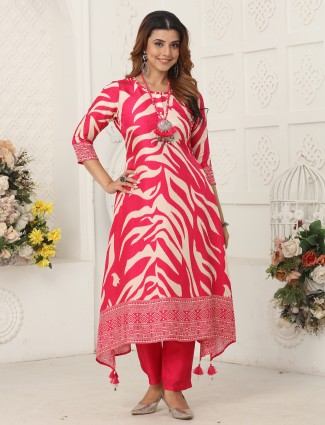 The rani pink russian silk kurti set offers a calm and simple print design, making it an ideal choice for festive wear. This set includes a round neckline, three quarter sleeves, and coordinating pants.