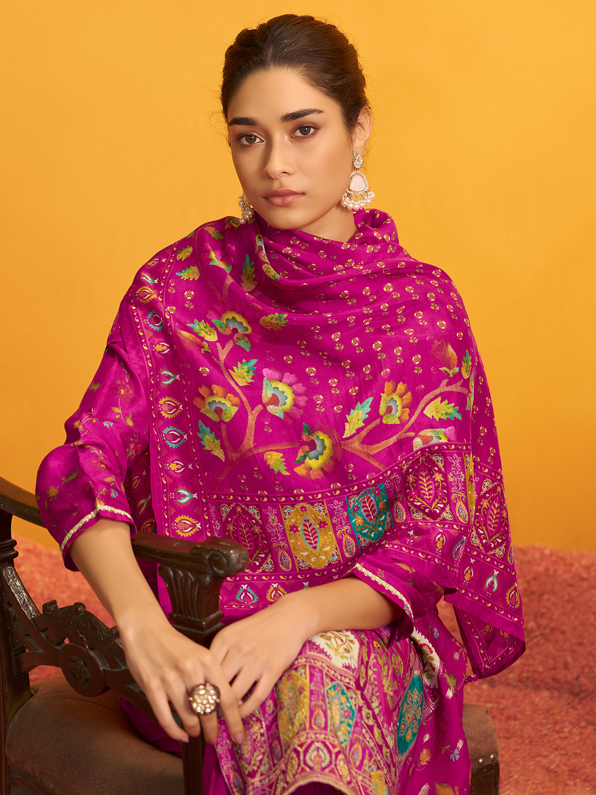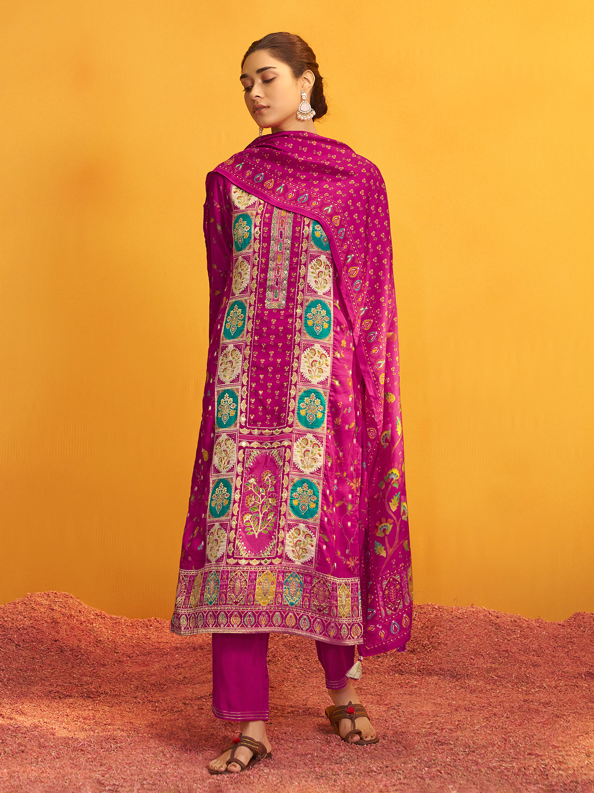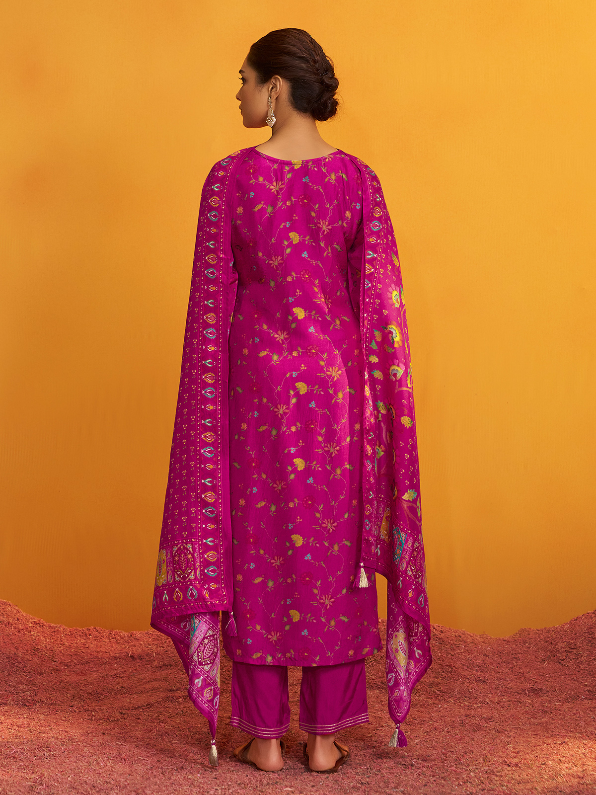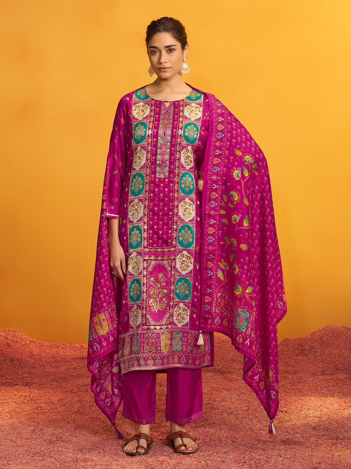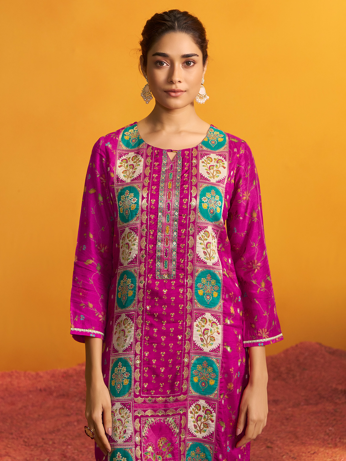 Radiant in rani pink silk, this kurti set gleams with colorful motifs accentuated by cutdana, sequins, beads, and zari. Styled with a sweetheart neckline, quarter sleeves, pant, and dupatta, it creates a vibrant festive outfit full of charm.