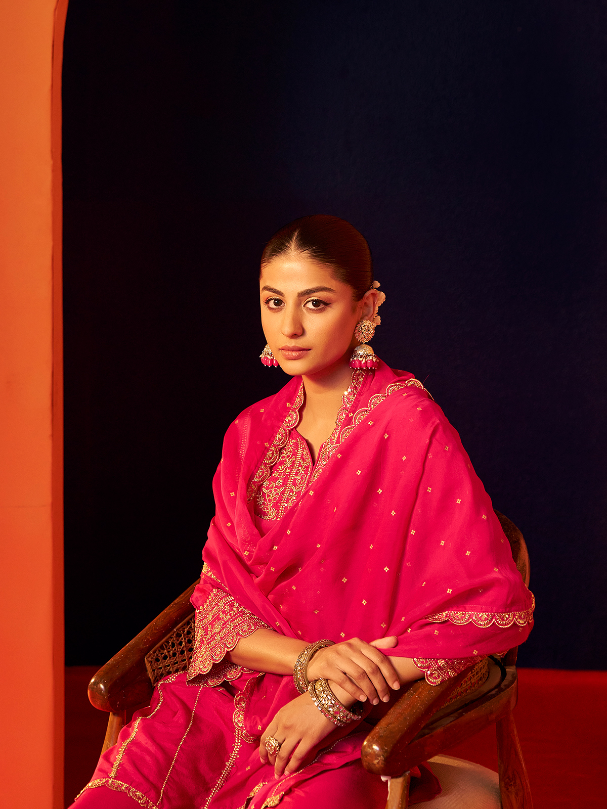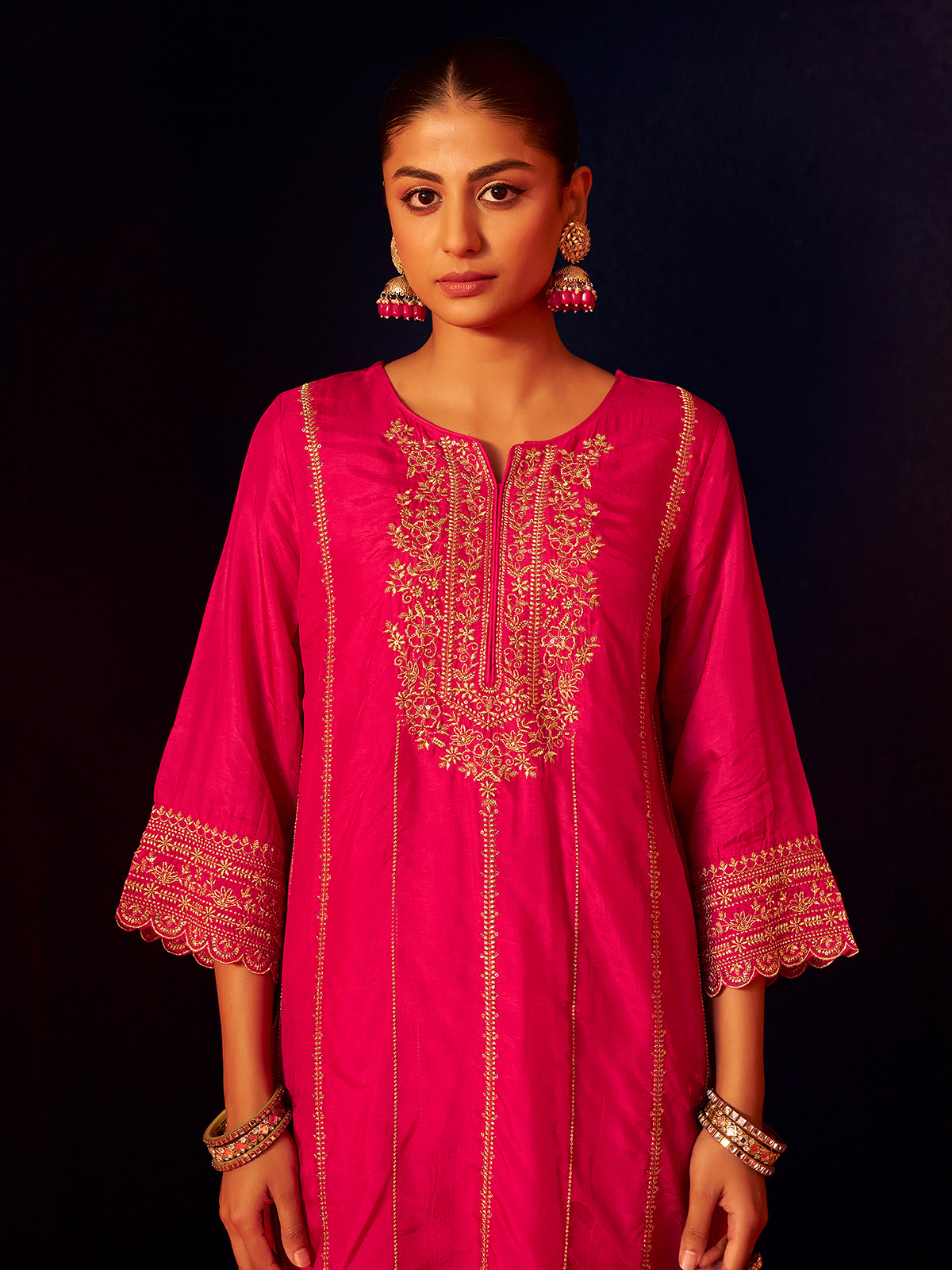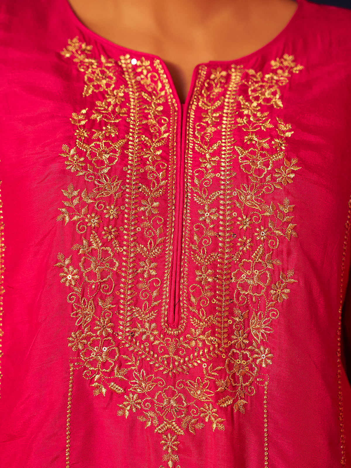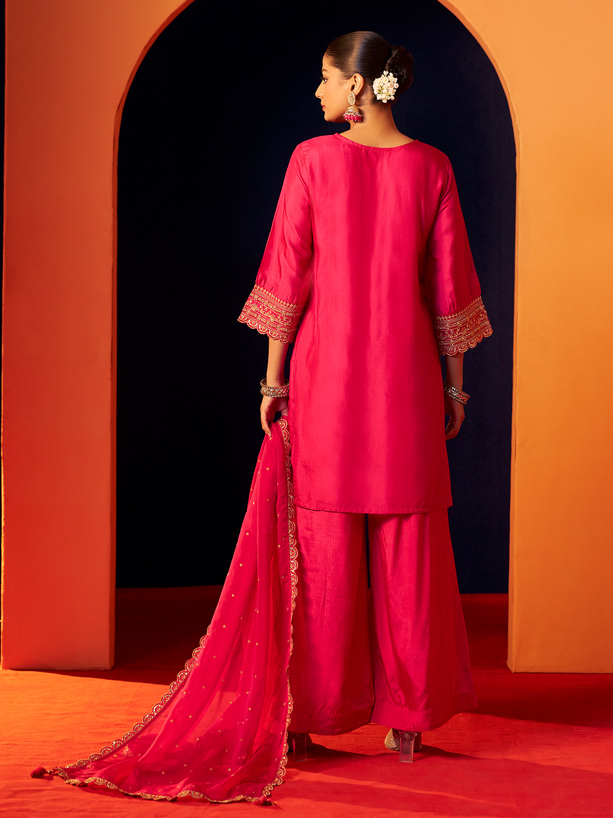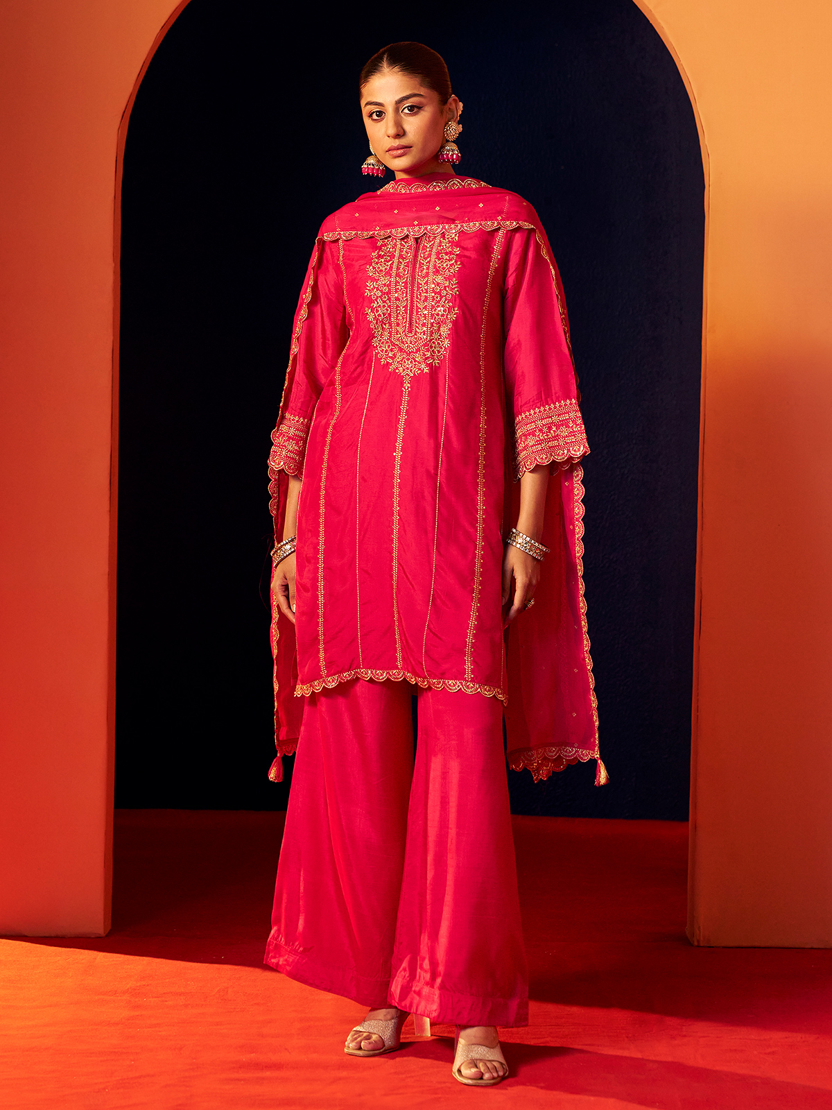 Rani pink silk brings festive radiance to this kurti set, styled with quarter sleeves for refined elegance. Adorned with resham and sequins, the ensemble gleams like a joyous celebration of color and craft. Paired with wide palazzo pants and a soft dupatta, it embodies grace, vibrance, and timeless artistry with poetic charm.