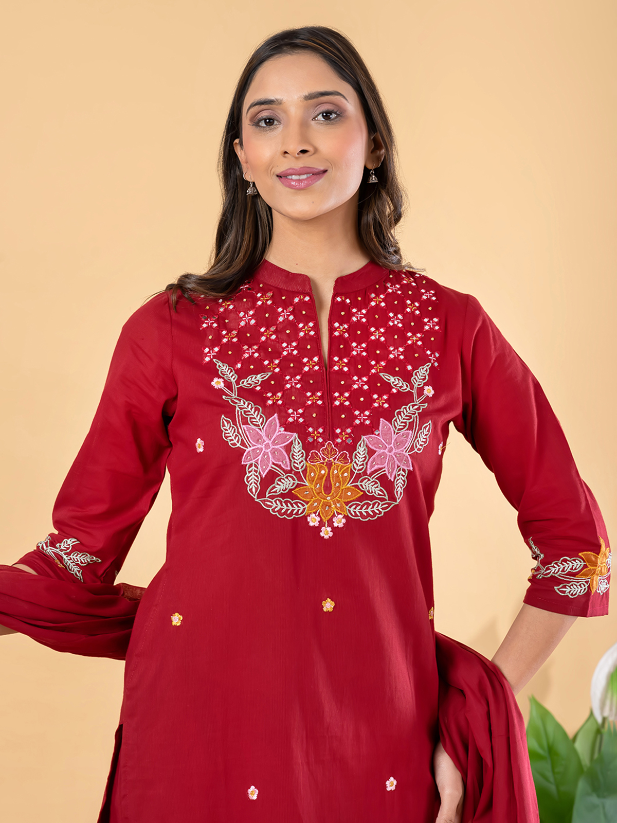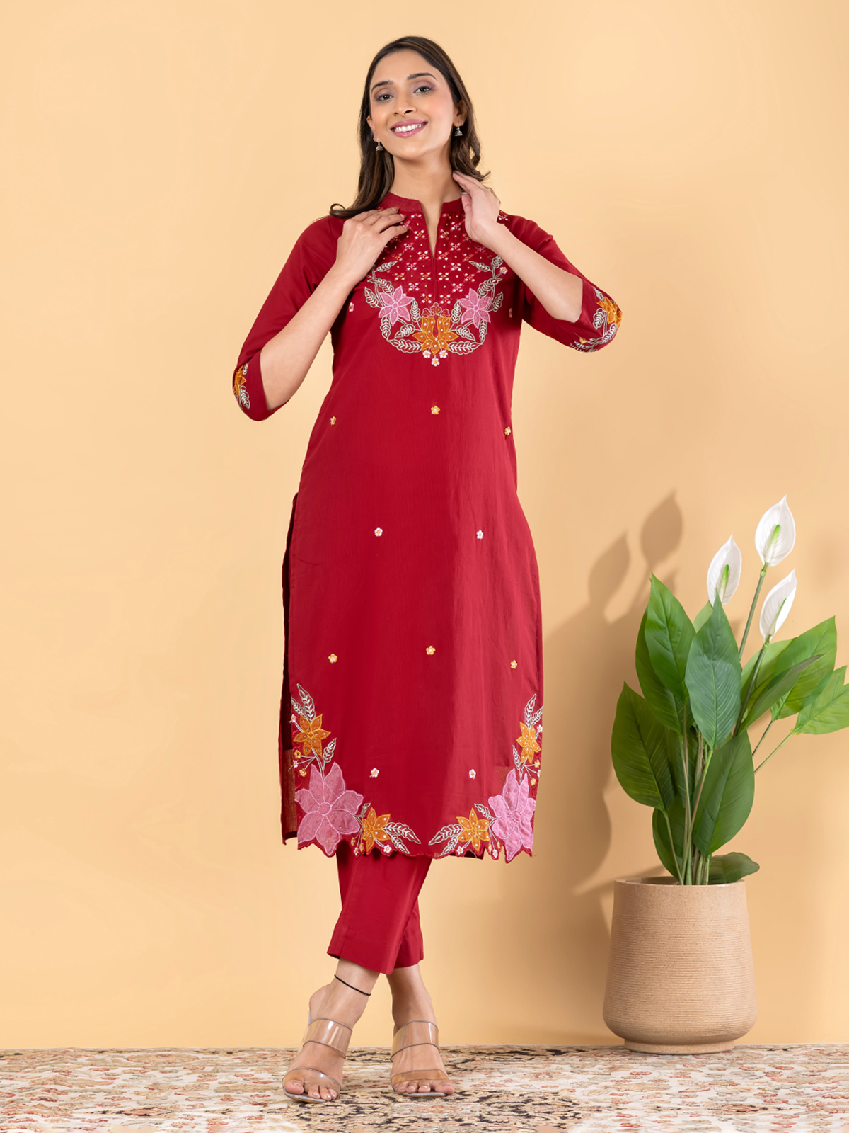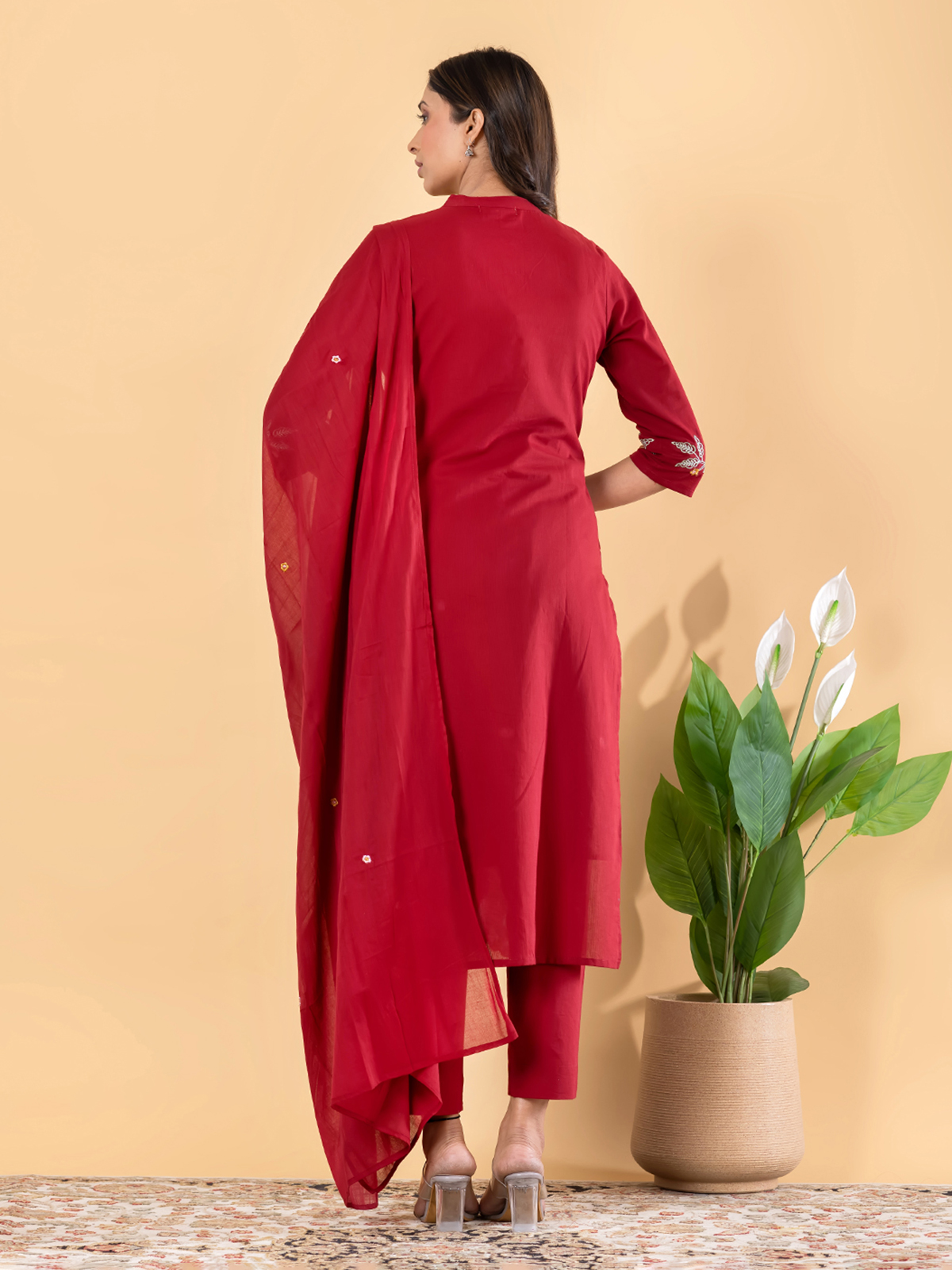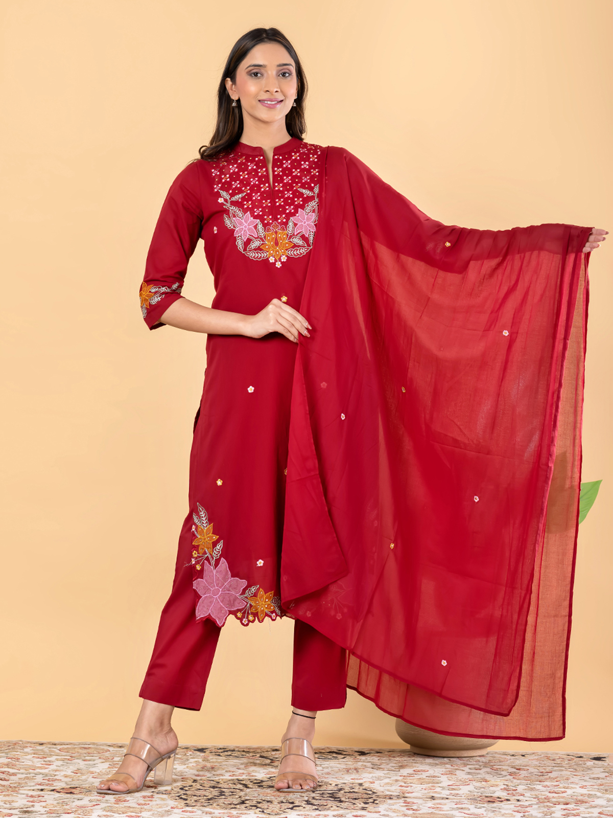 Bold and captivating, this red straight-cut suit set features intricate cutdana accents, mirror-inspired highlights, and ornate embellishments. Paired with coordinated bottoms and a complementing dupatta, it creates a striking festive statement. Crafted in smooth cotton silk, this ensemble is perfect for grand celebrations and joyful traditional gatherings.