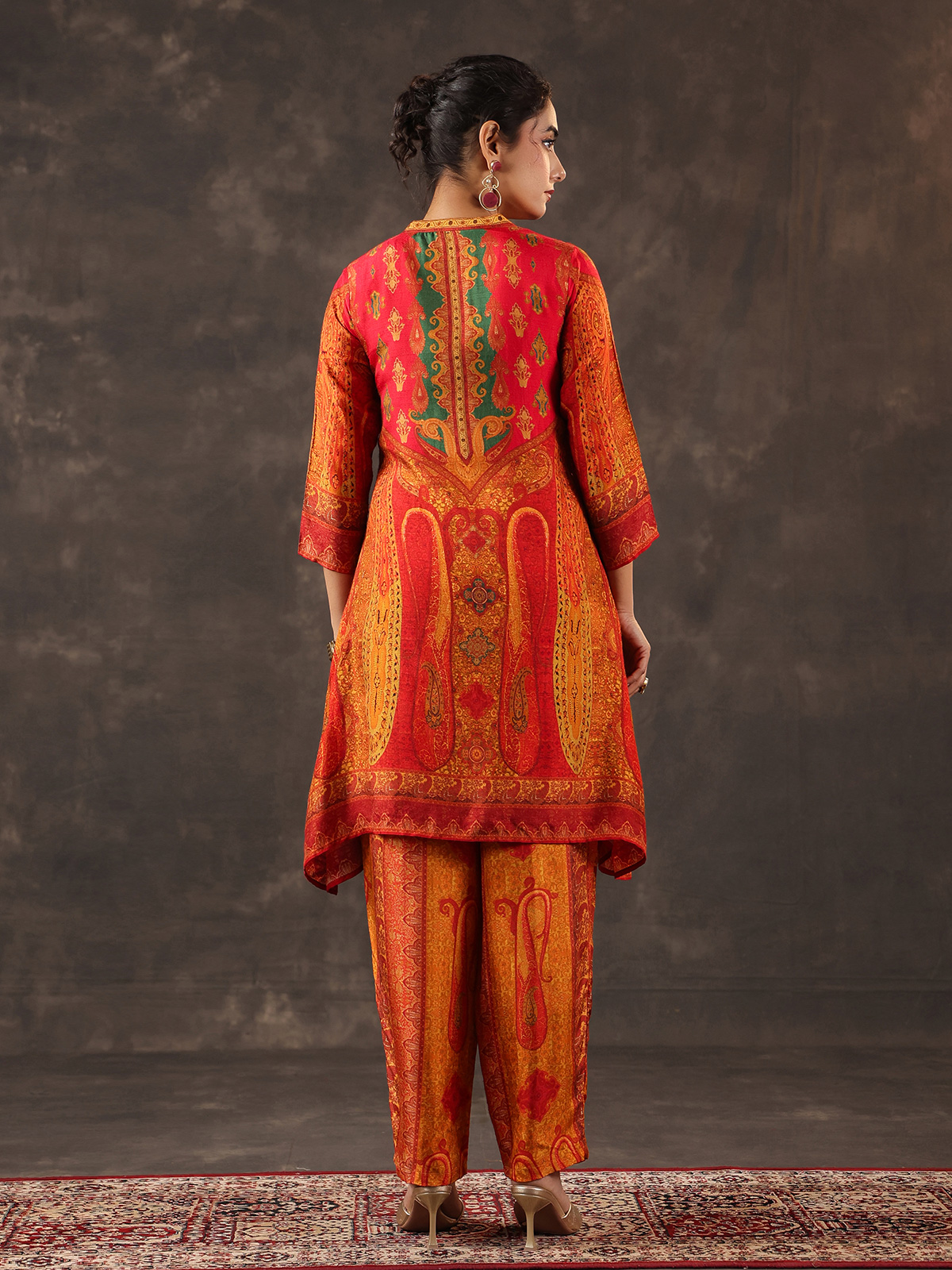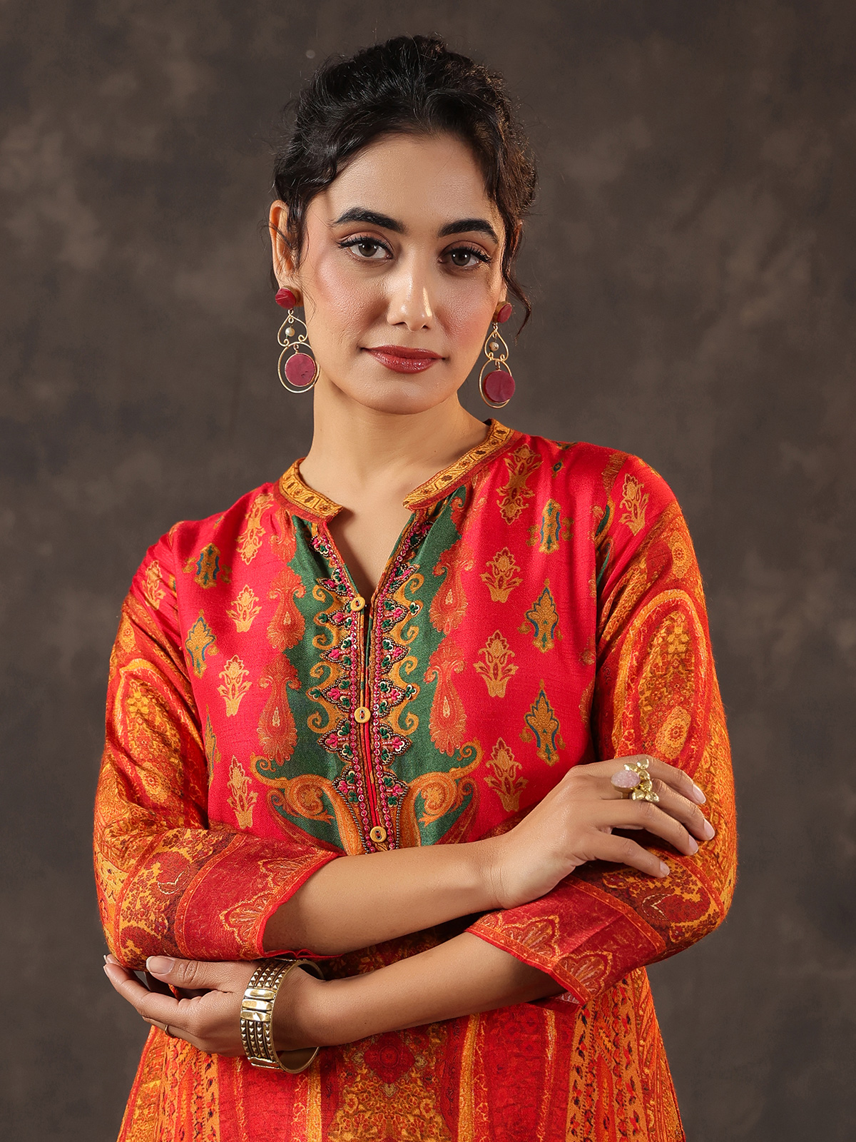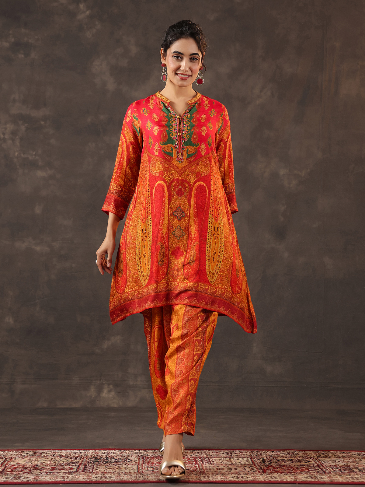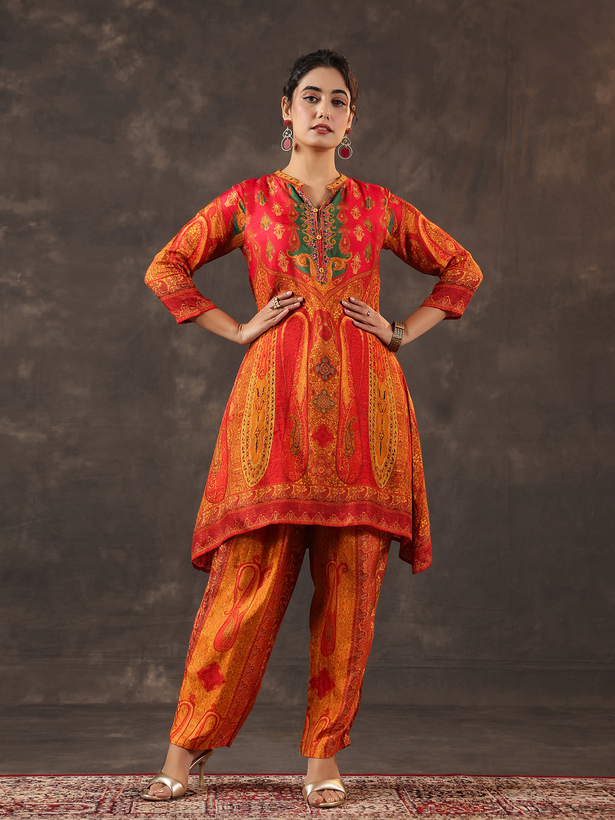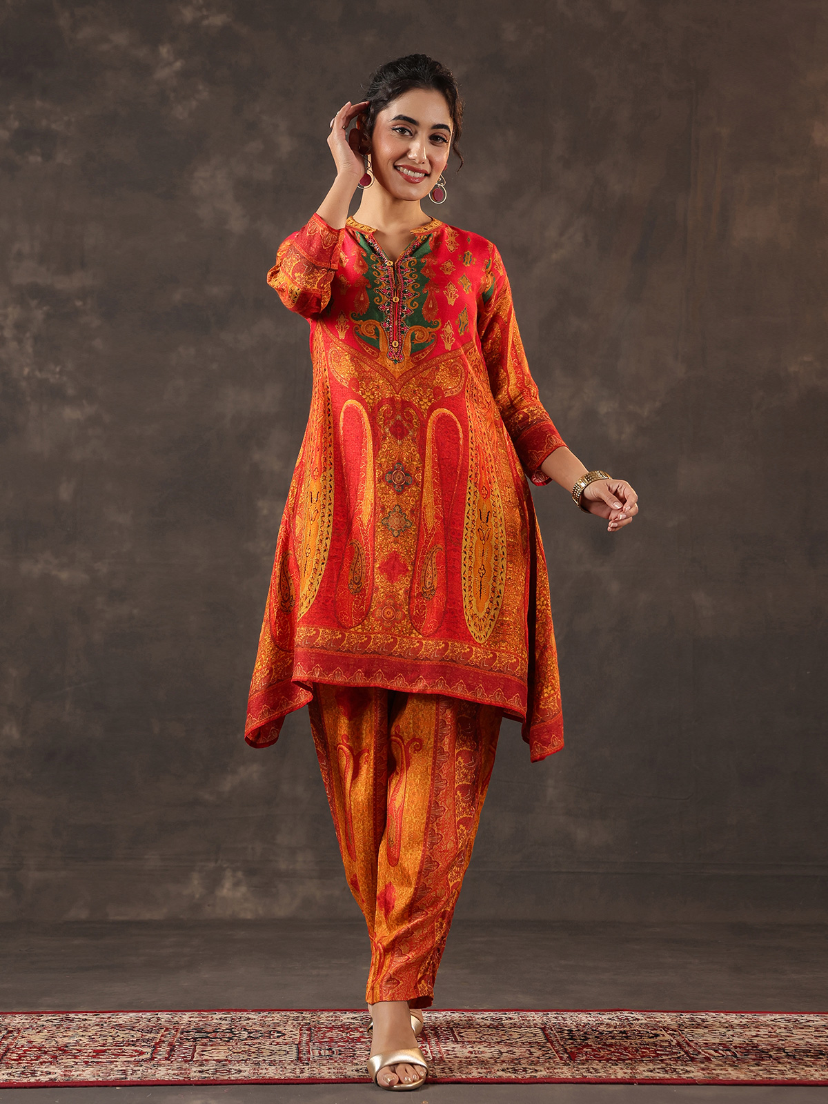 Vibrant and elegant red dola silk kurti set reflects timeless ethnic beauty. The printed A line kurti features a refined stand collar and quarter sleeves, highlighted with delicate thread, sequins and bead detailing that adds gentle shimmer. Paired with tailored pants. The ensemble forms a graceful silhouette ideal for casual festivities and joyful celebrations.