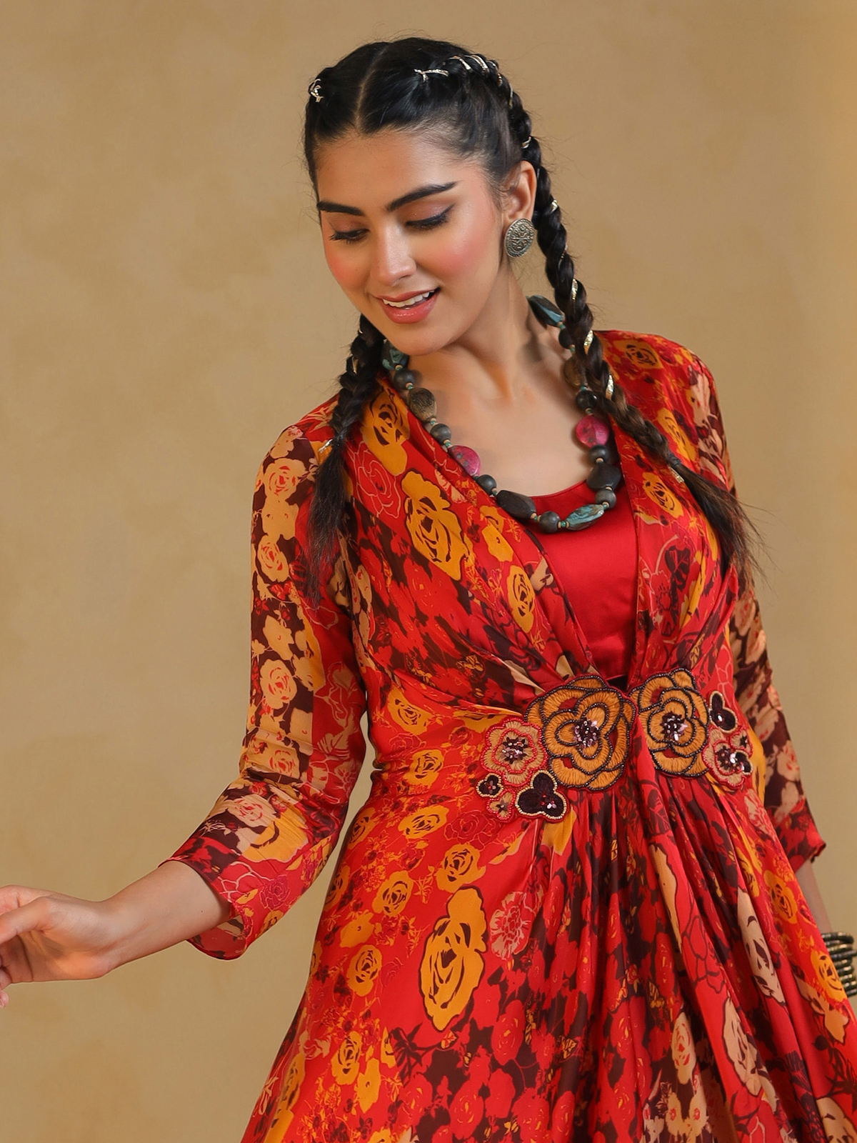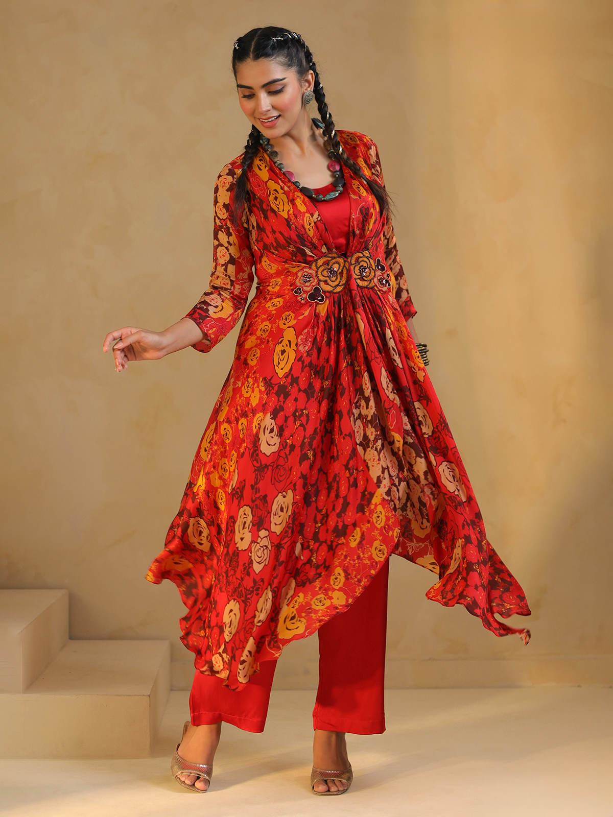 A red silk printed kurti enriched with beads, sequins, and thread work radiates festive allure. Styled with quarter sleeves and pants, it captures vibrant artistry with graceful sophistication, making it perfect for cultural celebrations.