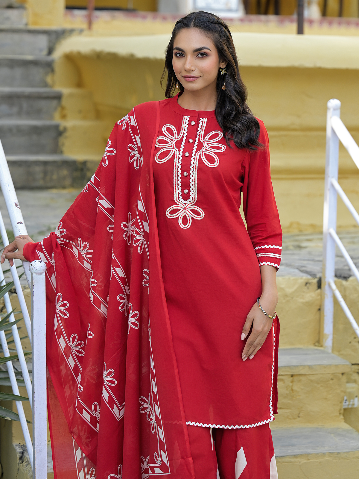 Add festive charm to your ethnic wardrobe with this radiant red cotton kurti set, crafted to enhance feminine grace. The kurti features a round neckline and quarter sleeves, highlighted with subtle thread detailing for a clean and elegant look. Perfect for festive wear, it is paired with a palazzo and a complementing printed dupatta.