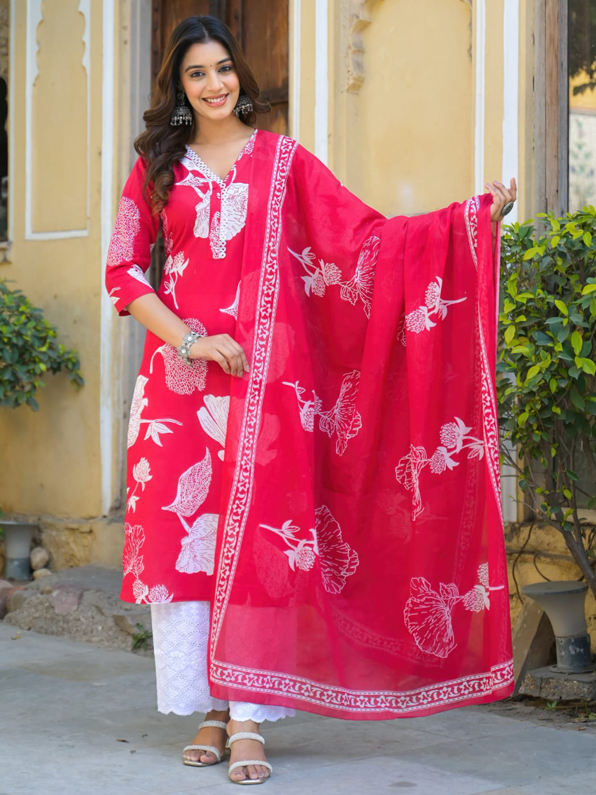 Rich red tones and exquisite cutdana detailing define the opulence of this cotton-cotton silk creation. The stylish V-neck and quarter-sleeve design exude timeless sophistication, while the pant and dupatta enhance the outfit's overall grace.